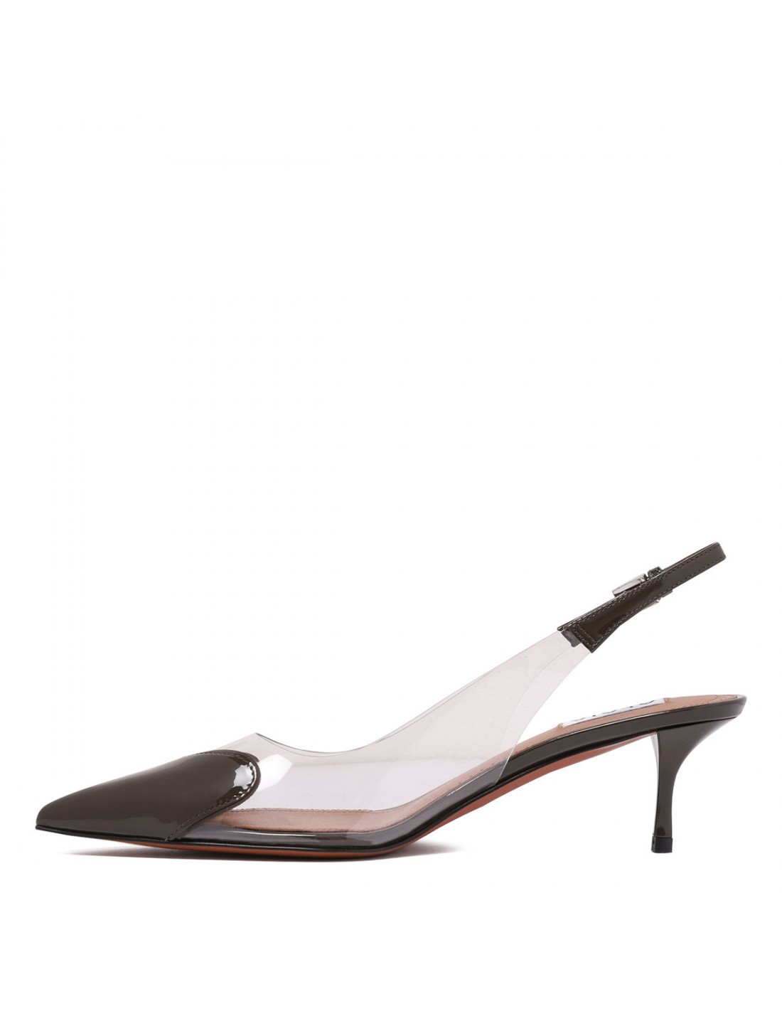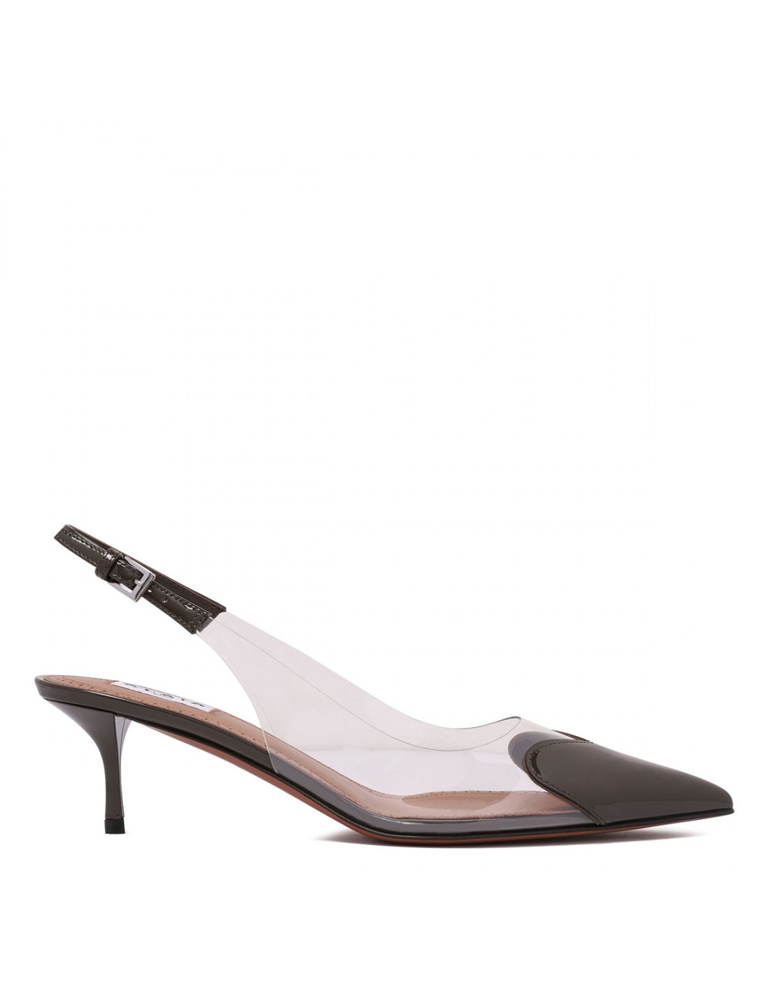 Le cœur slingback pumps from Alaia featuring clear PVC upper, black patent heart cut at front of the shoe, slingback strap with buckle closure, pointed toe, 55 stiletto heel, leather insole and sole.