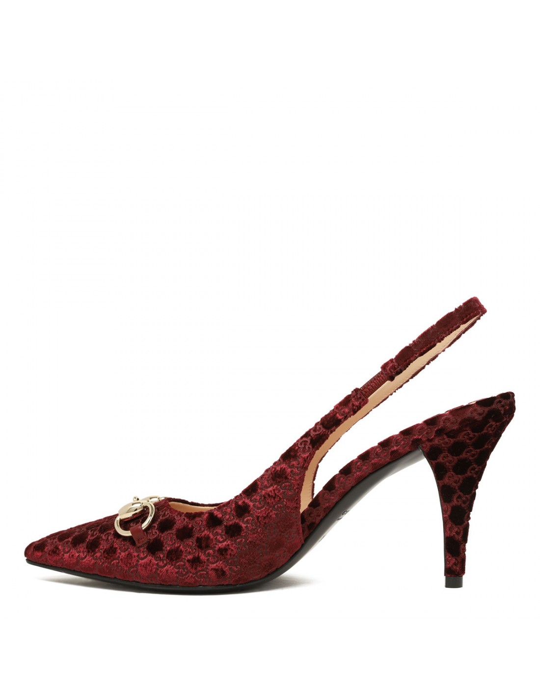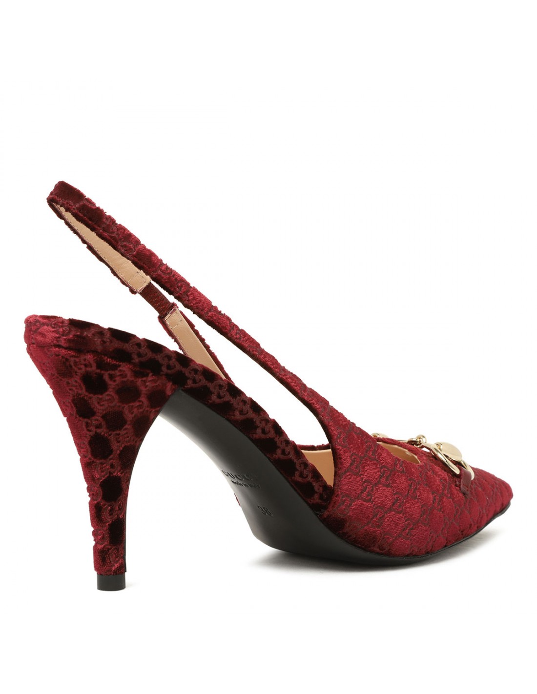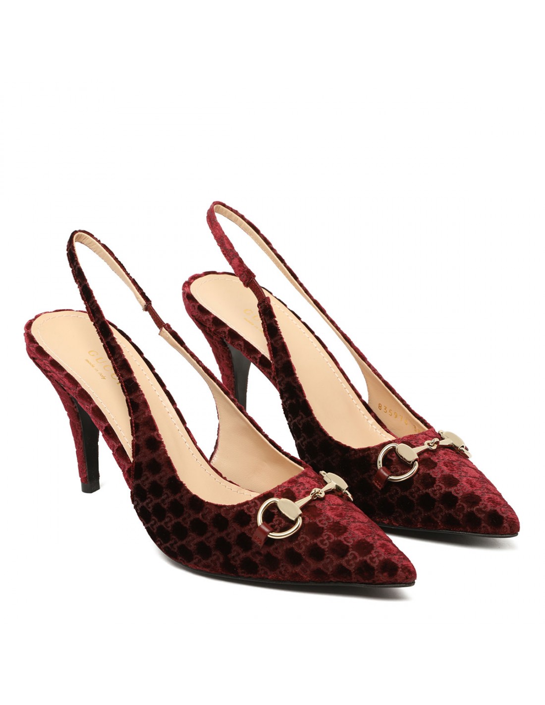 Bordeaux velvet slingback pumps from Gucci featuring GG motif allover, light gold-toned Horsebit, adjustable slingback strap with buckle fastening, 85 heel, leather insole and sole.