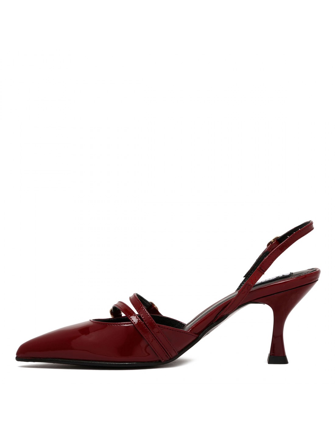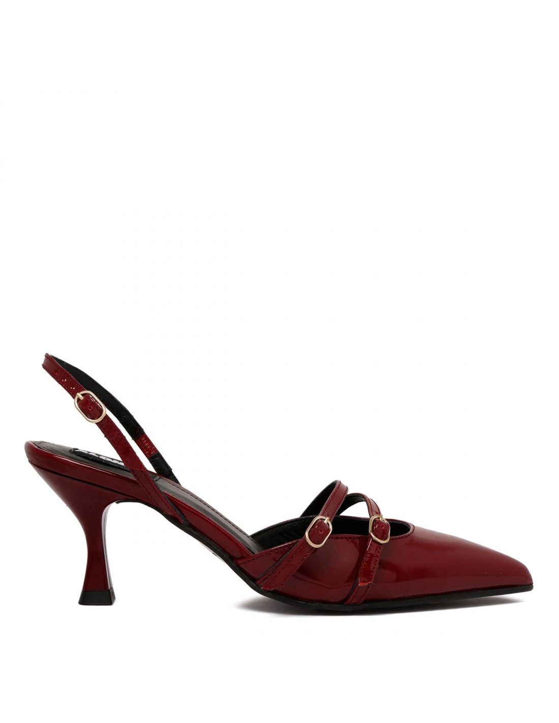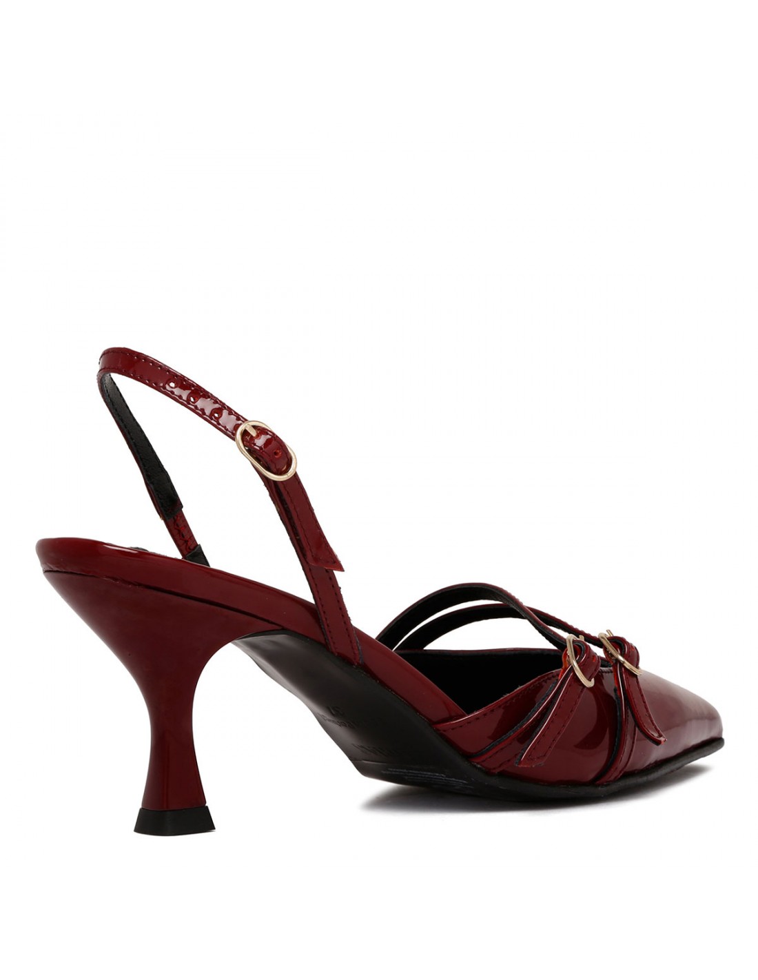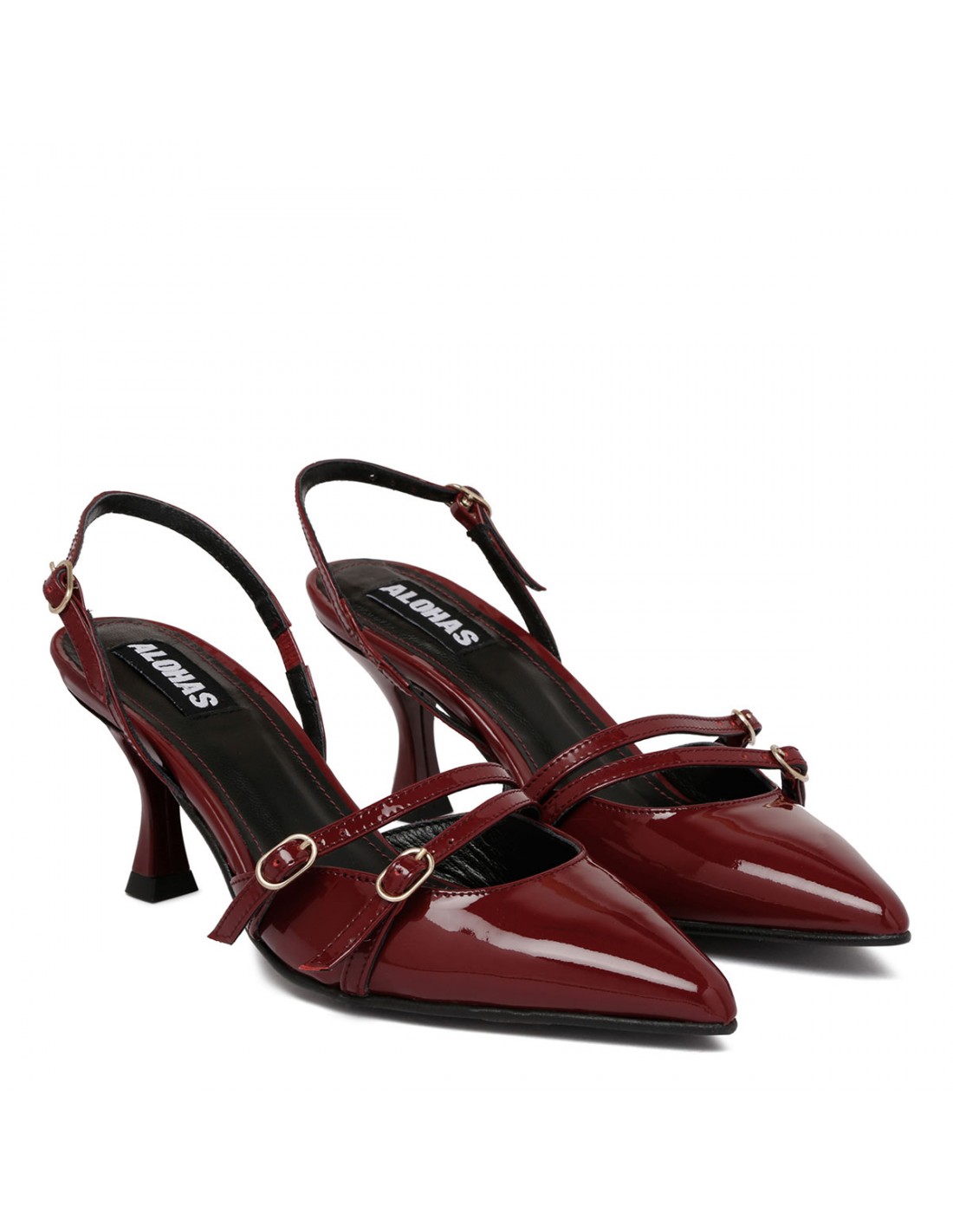 Burgundy patent leather Joelle Onyx pumps from Alohas featuring slim straps with gold buckles across the vamp, pointed toe, slingback strap with buckle closure, slender heel, leather insole and sole.