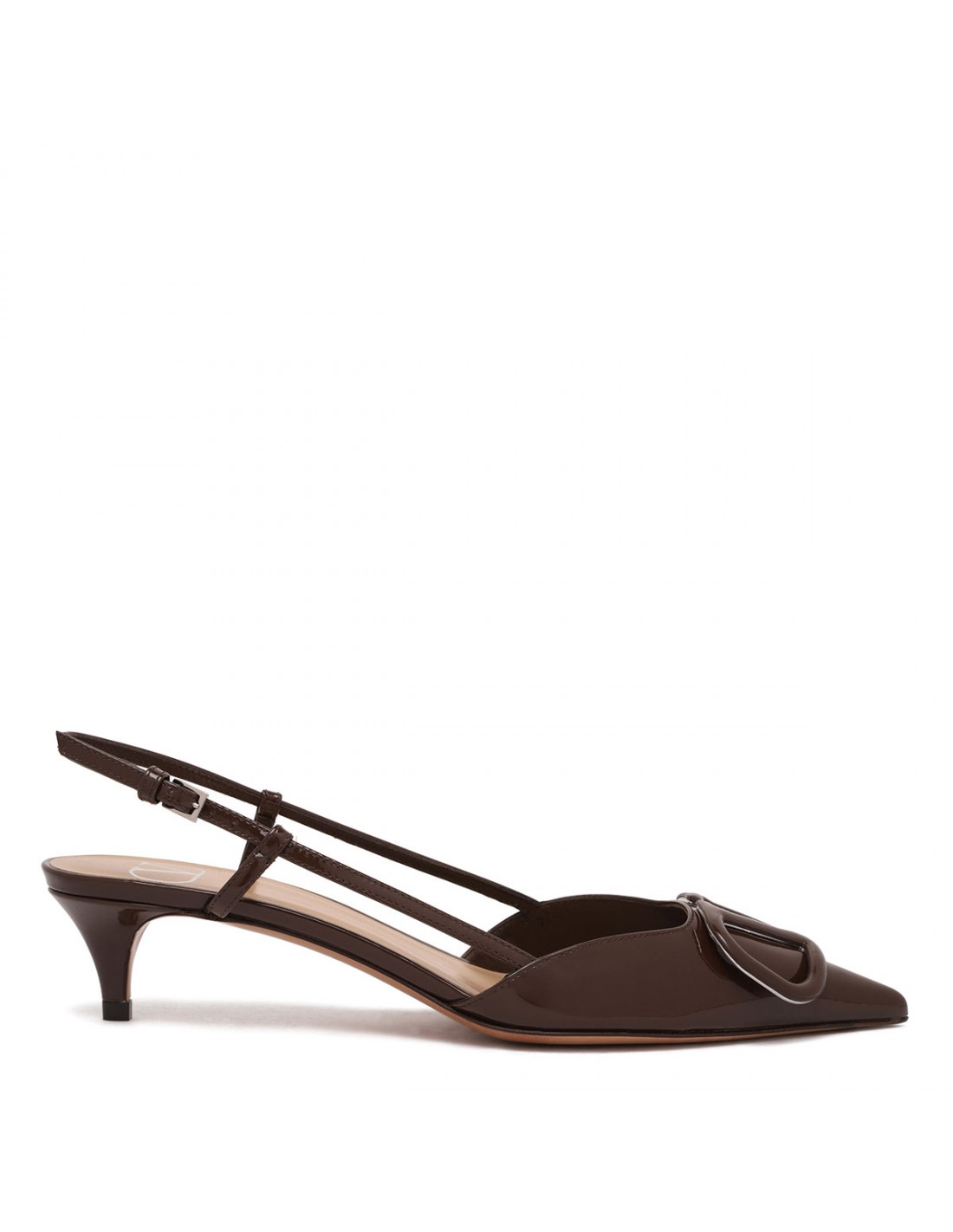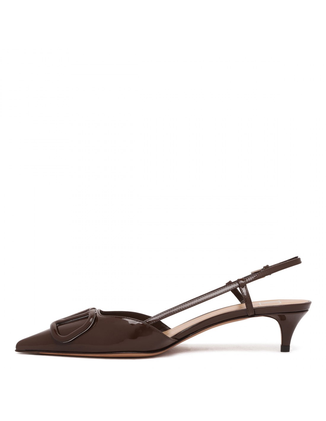 Brown patent leather Vlogo Signature slingback pumps from Valentino Garavani featuring VLogo Signature detail covered in patent leather, adjustable slingback strap with buckle closure, pointed toe, kitten heel, leather insole and sole.