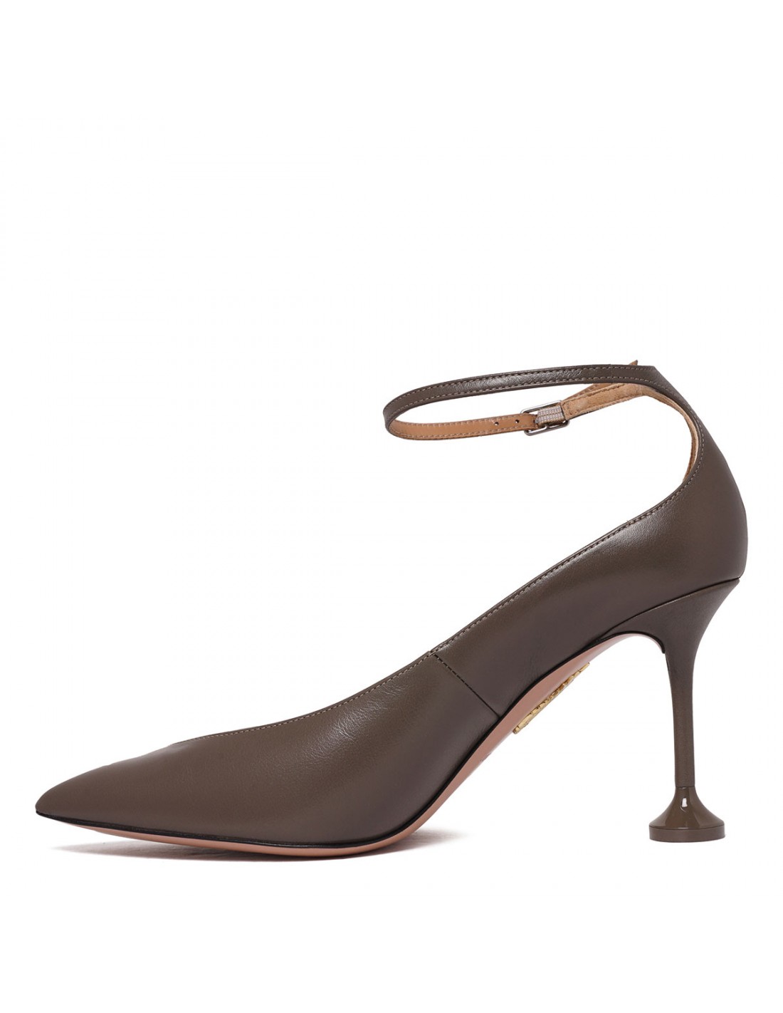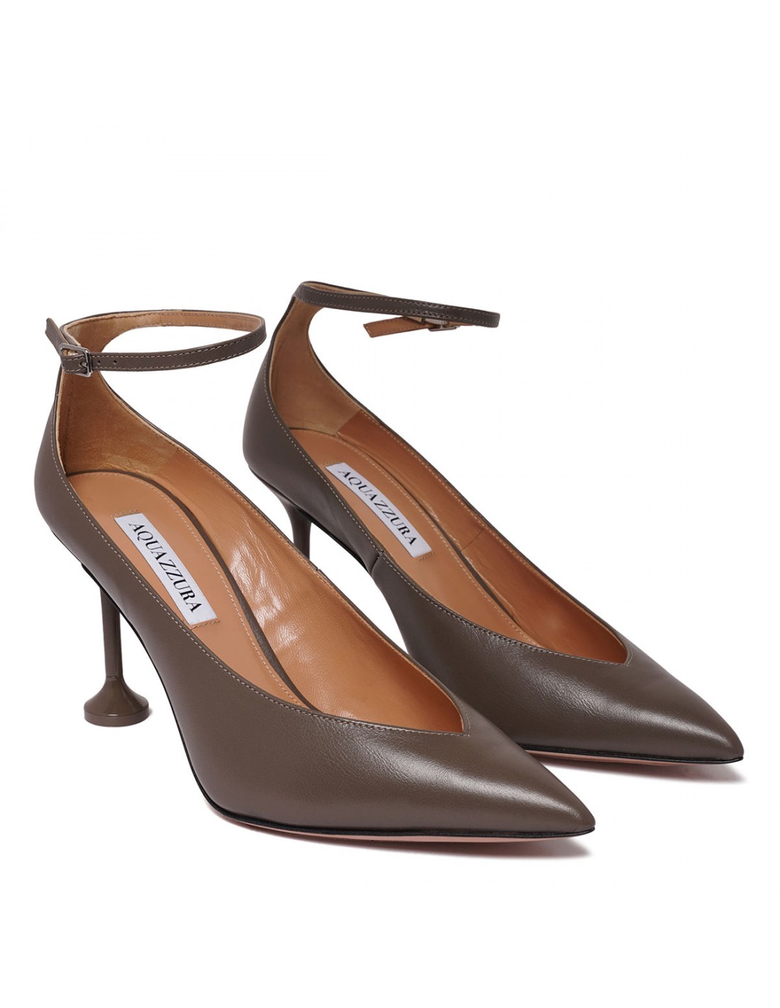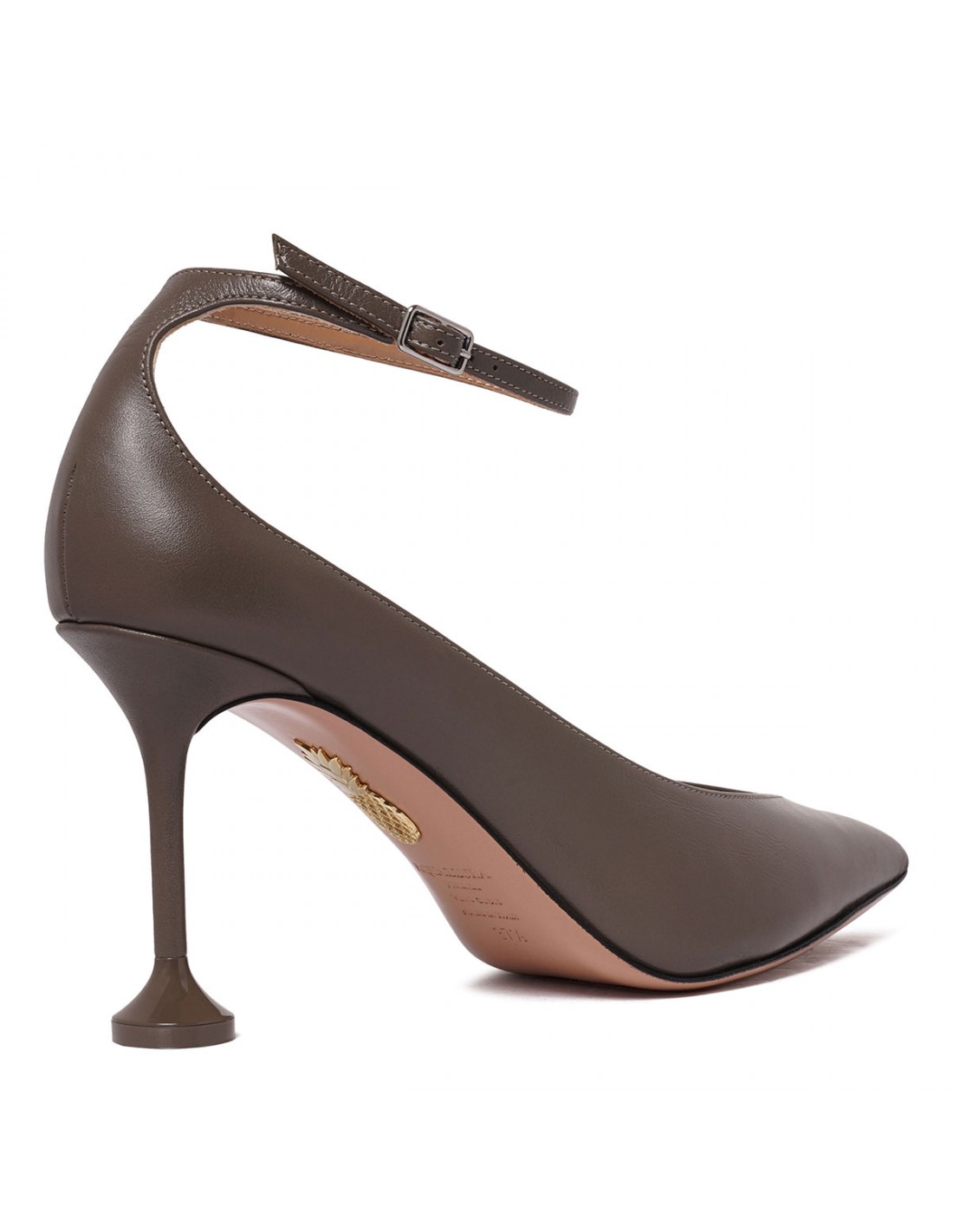 Mud hue glossy nappa leather Strong pumps from Aquazzura featuring buckle fastening ankle strap, pointed toe, deep vamp, sculptural 85 heel, leather sole with pineapple logo appliqué.