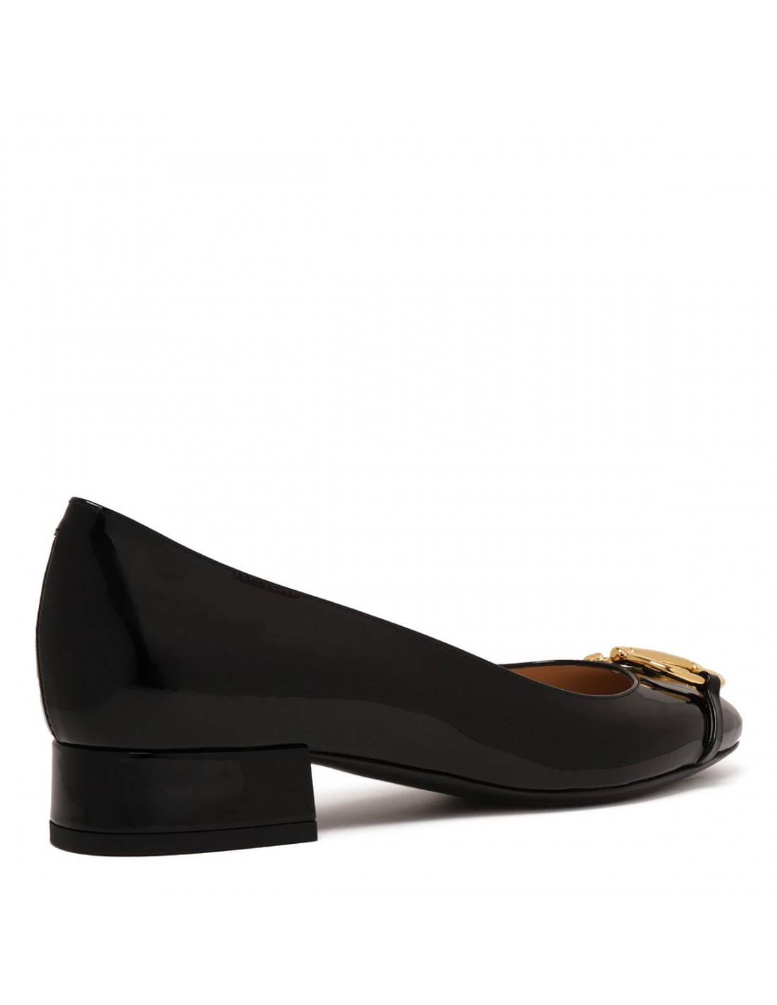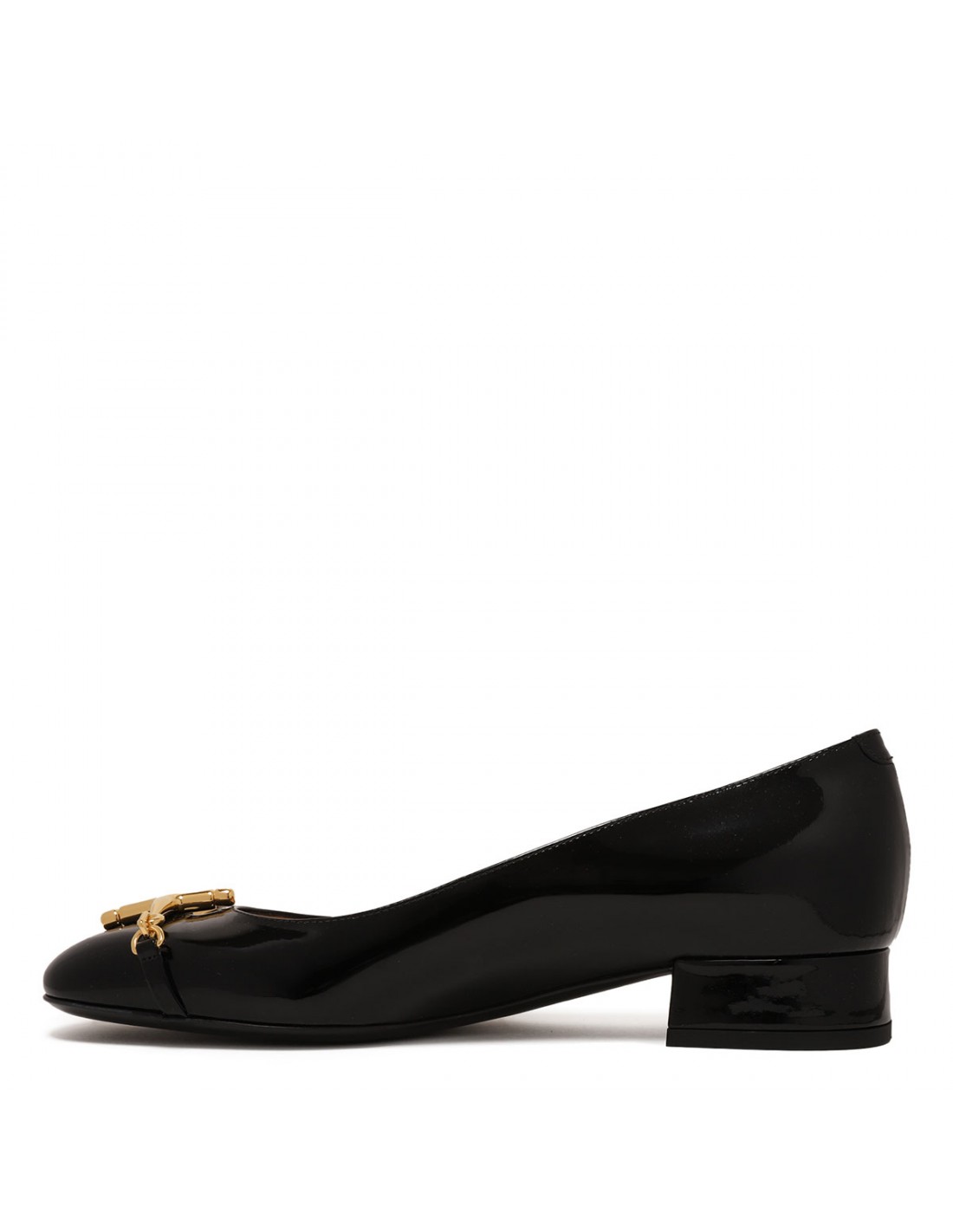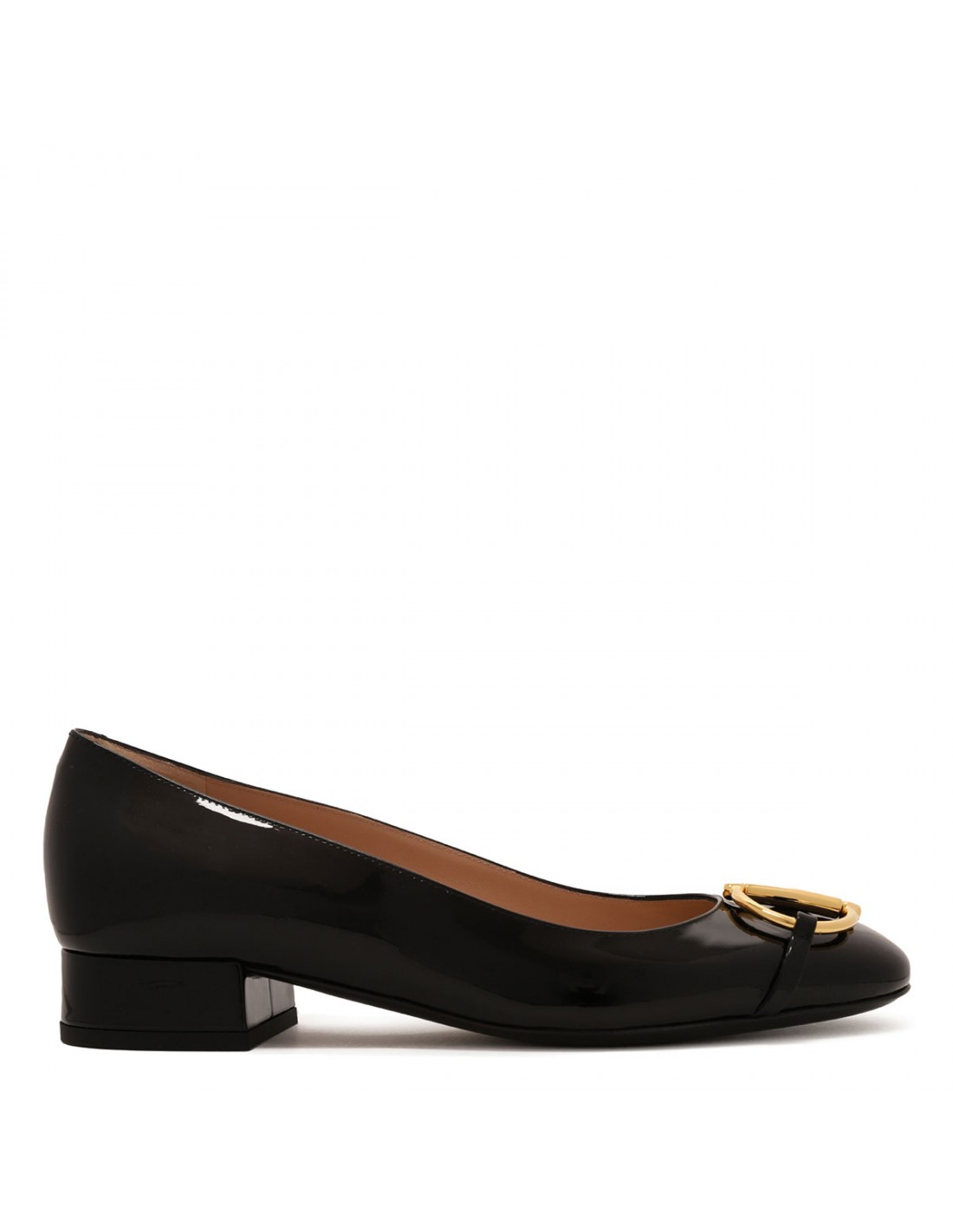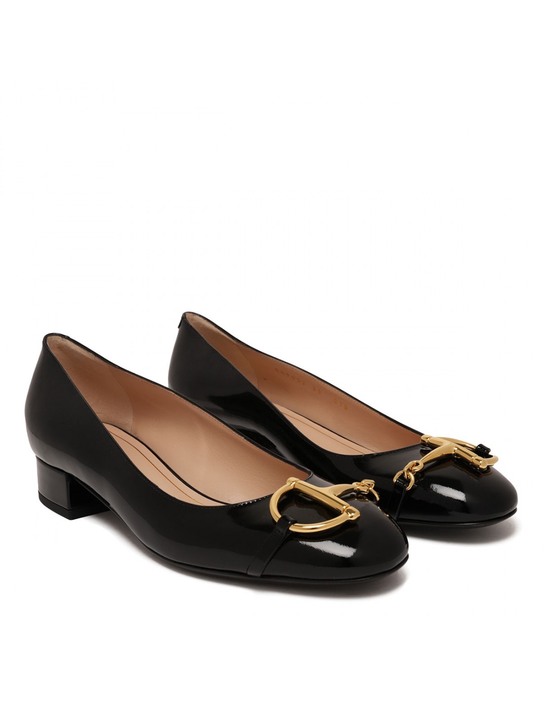 Black patent leather pumps from Gucci featuring light gold-toned maxi half Horsebit and hardware, almond toe, low heel, leather insole and sole.