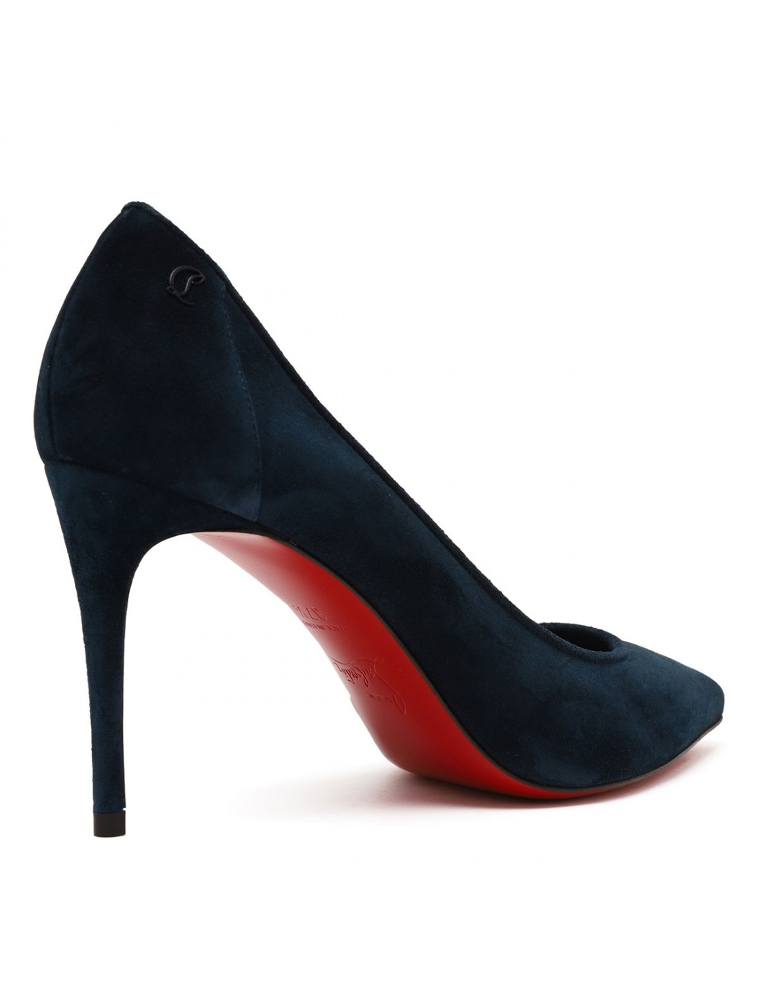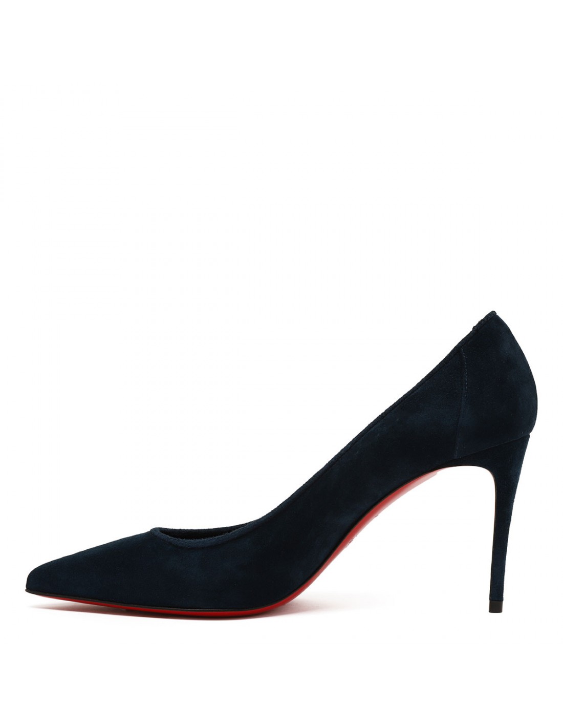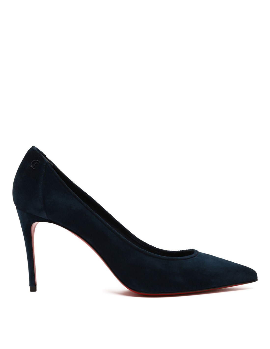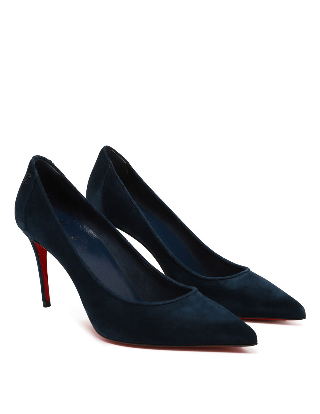 Midnight blue suede leather Sporty Kate pumps from Christian Louboutin featuring pointed toe, silver metal CL monogram logo appliqué, leather covered 85 stiletto heel, leather insole and signature red leather outsole.