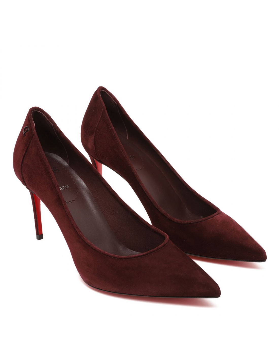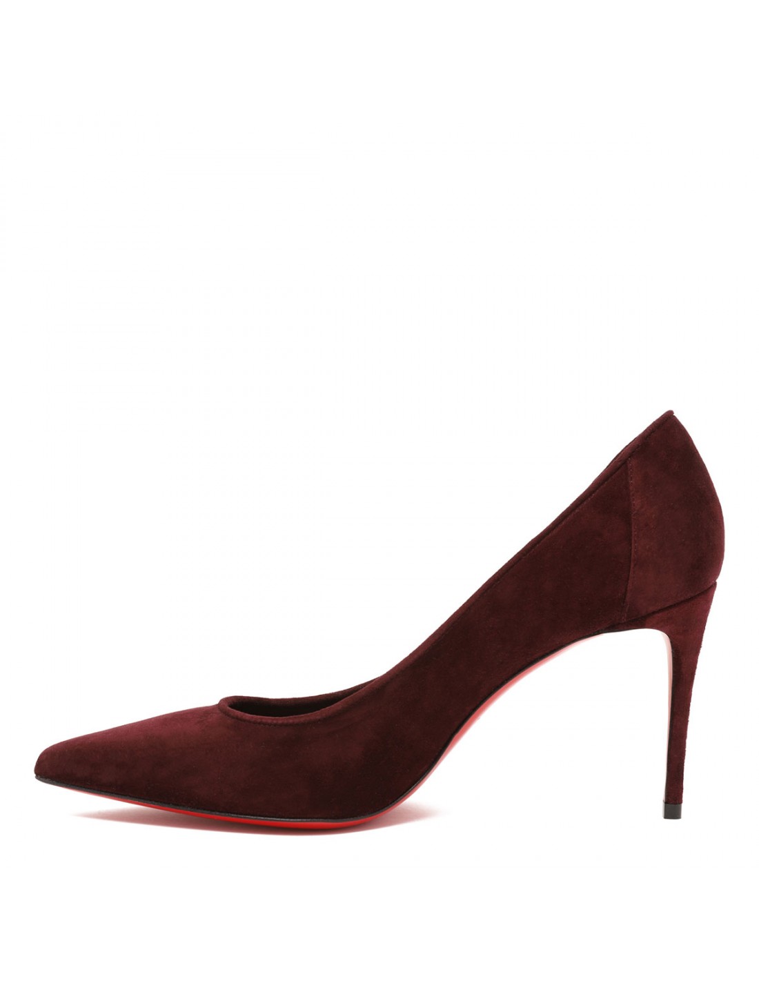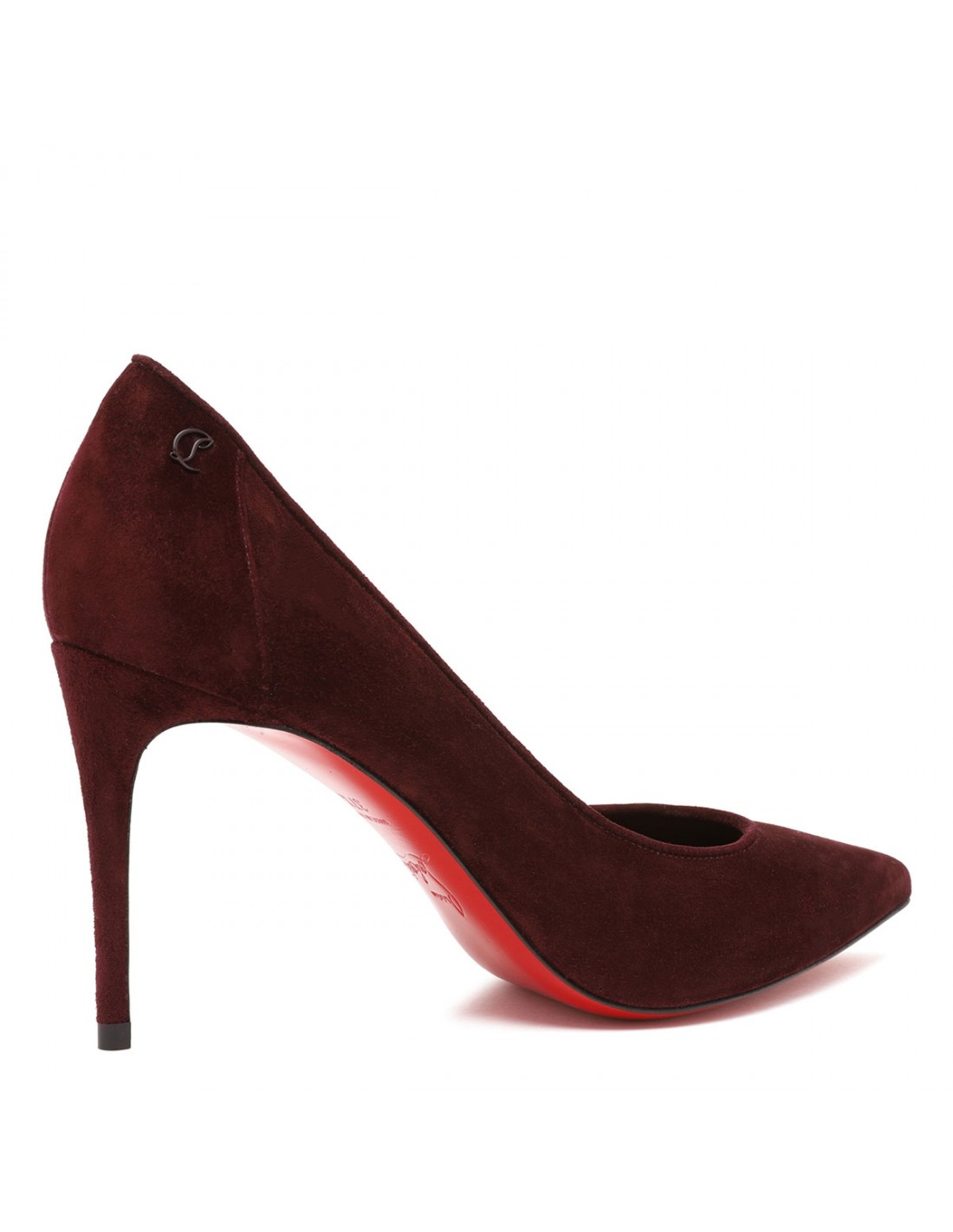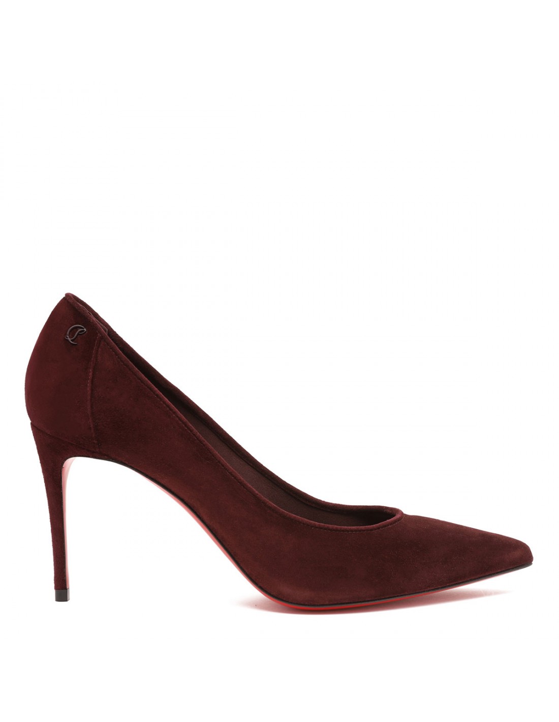 Dark bordeaux suede leather Sporty Kate pumps from Christian Louboutin featuring pointed toe, silver metal CL monogram logo appliqué, leather covered 85 stiletto heel, leather insole and signature red leather outsole.