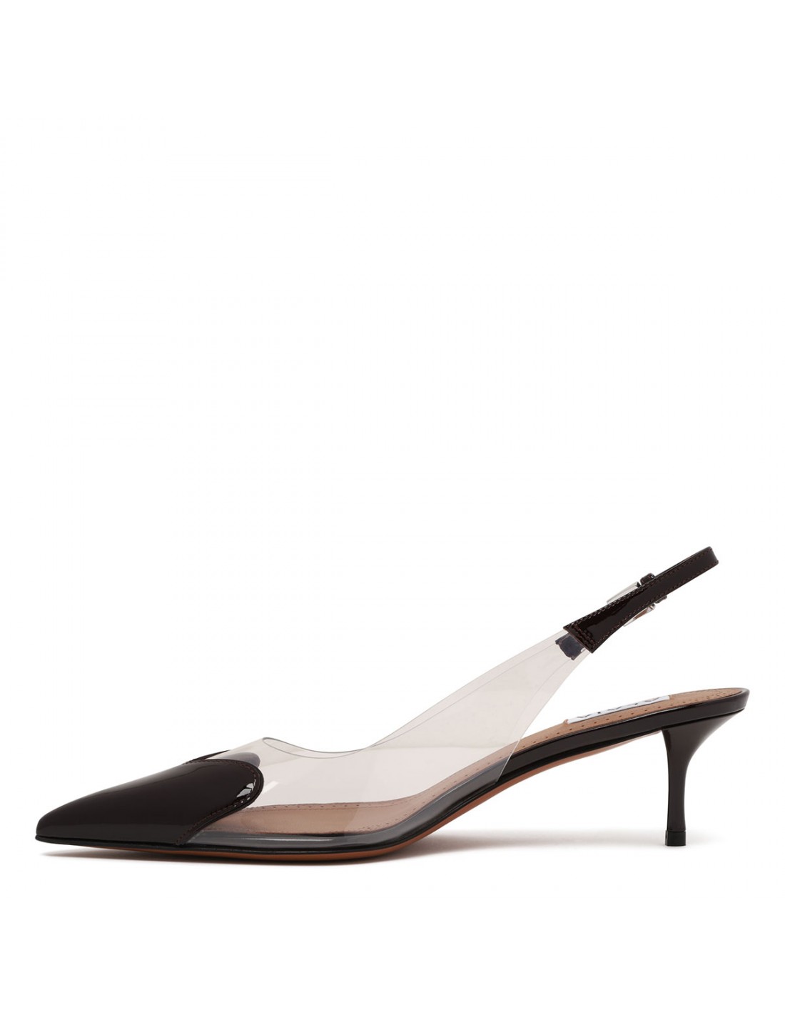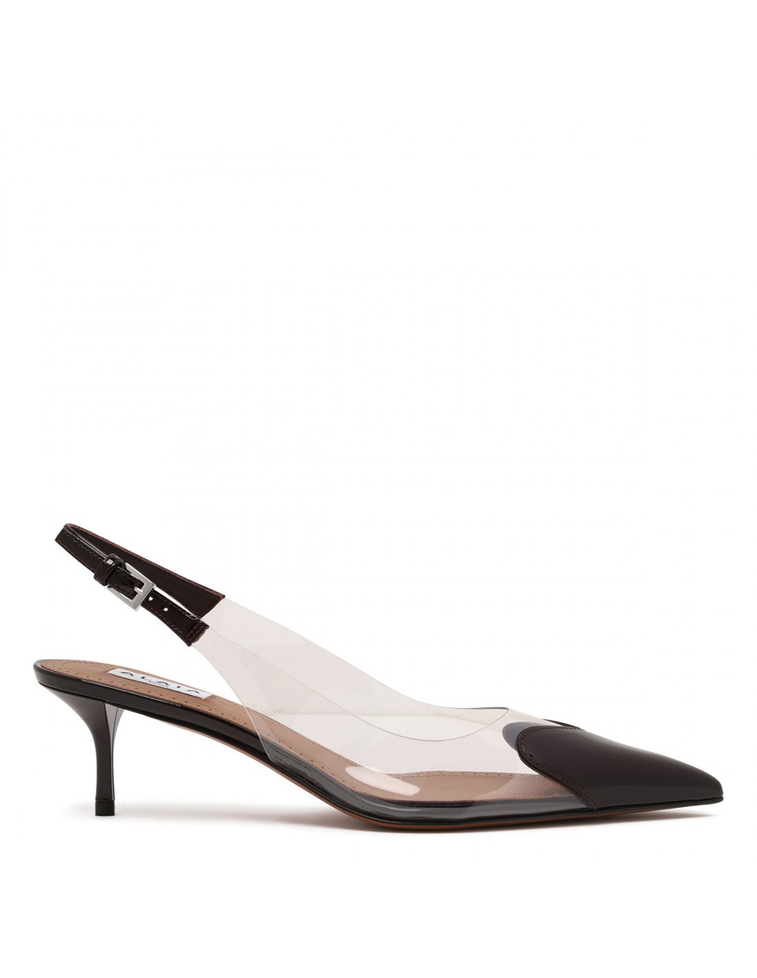 Black patent leather and clear PVC Le Cœur slingback pumps from Alaia featuring heart cut at front, pointed toe, slingback strap with buckle closure, 55 kitten heel, leather insole and sole.