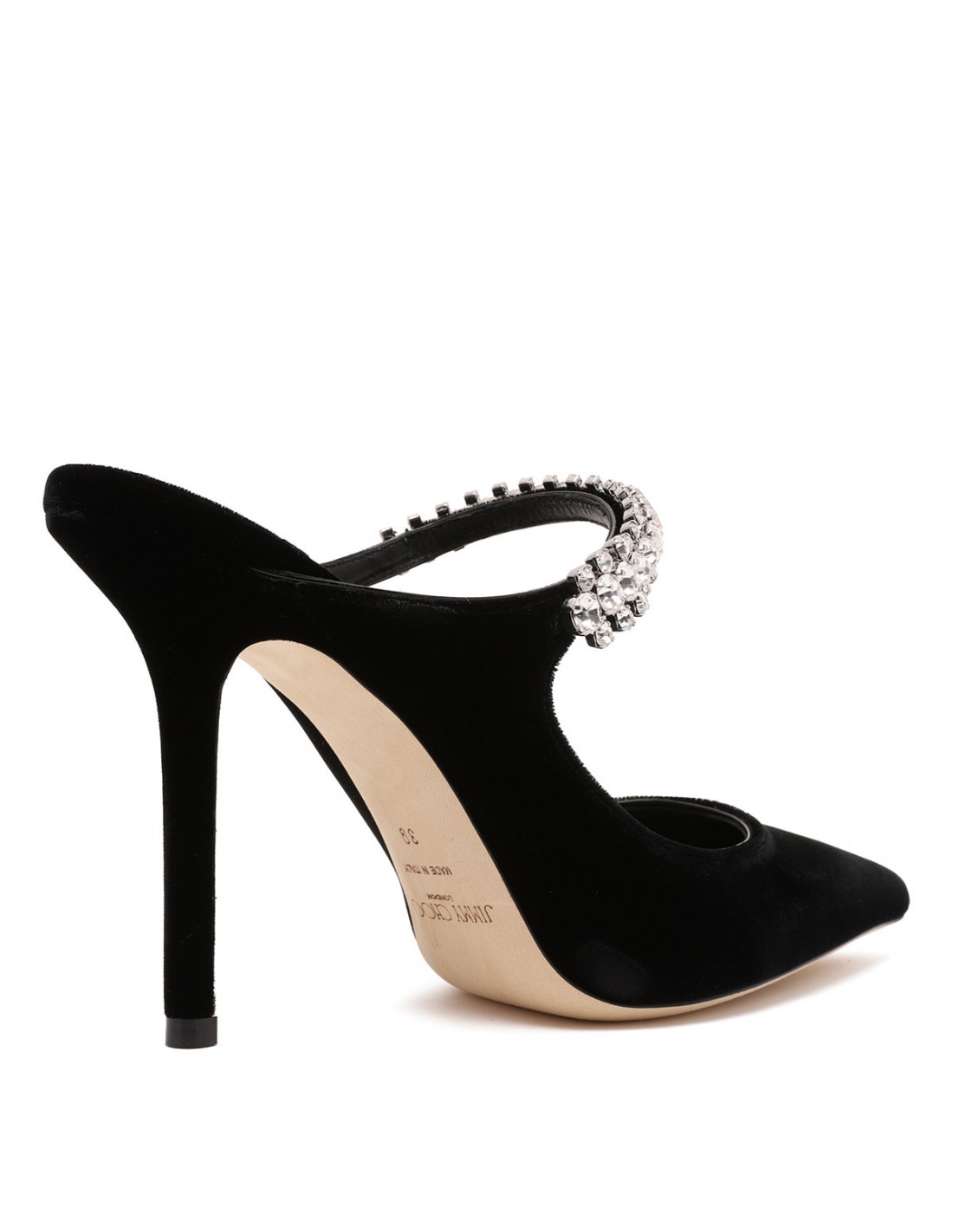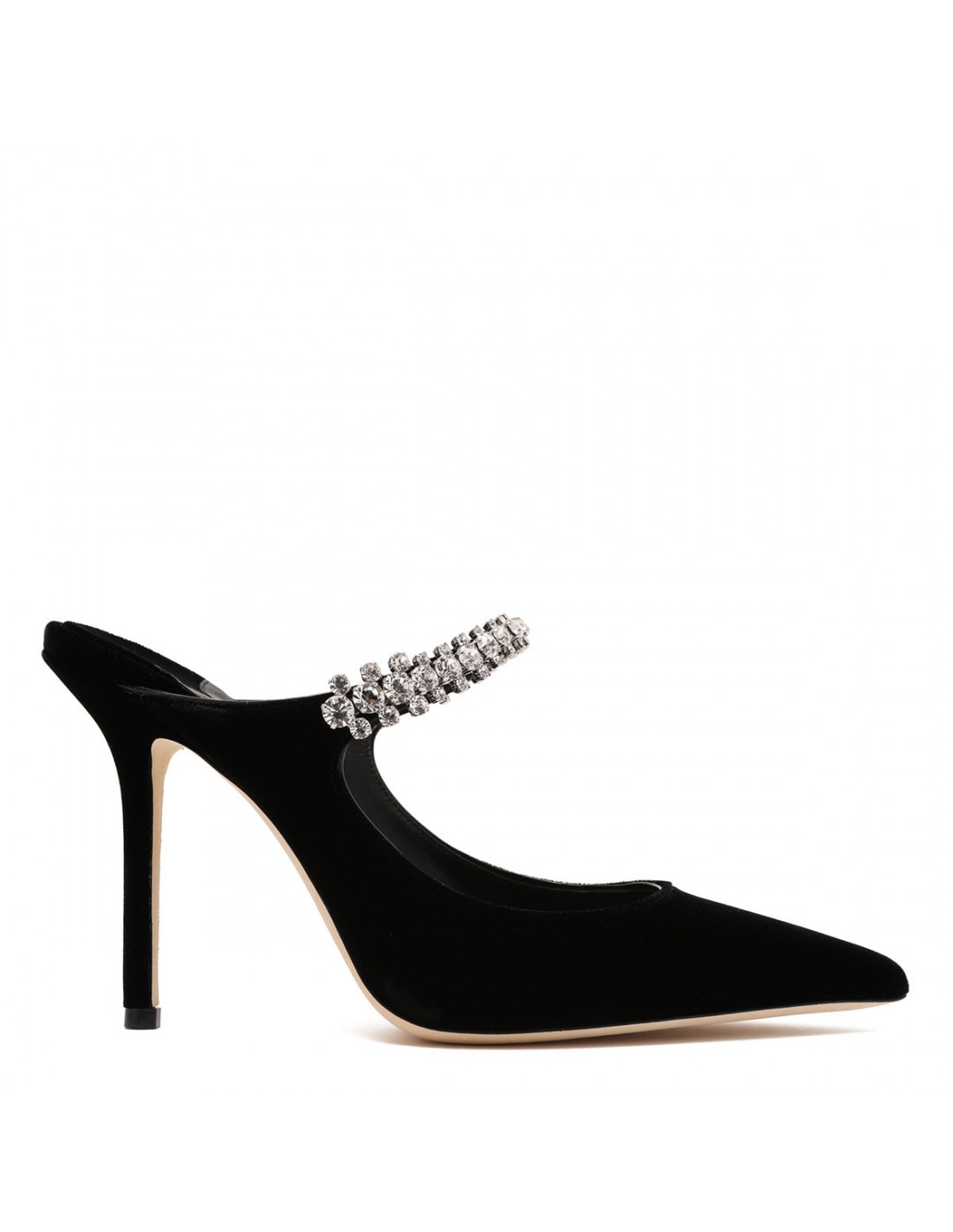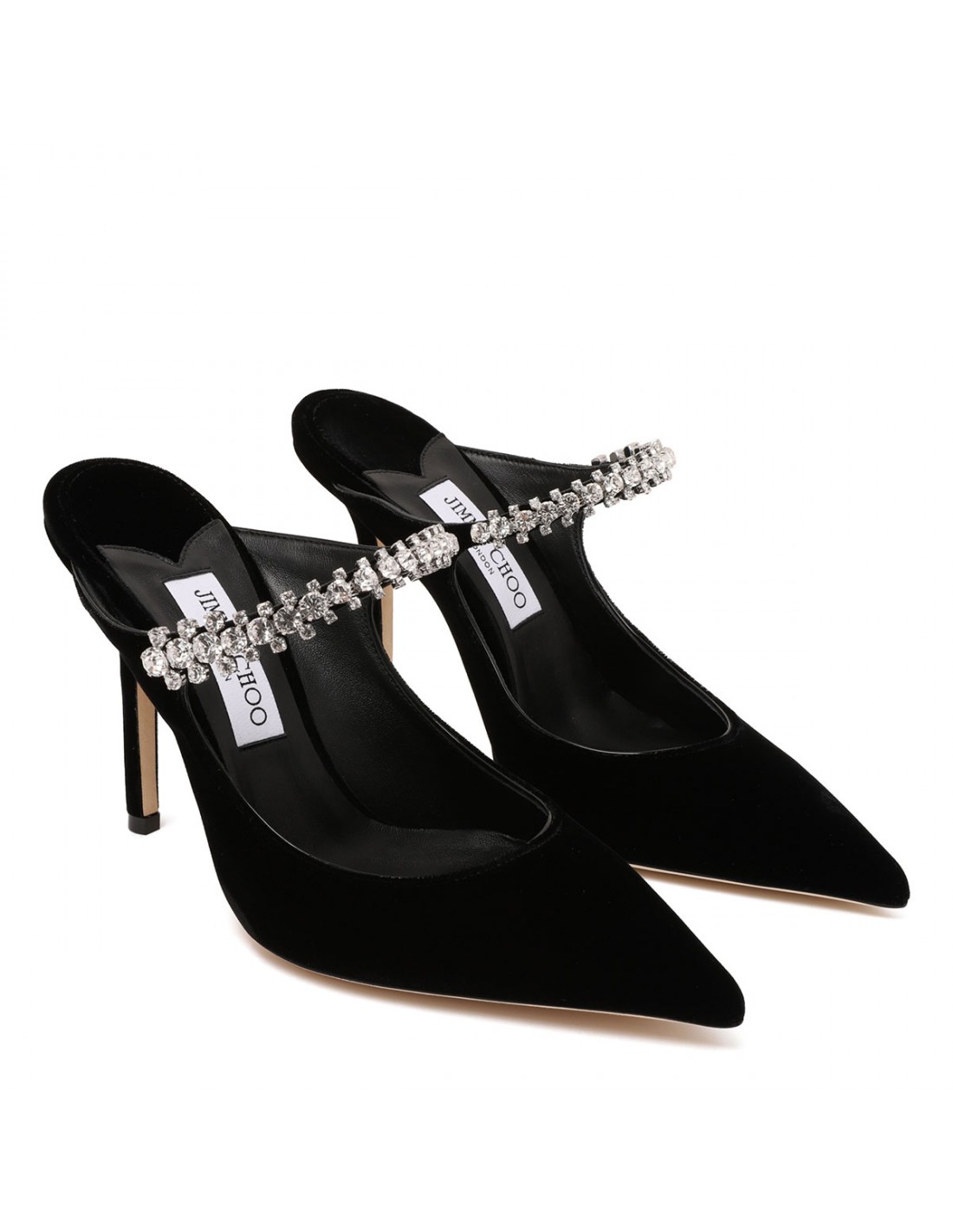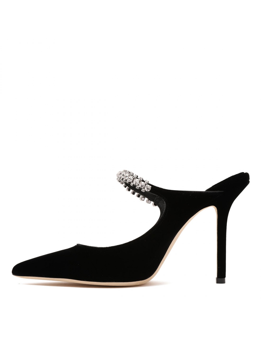 Black velvet Bing mules from Jimmy Choo featuring hand-finished crystal strap, pointed toe, 100 slim heel, open back, leather lining and sole, slip on style.