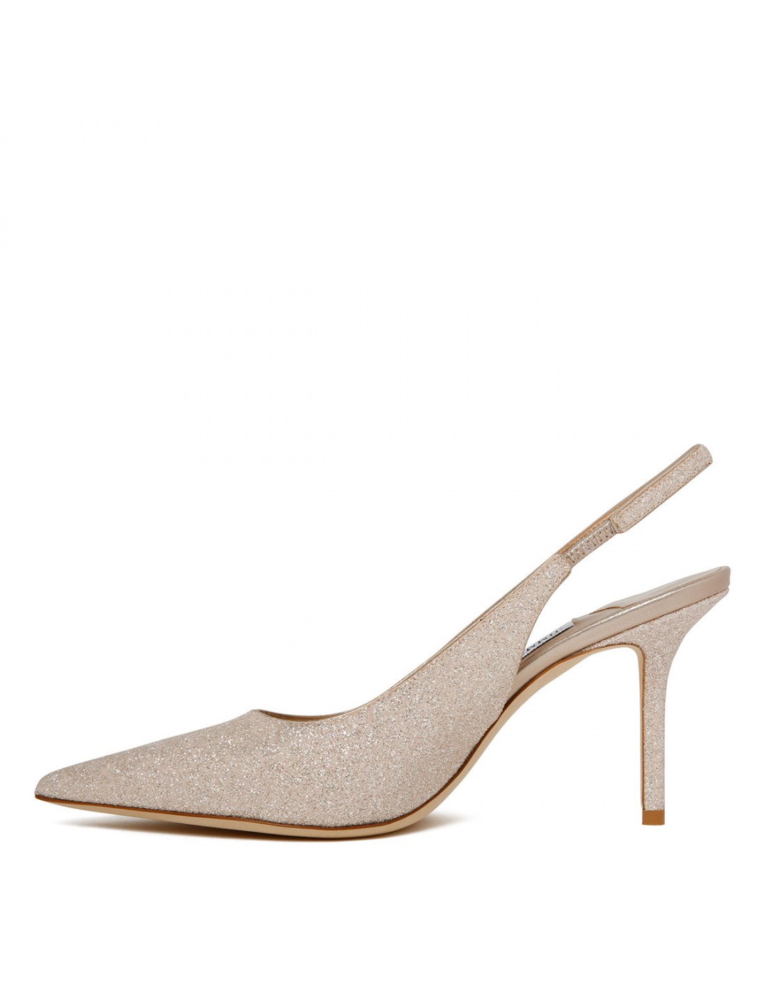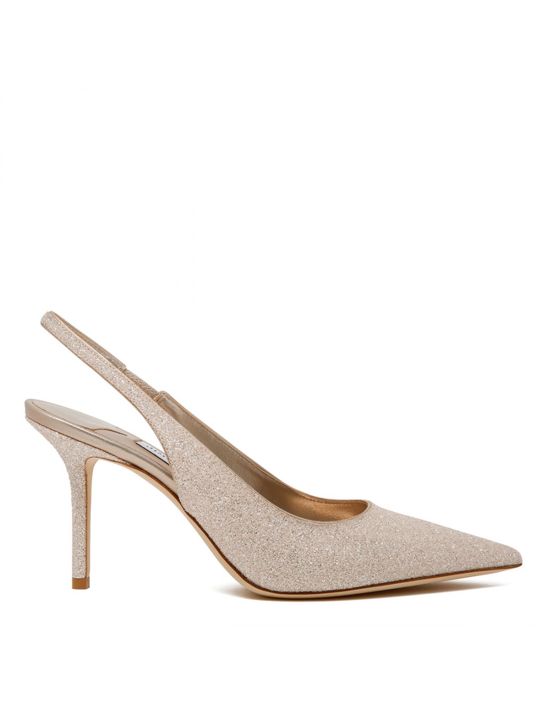 Light gold glittery Love slingback pumps from Jimmy Choo featuring pointed toe, cut higher on the foot, slingback strap with elastic insert, slim 85 heel, leather insole, hand-sculpted leather sole.