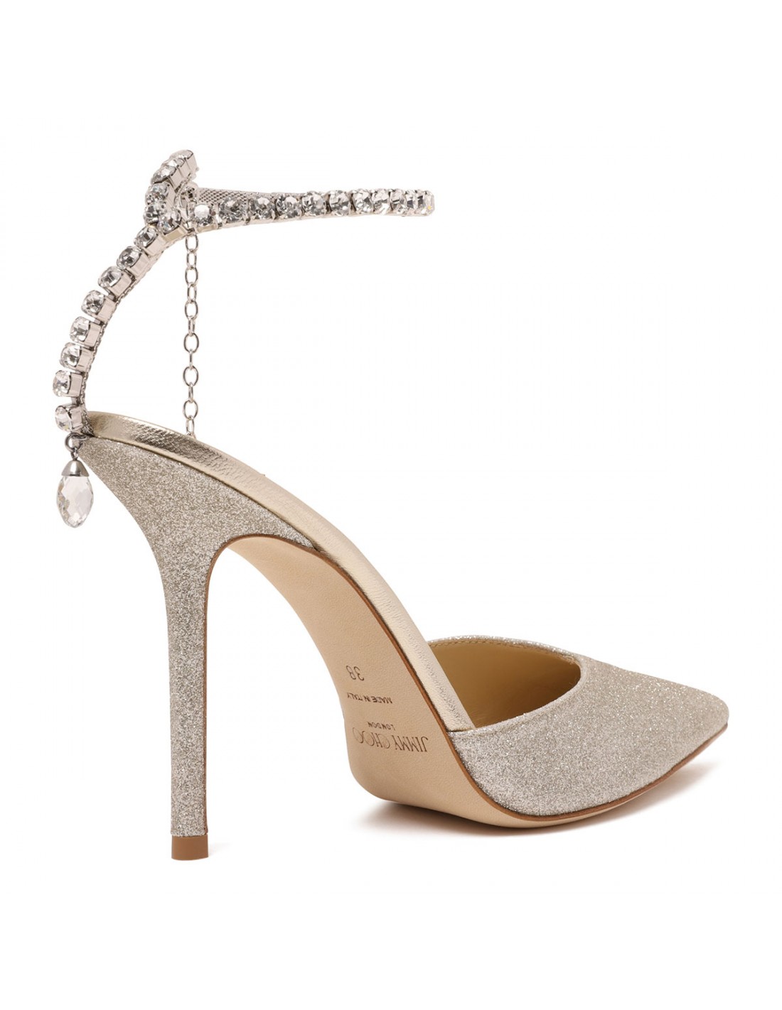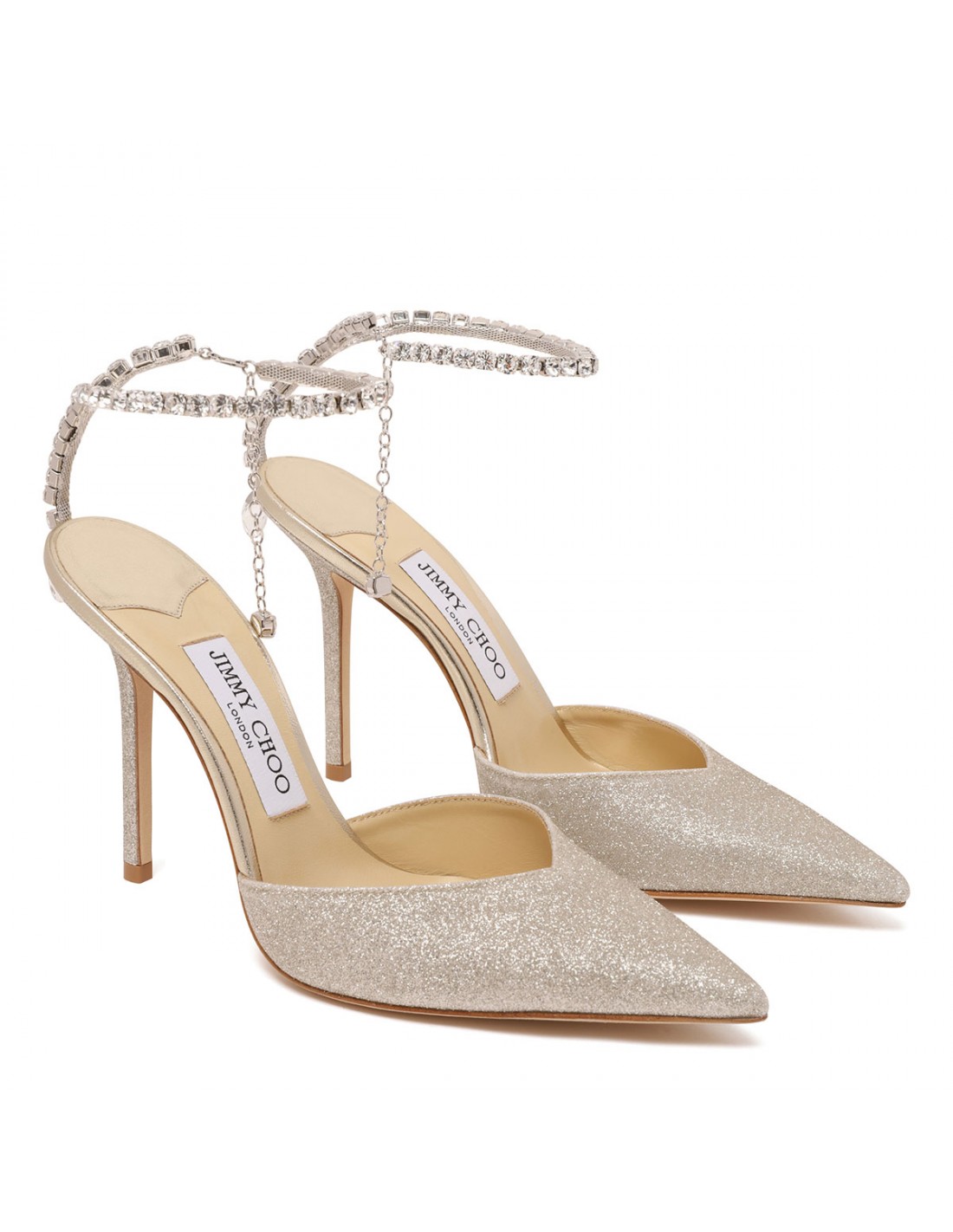 Platinum ice glittery fabric Saeda pumps from Jimmy Choo featuring crystal chain with crystal pendent, pointed toe, 100 stiletto heel, leather insole and sole.