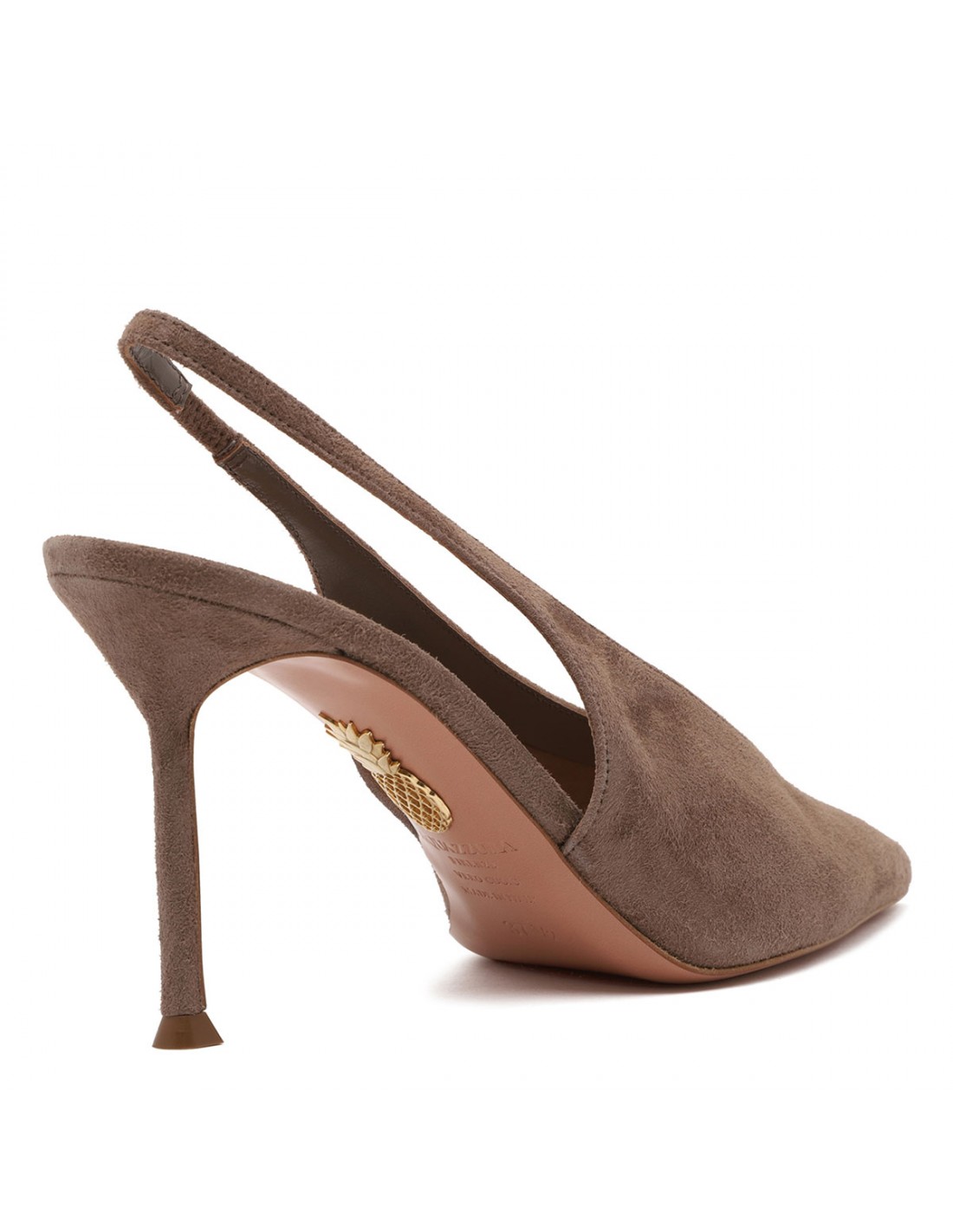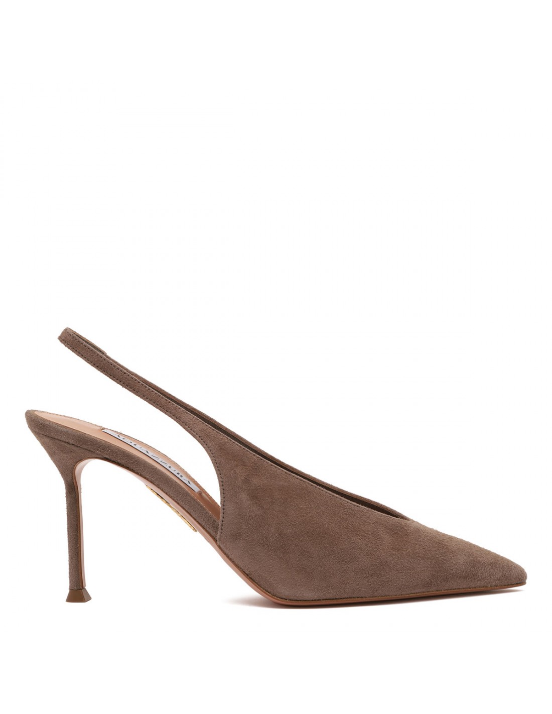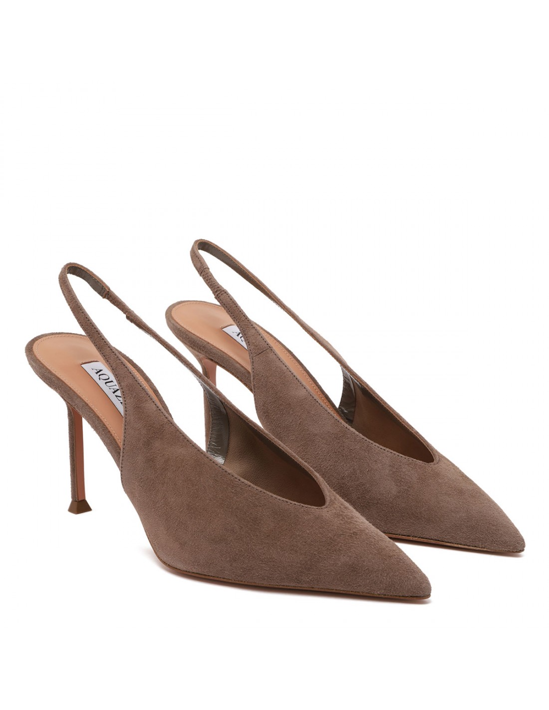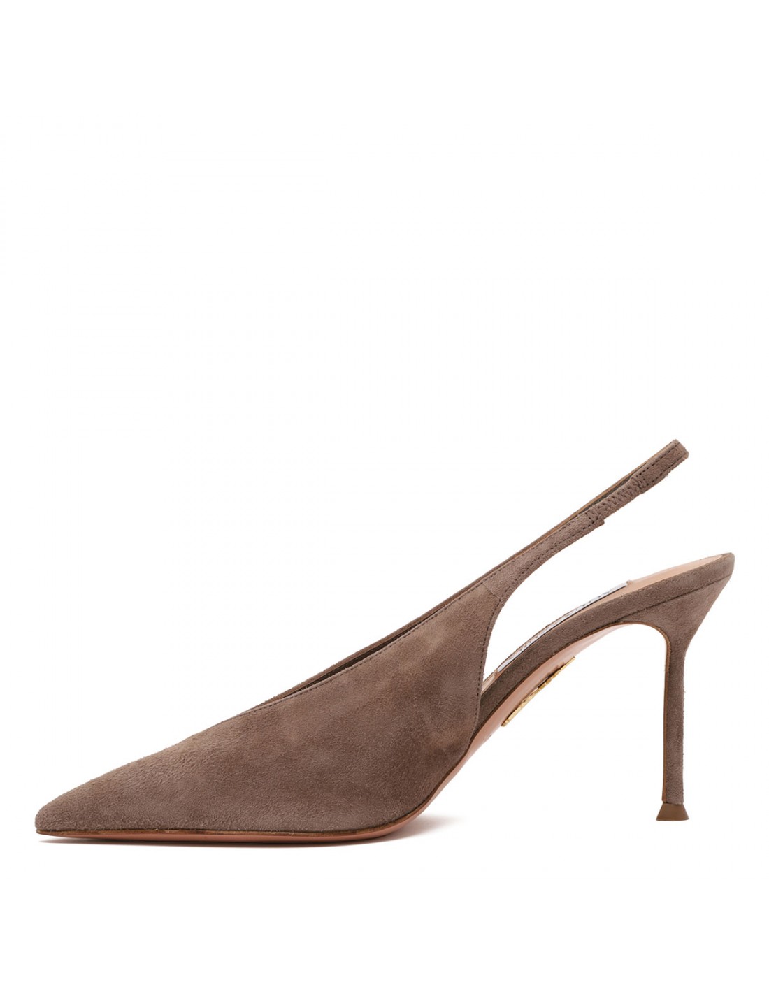 Taupe suede Voltaire slingback pumps from Aquazzura featuring V-shaped vamp, pointed toe, elasticated slingback strap, 85 pin-thin heel, leather insole and sole.