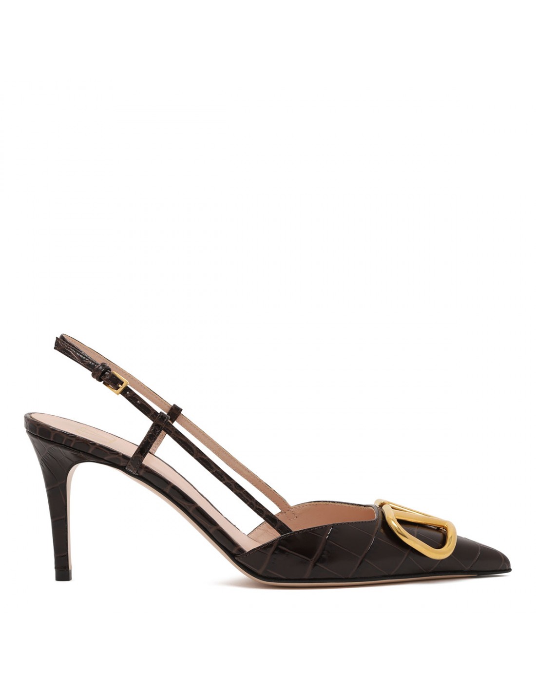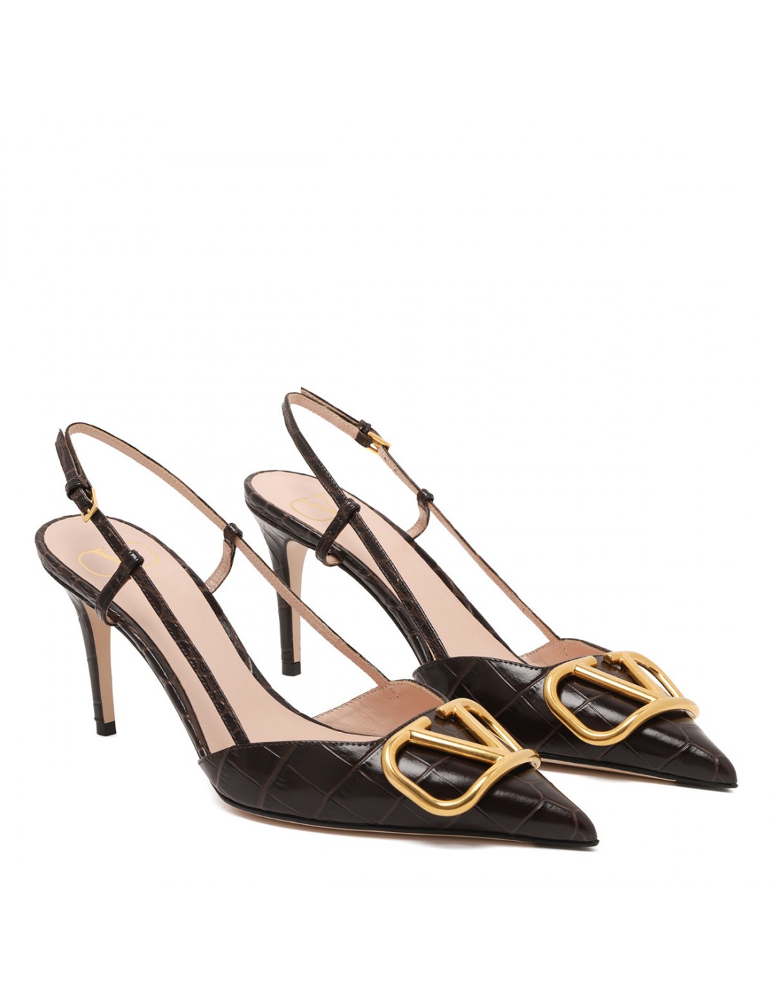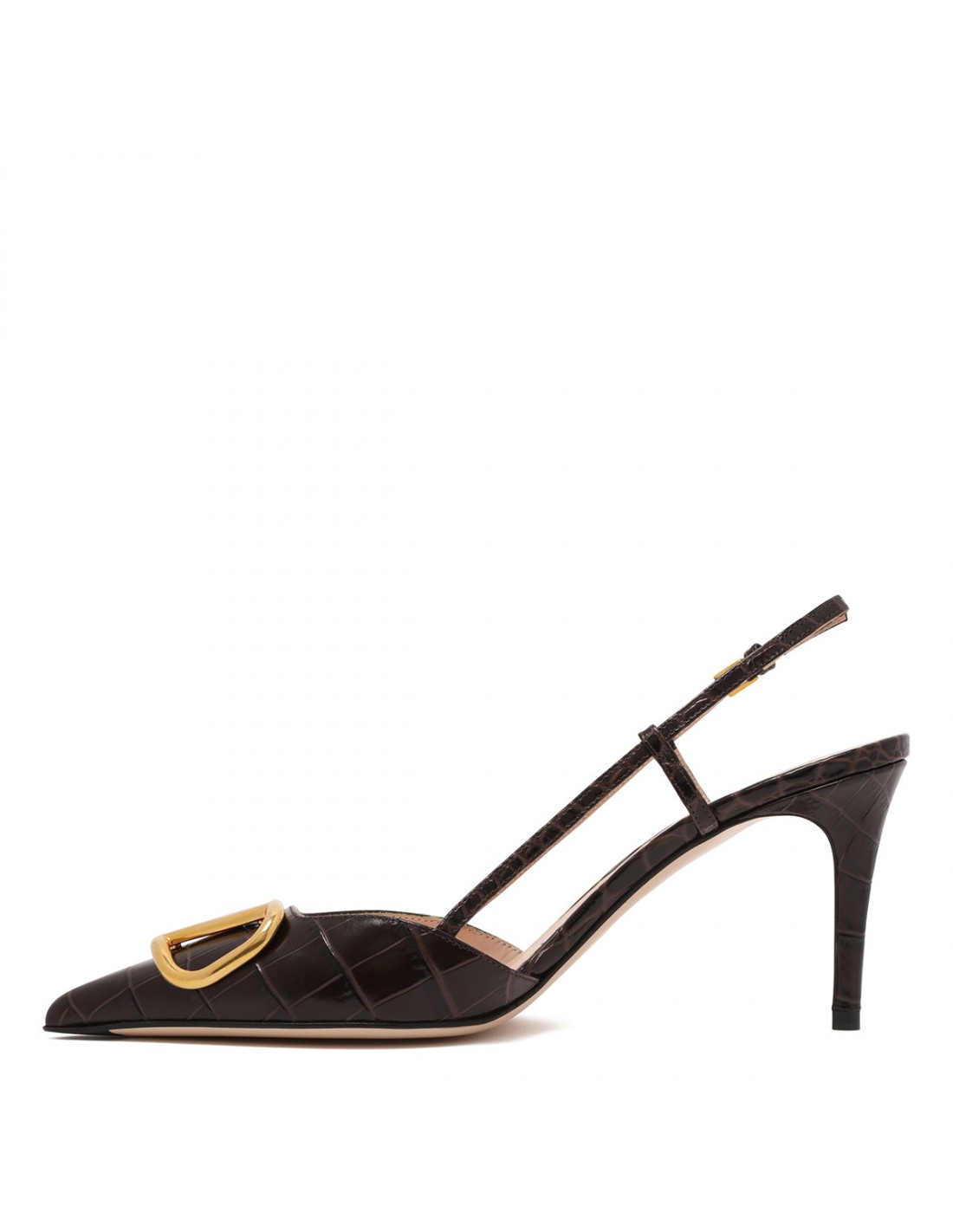 Black crocodile-effect printed leather VLogo Signature slingback pumps from Valentino Garavani featuring VLogo Signature accessory with antique-effect brass finishing, adjustable slingback strap with buckle closure, pointed toe, 80 stiletto heel, leather insole and sole.