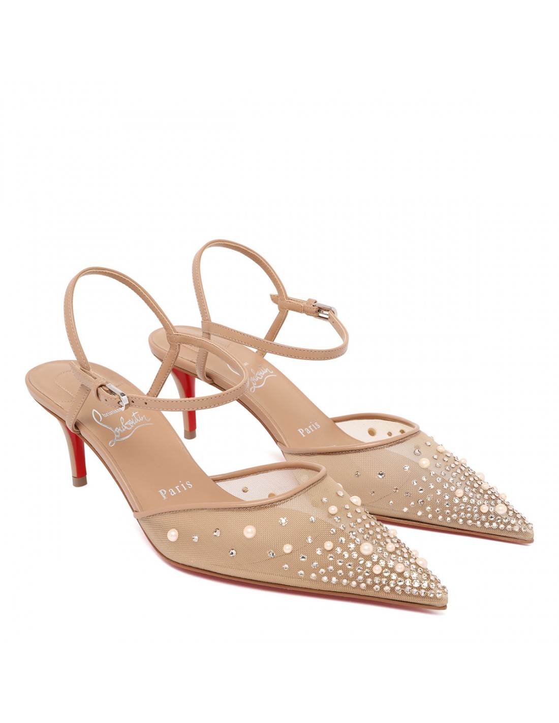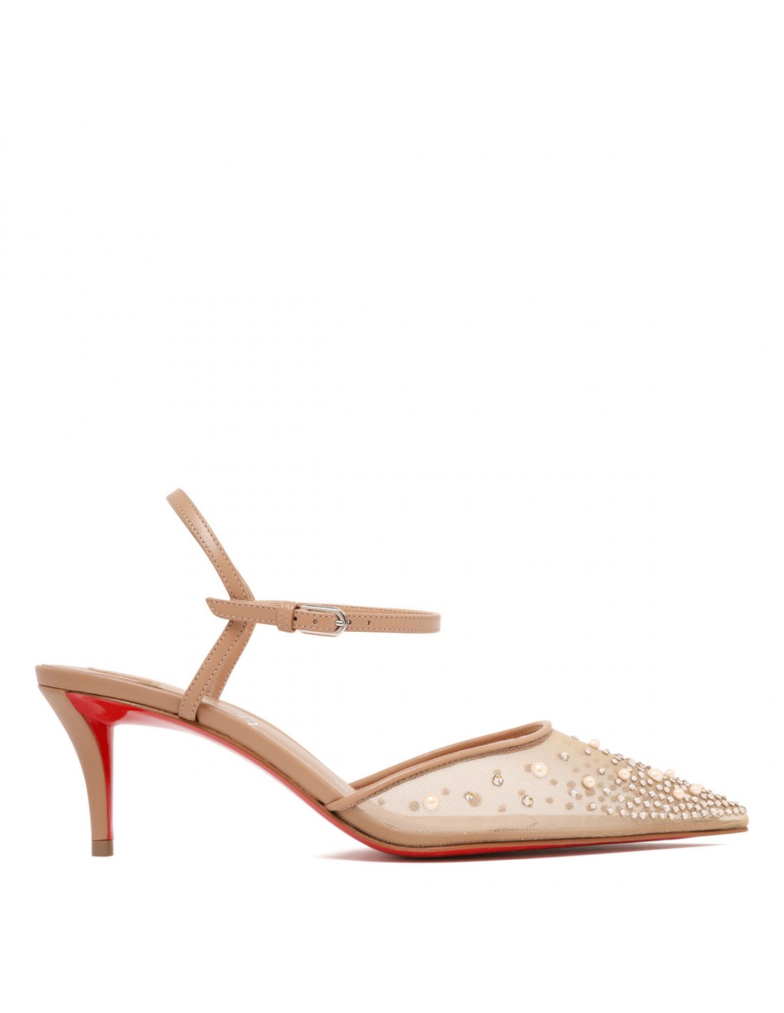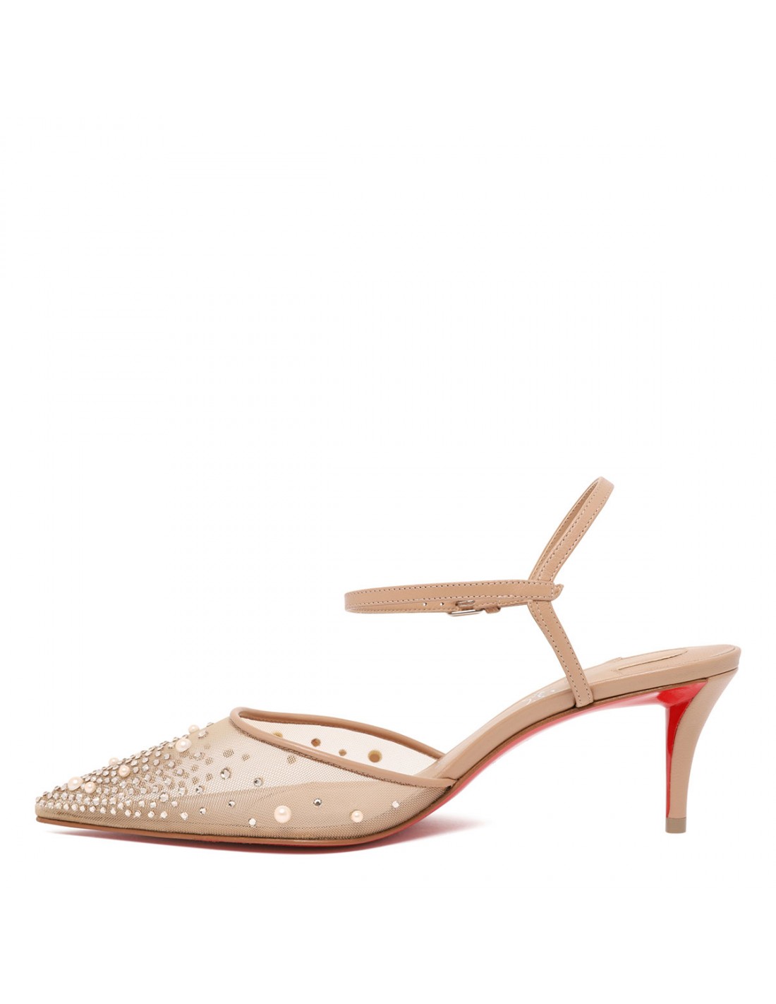 Blush hue leather Miss Z Riviera pumps from Christian Louboutin featuring mesh upper with tonal strass and pearls, pointe toe, buckle fastening ankle strap, open back, 60 stiletto heel, leather insole, signature Louboutin red leather outsole.