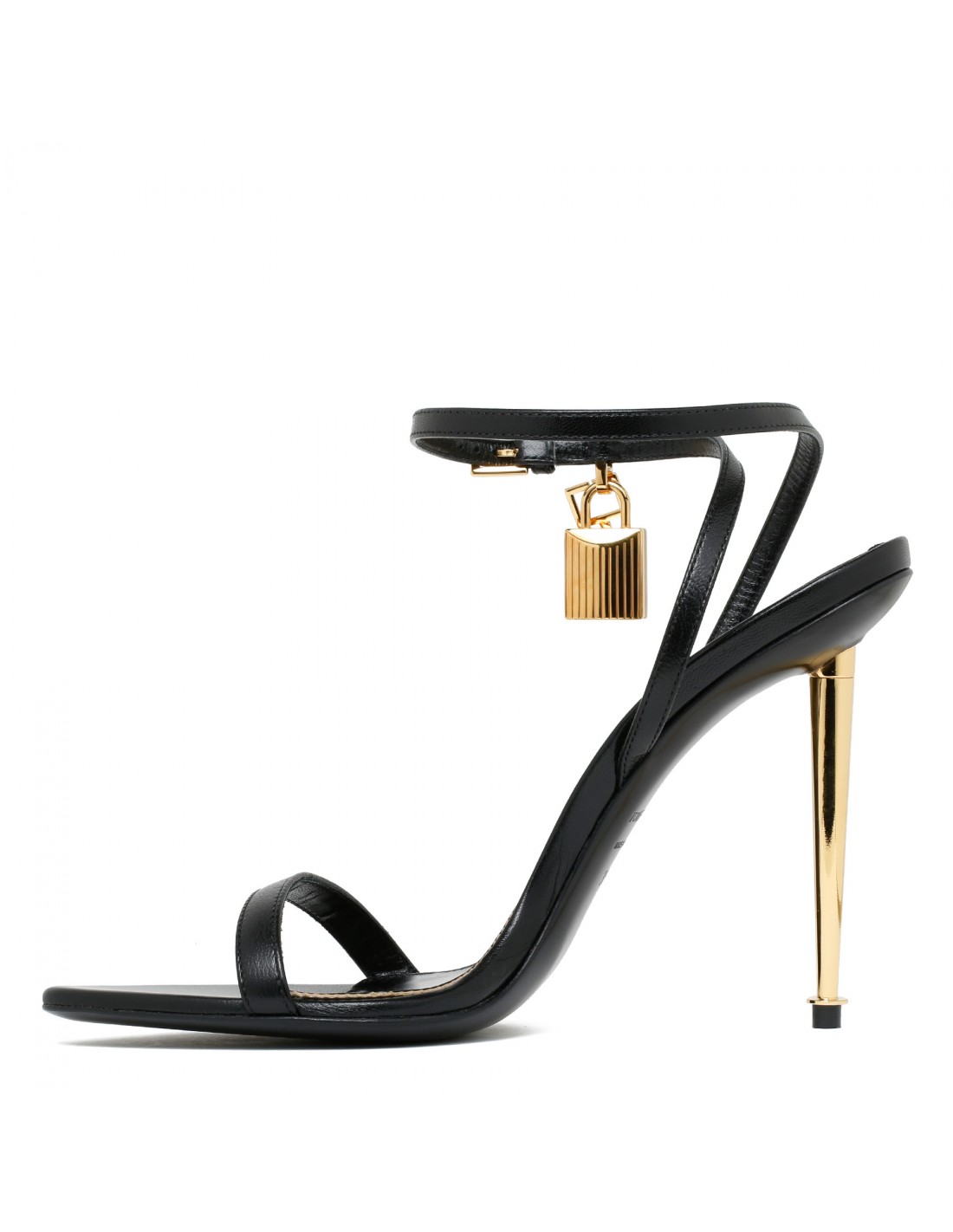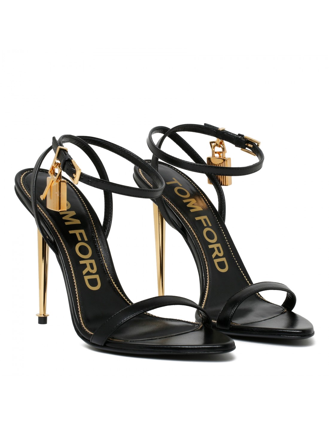 Black leather Padlock sandals from Tom Ford featuring signature padlock metal hardware, iconic metal spike stiletto heel, pointed open toe, buckle fastening ankle strap, leather insole and sole.