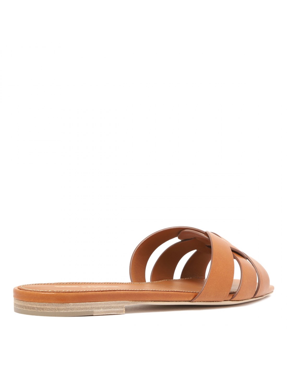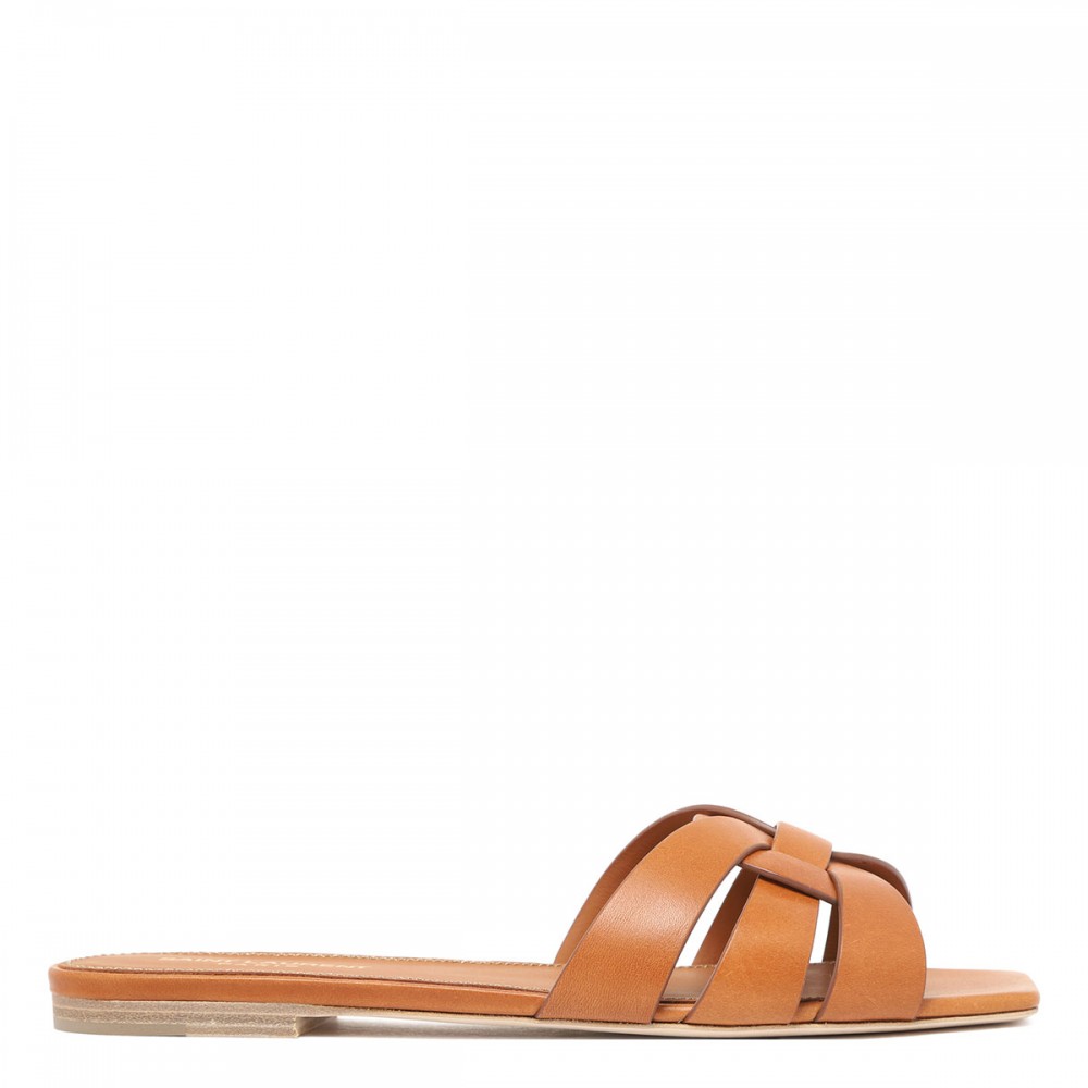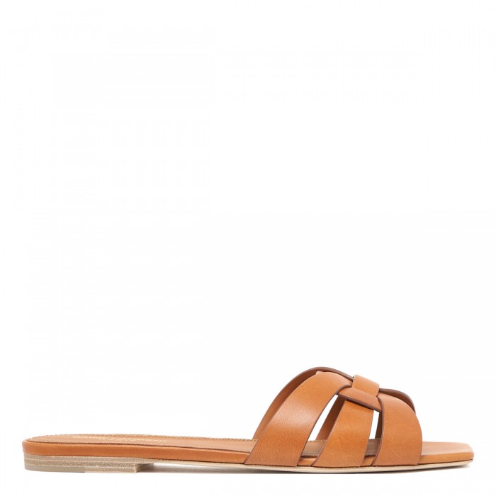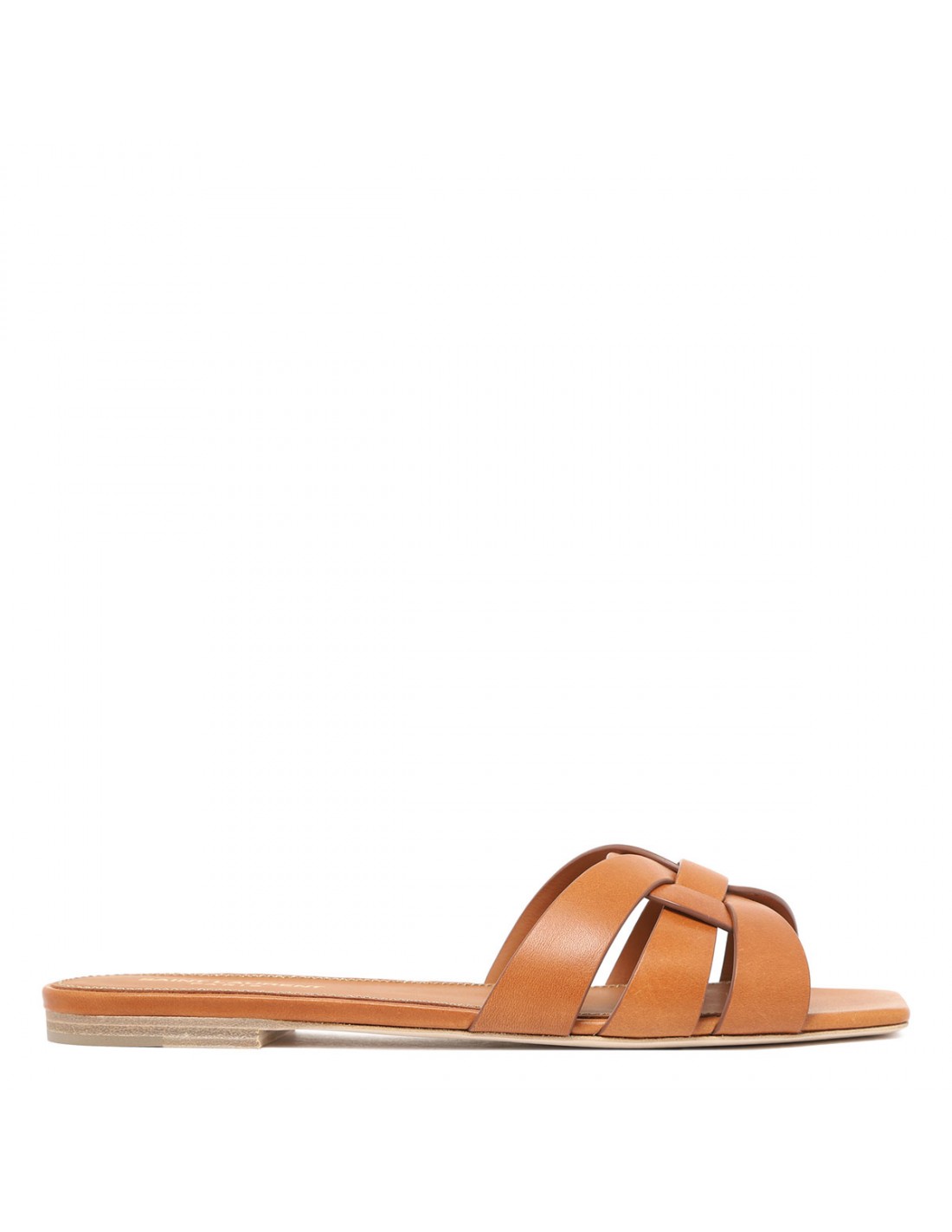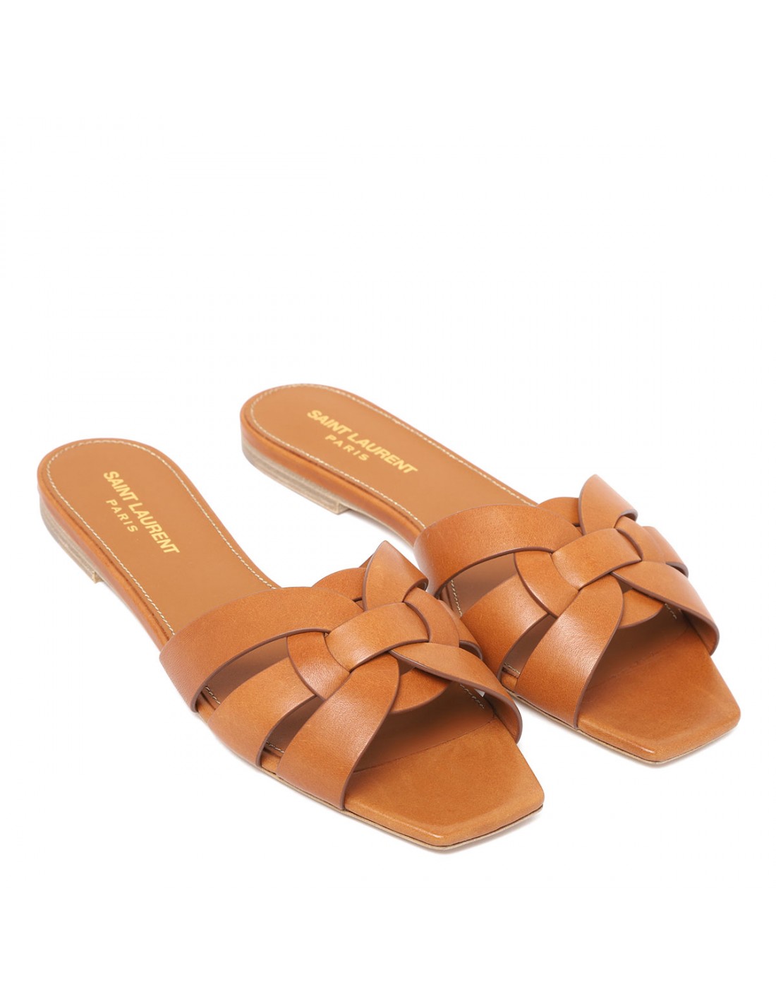 Amber hue metal-free tanned leather Tribute flat mule sandals from Saint Laurent featuring intertwining straps, flat sole, leather insole and sole.