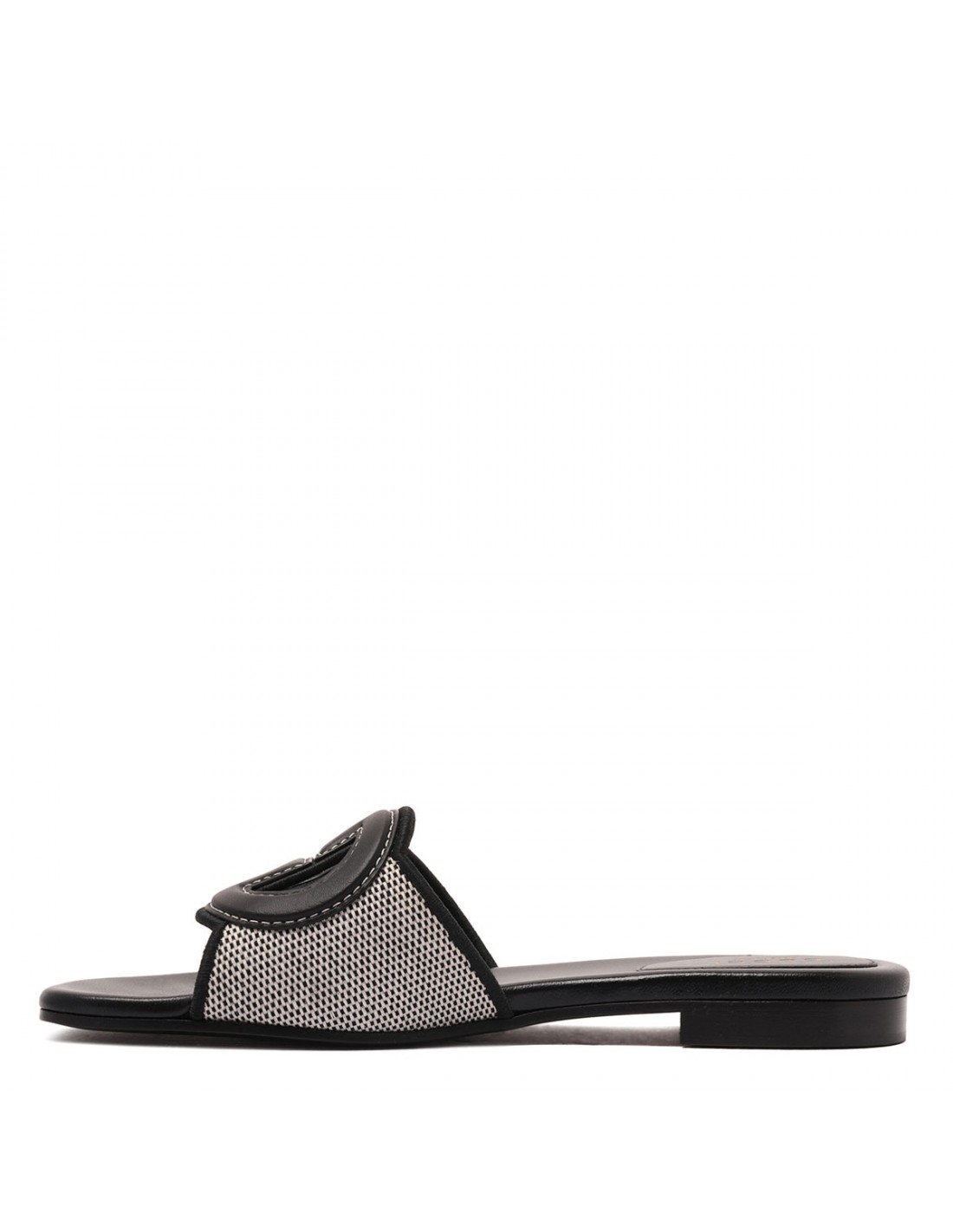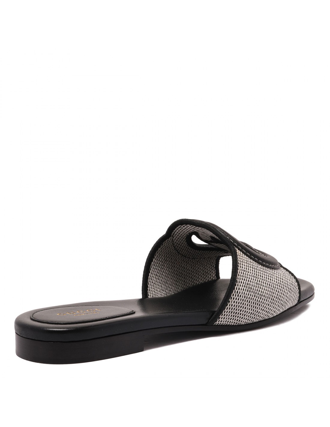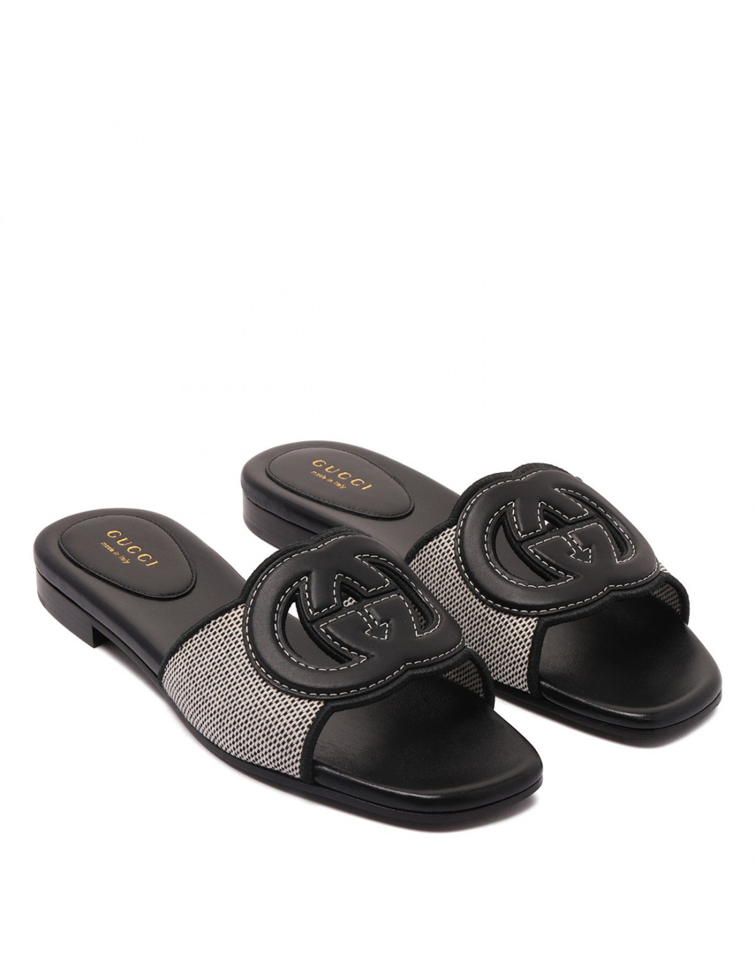 Natural canvas and black leather slide sandals from Gucci featuring leather trims, interlocking G cutout, flat sole, leather lining and sole.