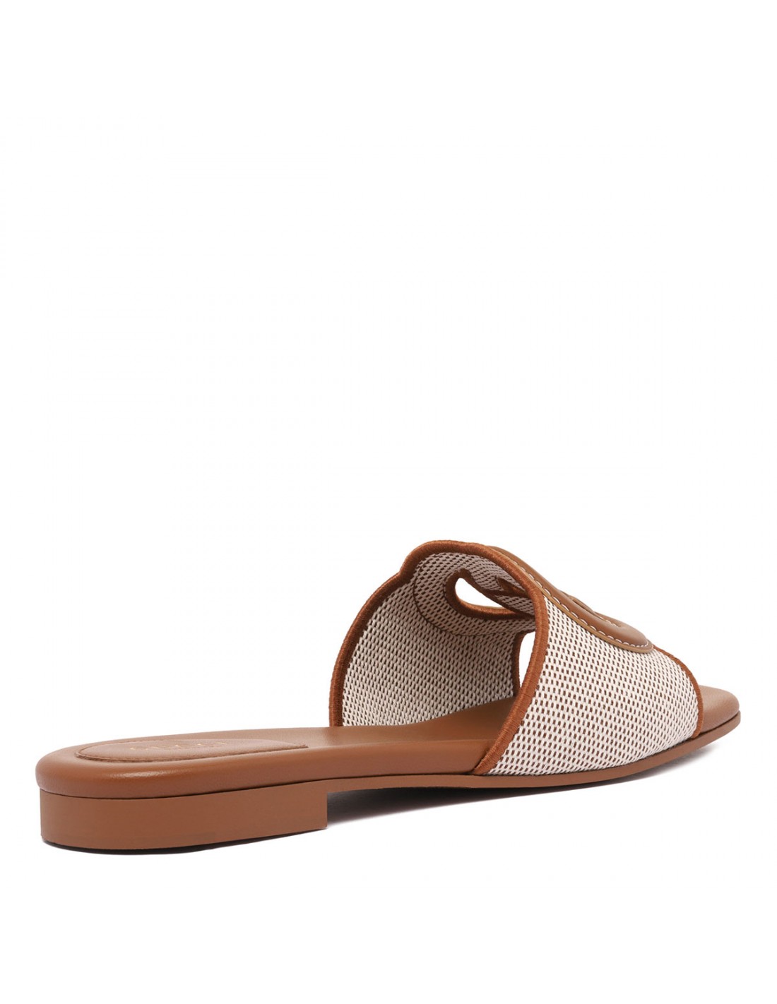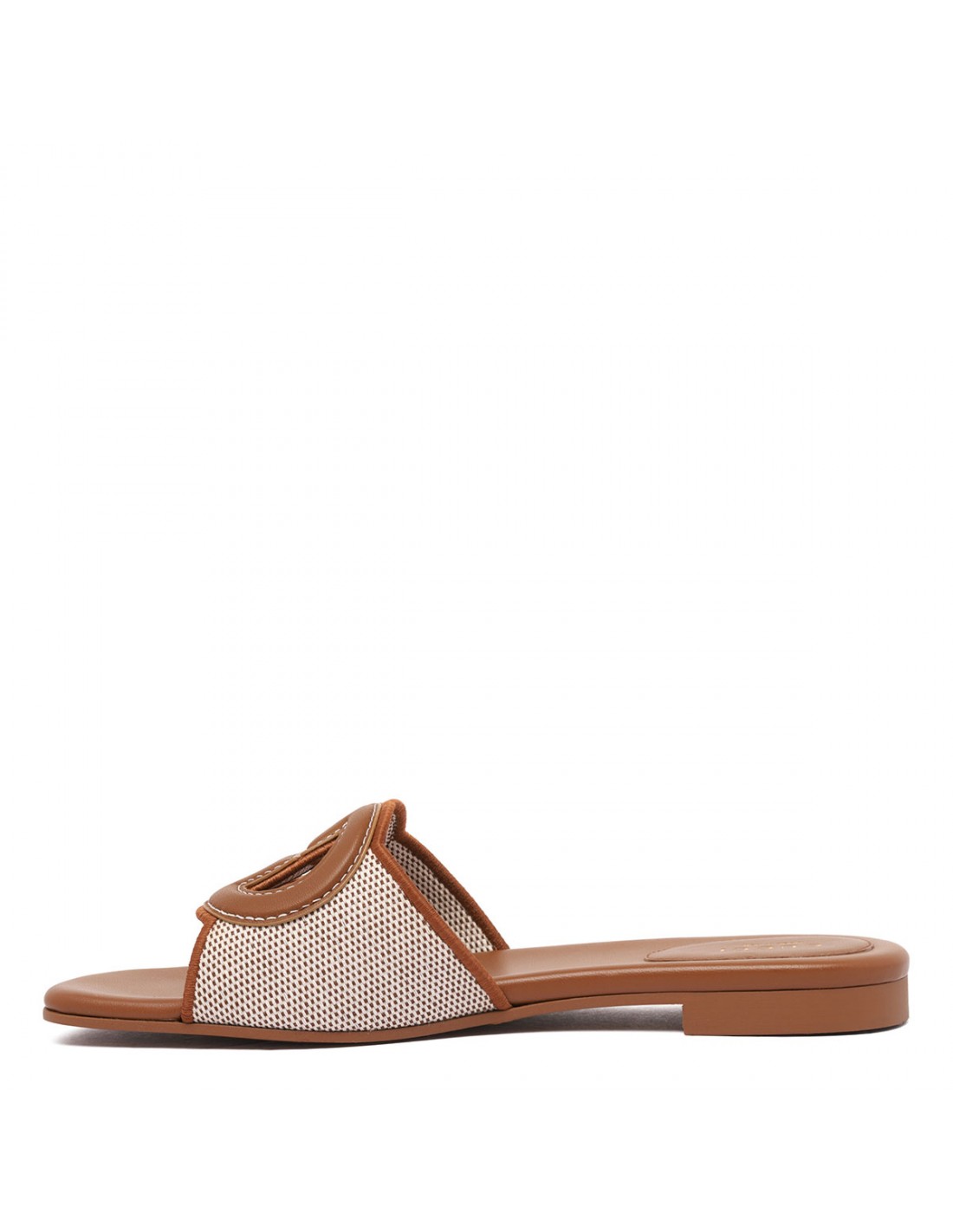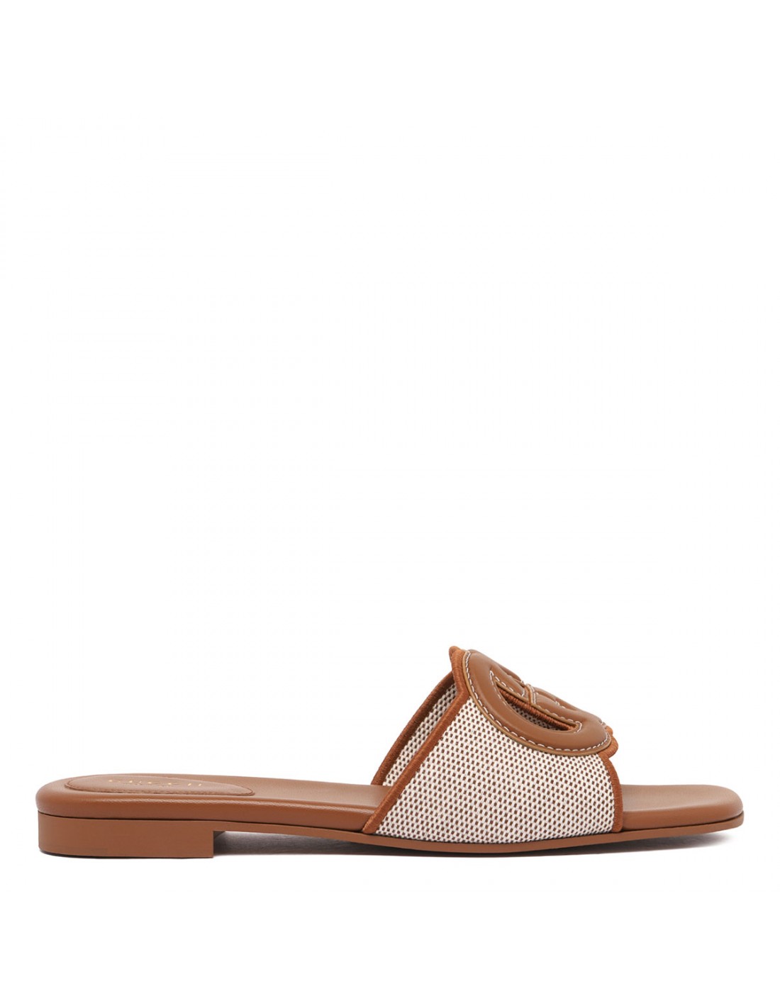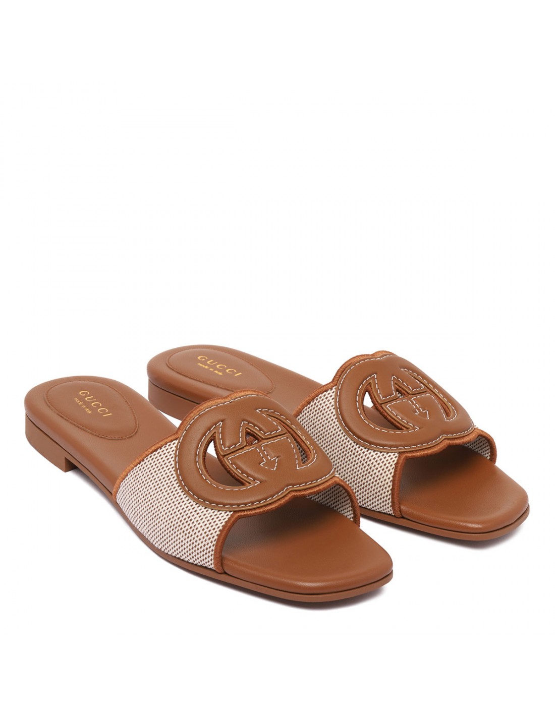 Natural canvas and brown leather slide sandals from Gucci featuring leather trims, interlocking G cutout, flat sole, leather lining and sole.