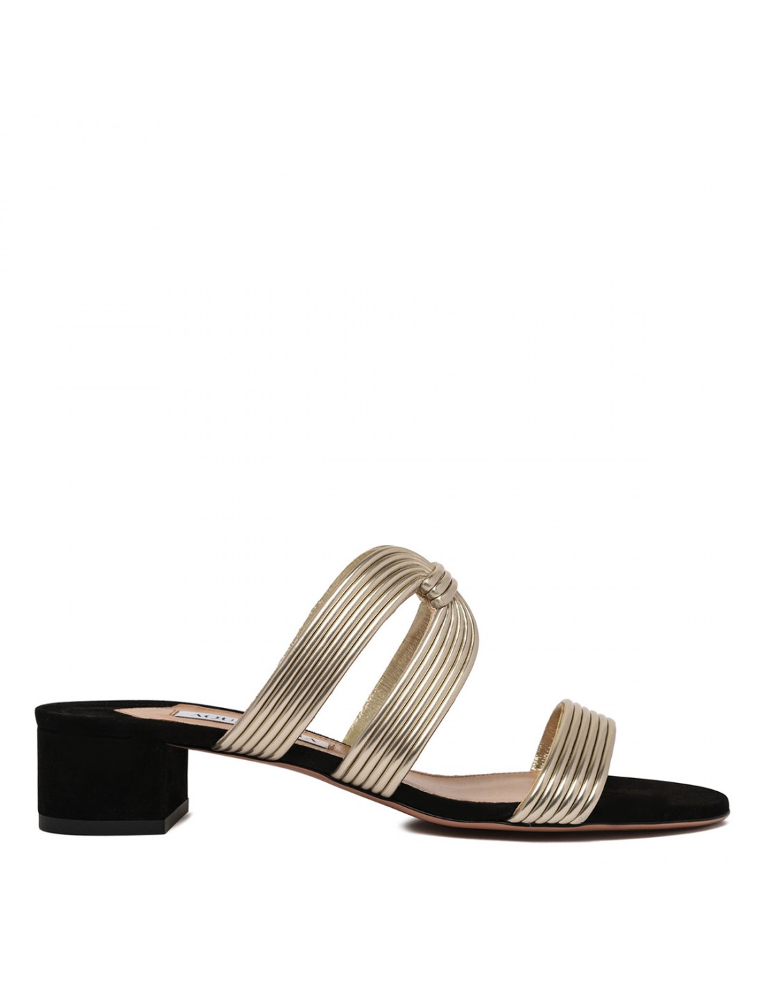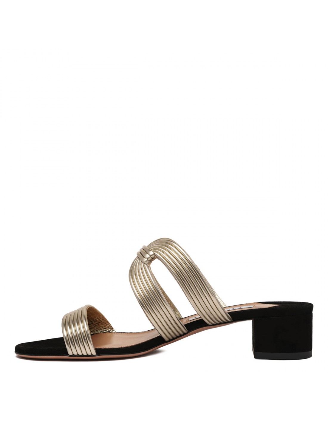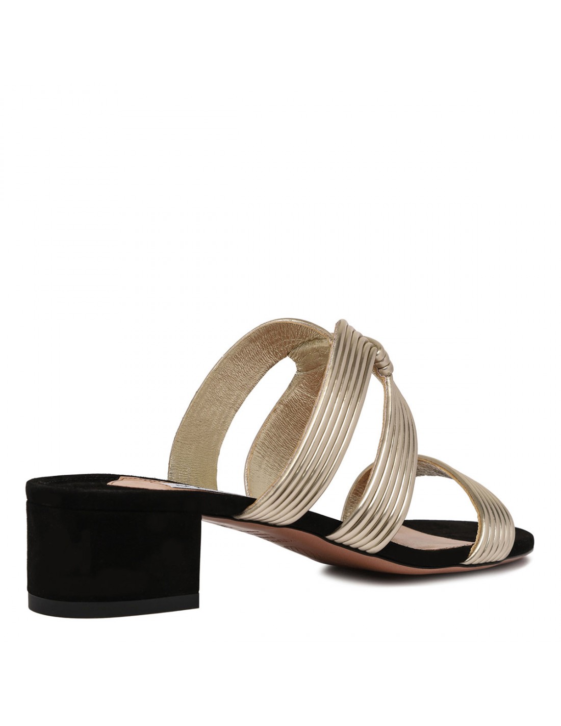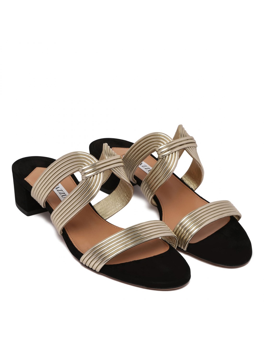 Black suede leather Esencia sandals from Aquazzura featuring metallic gold ribbed knotted straps and front band, round toe, 35 block heel, padded leather insole, leather sole, logo signature.