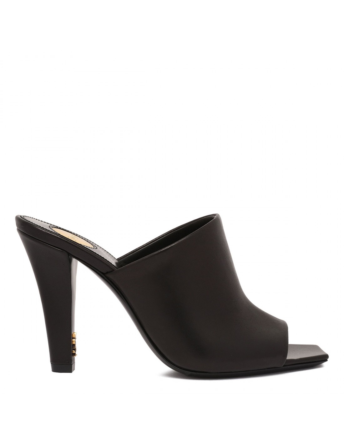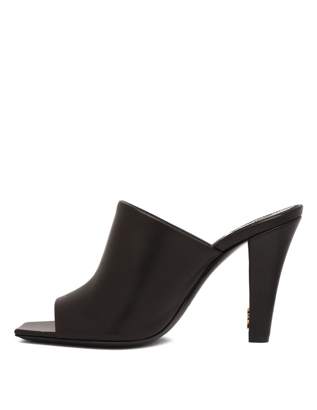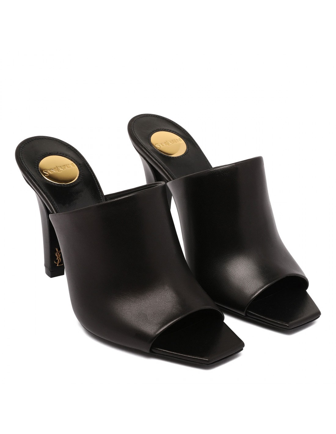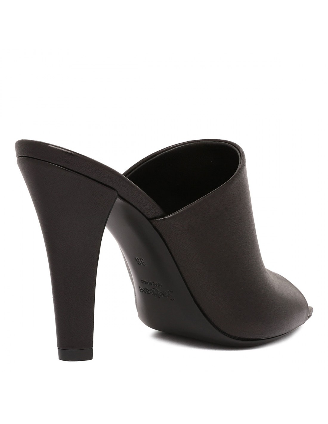 Black leather mules from Saint Laurent featuring peep toe, tapered block heel with inner Cassandre, logo engraved metal plaque on the insole, leather sole.