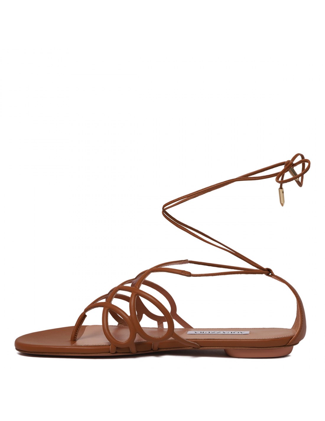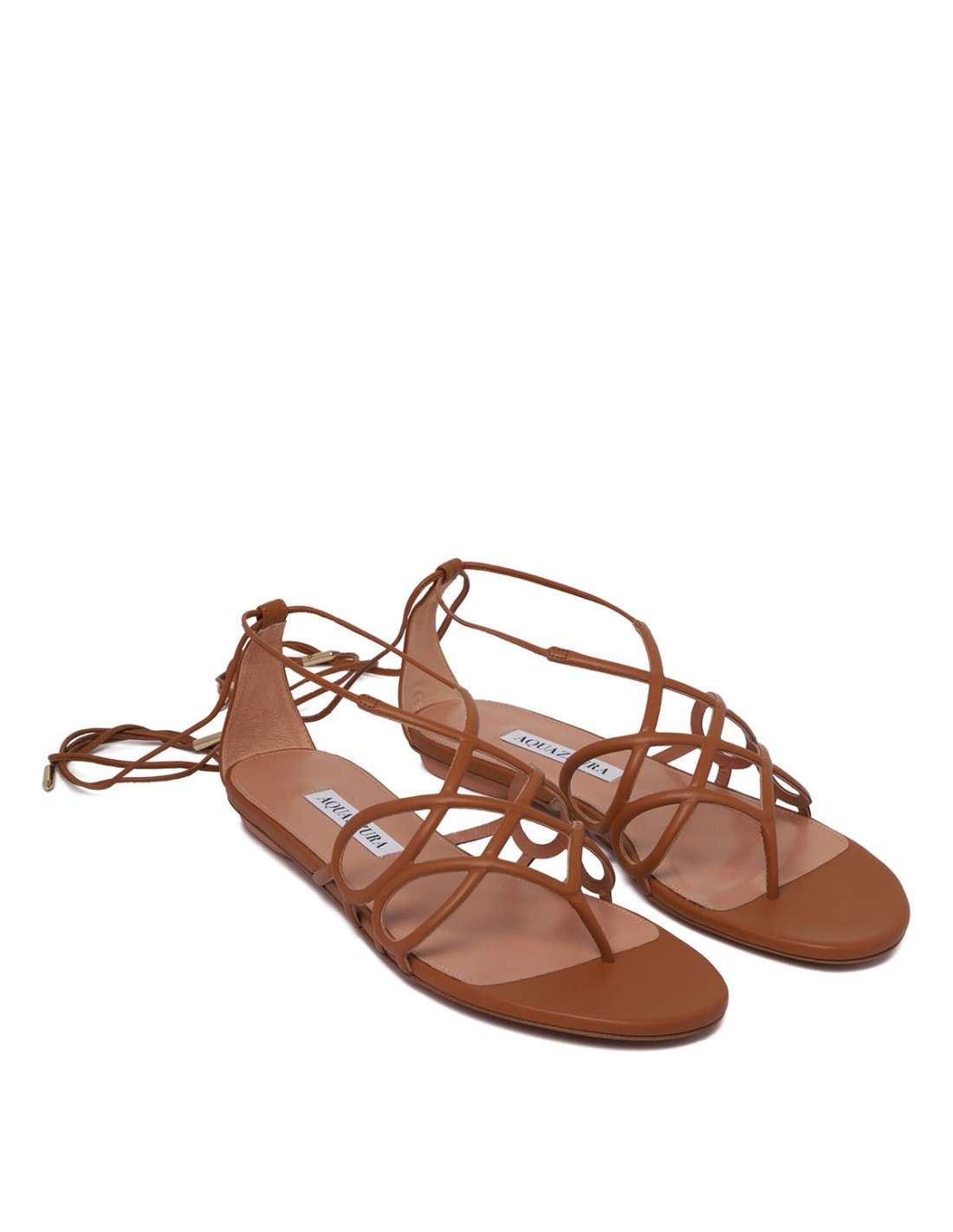 Honey brown nappa leather Infinito flat sandals from Aquazzura featuring upper with interlocking motif, self-tie laces, round open toe, flat heel, padded leather insole, leather sole with logo.