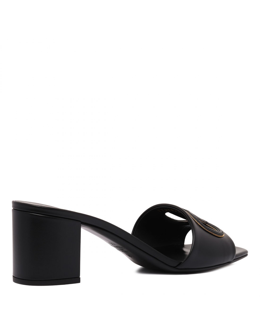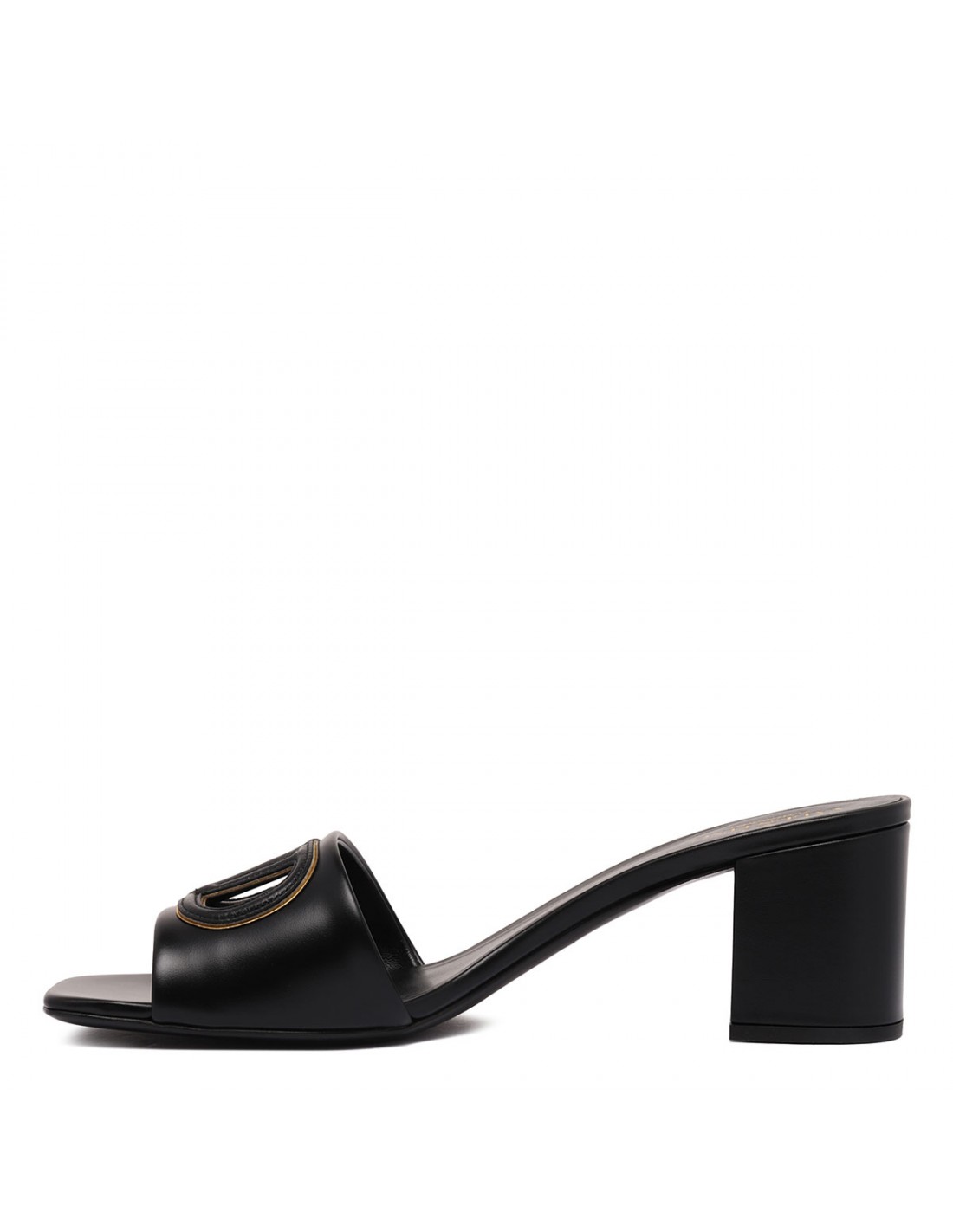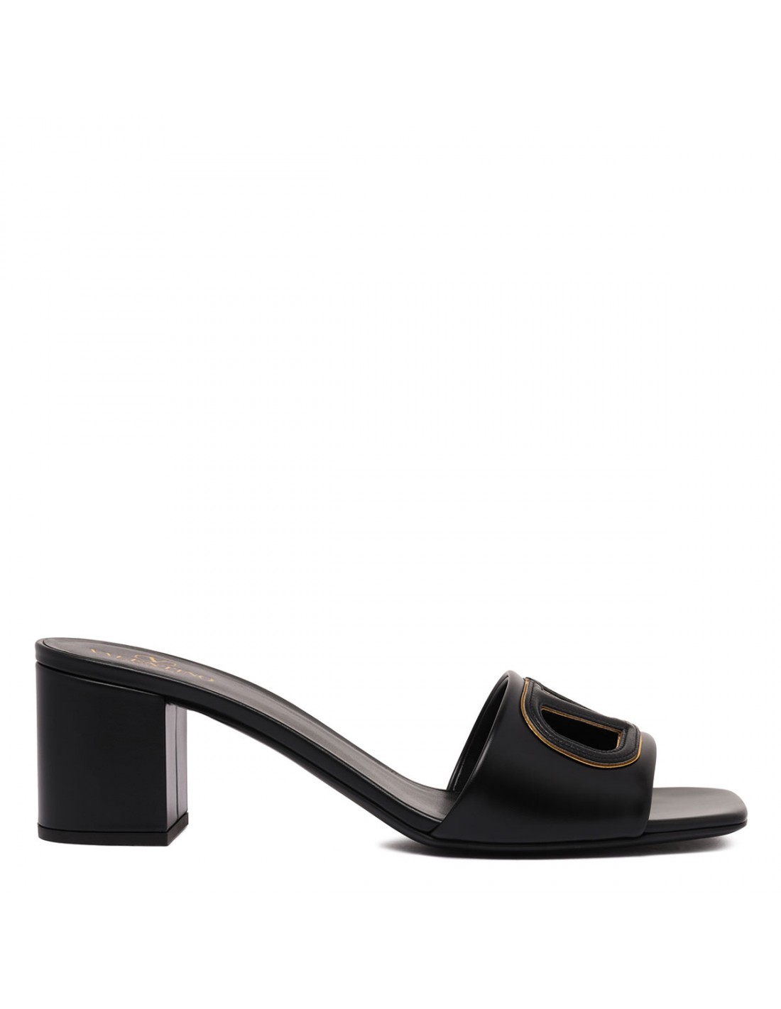 Black leather slide sandals from Valentino Garavani featuring VLogo Signature cut-out calfskin detail with mirror-effect trim, square open toe, block heel, leather insole and sole.
