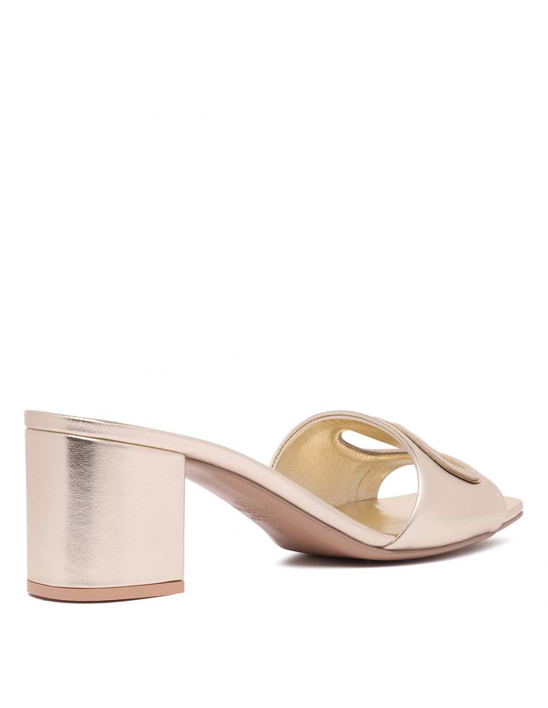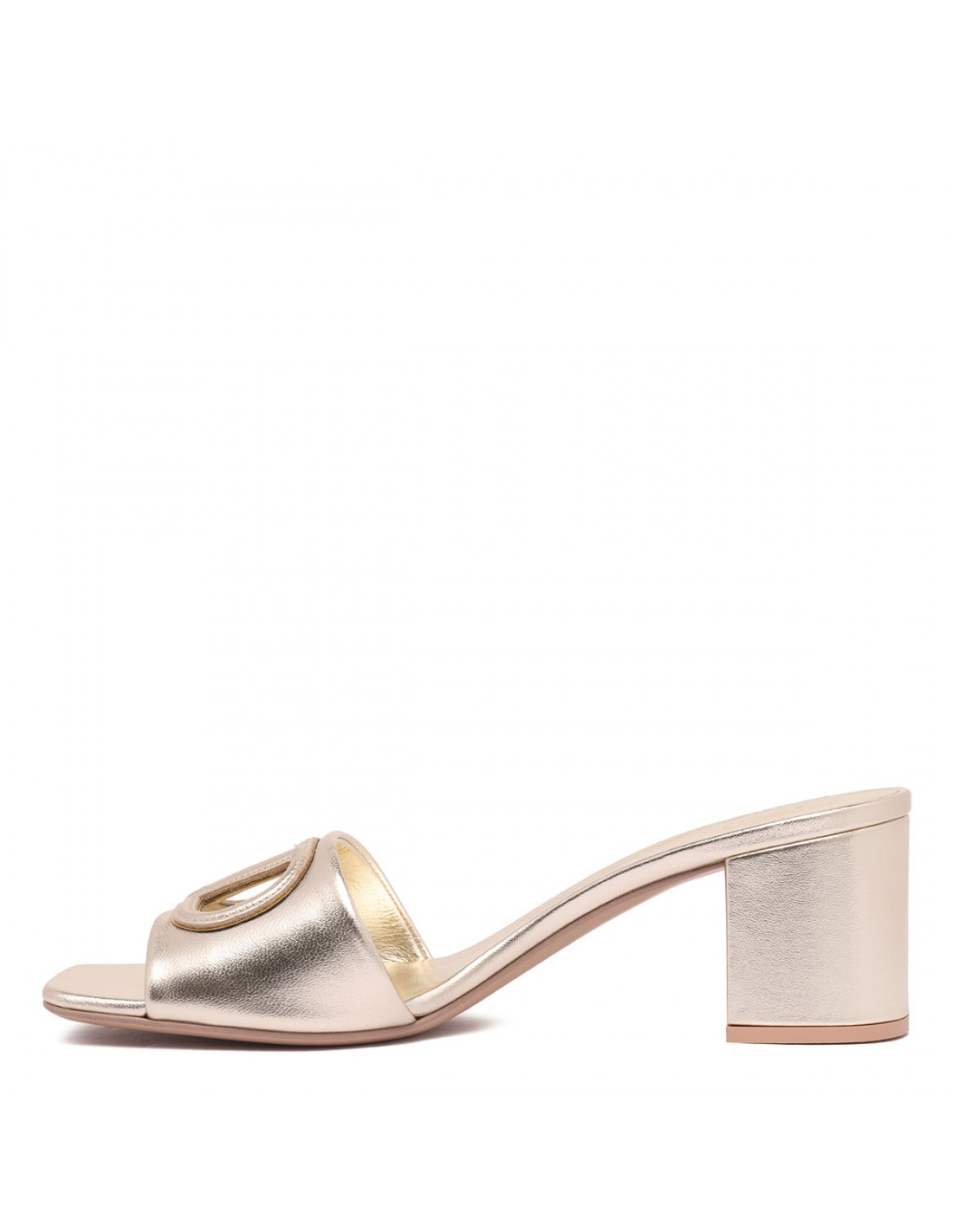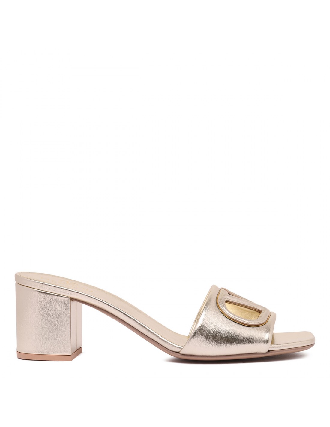 Laminated platinum leather slide sandals from Valentino Garavani featuring VLogo Signature cut-out calfskin detail with mirror-effect trim, square open toe, block heel, leather insole and sole.