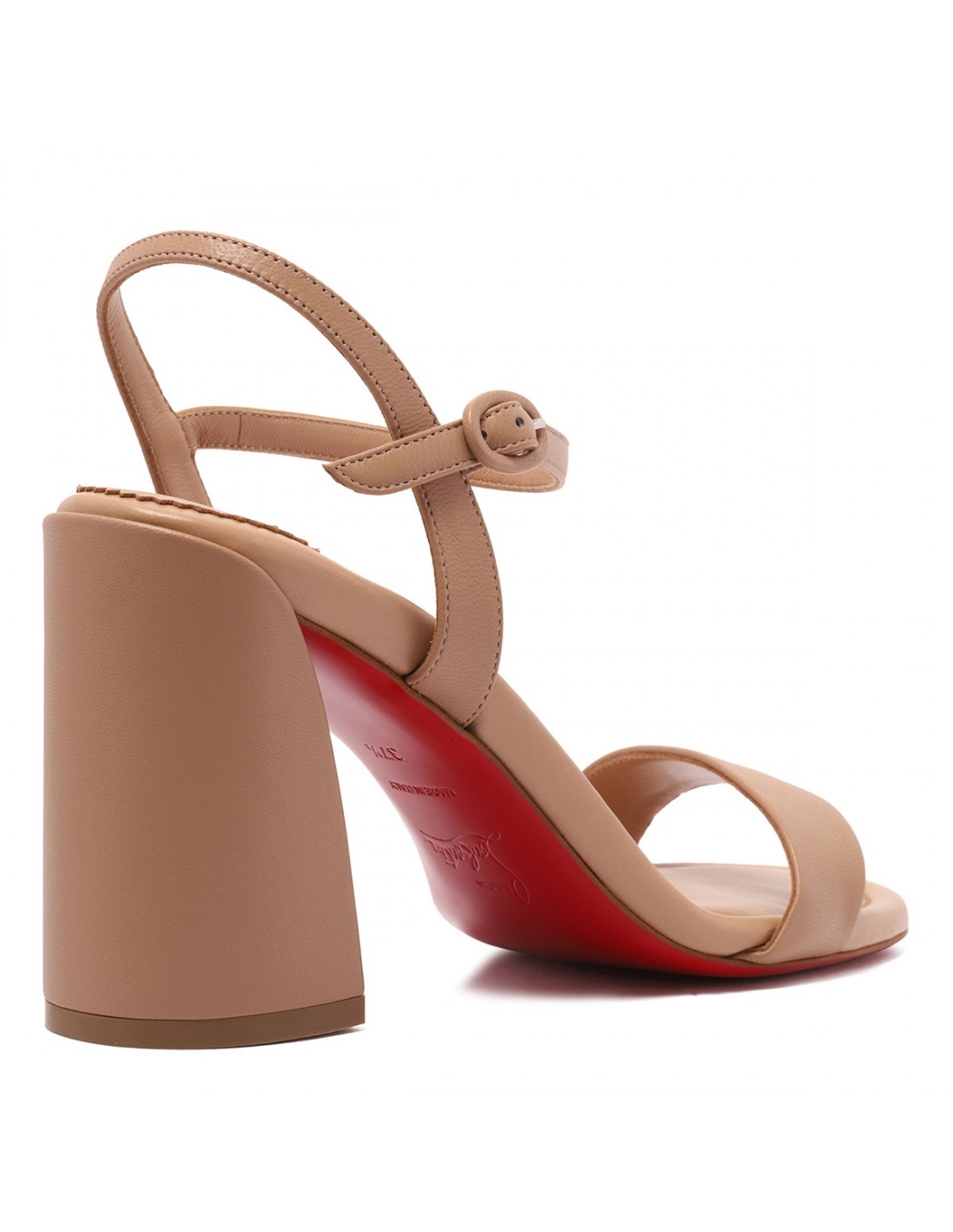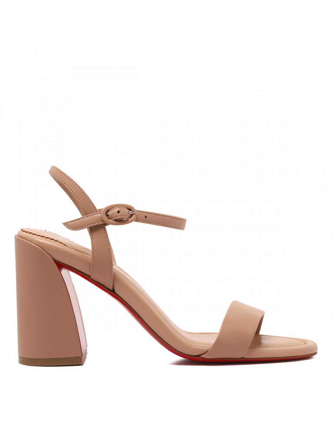 Blush nappa Miss Jane sandals from Christian Louboutin featuring rounded open toe, low-cut vamp, ankle strap with buckle fastening, square 85 heel, padded insole, signature red leather outsole.