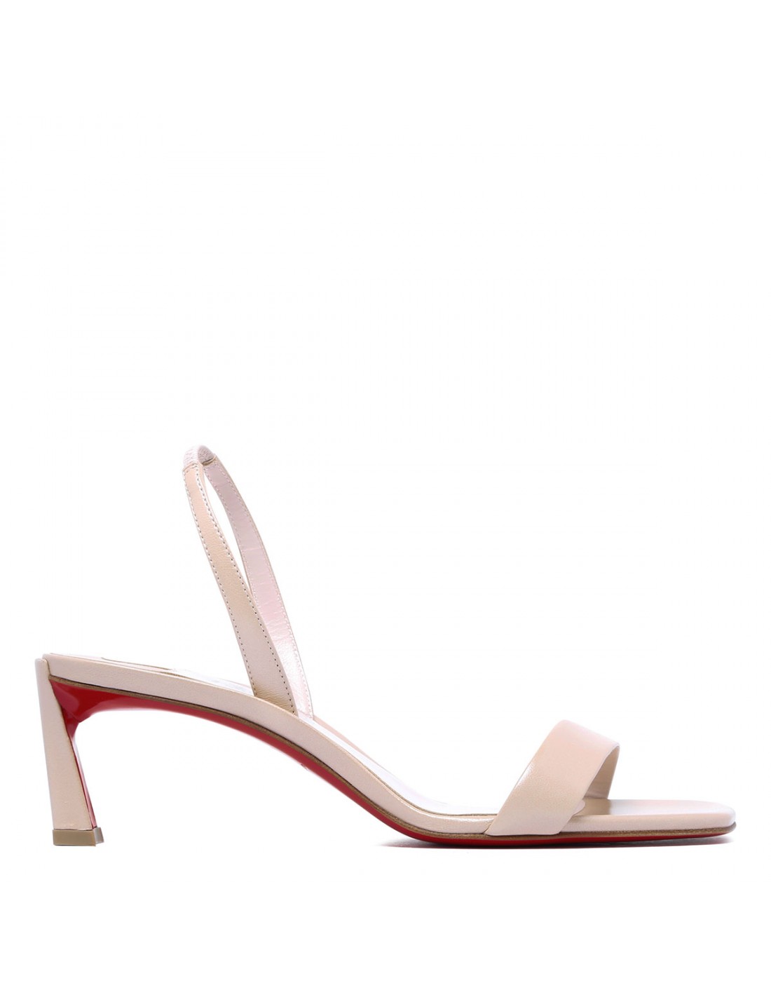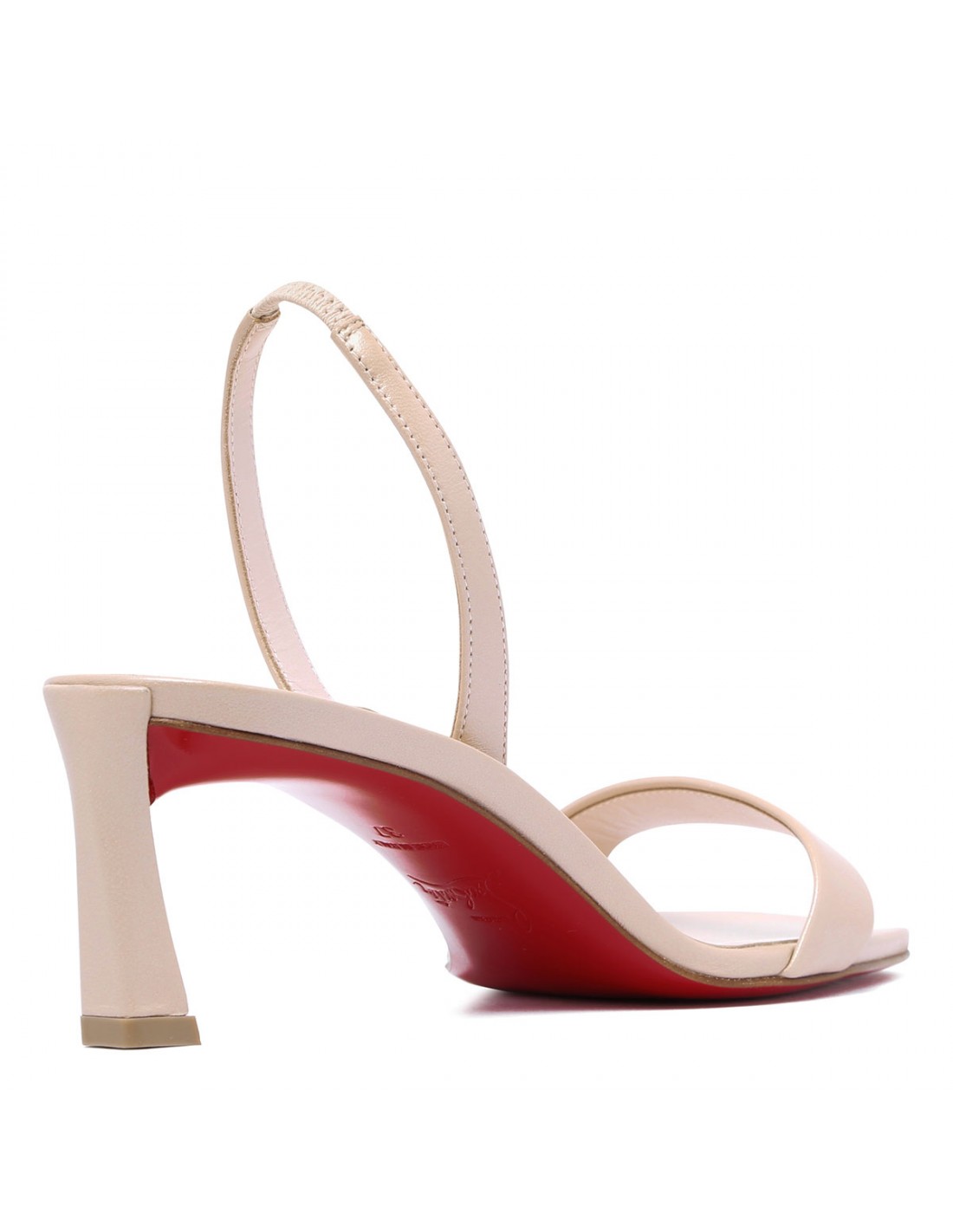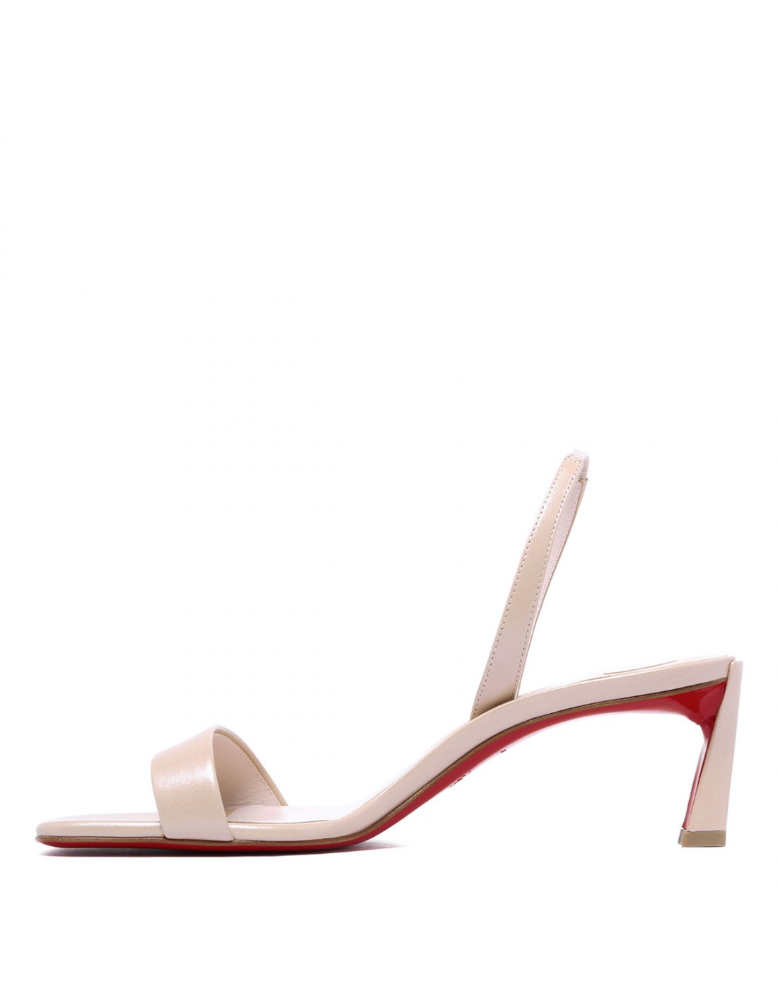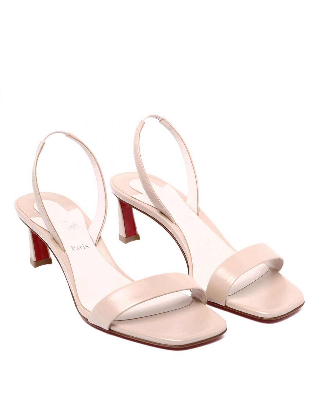 Milk hue pearlescent leather O Condora sandals from Christian Louboutin featuring square open toe, slingback strap with elastic insert, 55 bevelled heel, leather insole and signature red leather outsole.