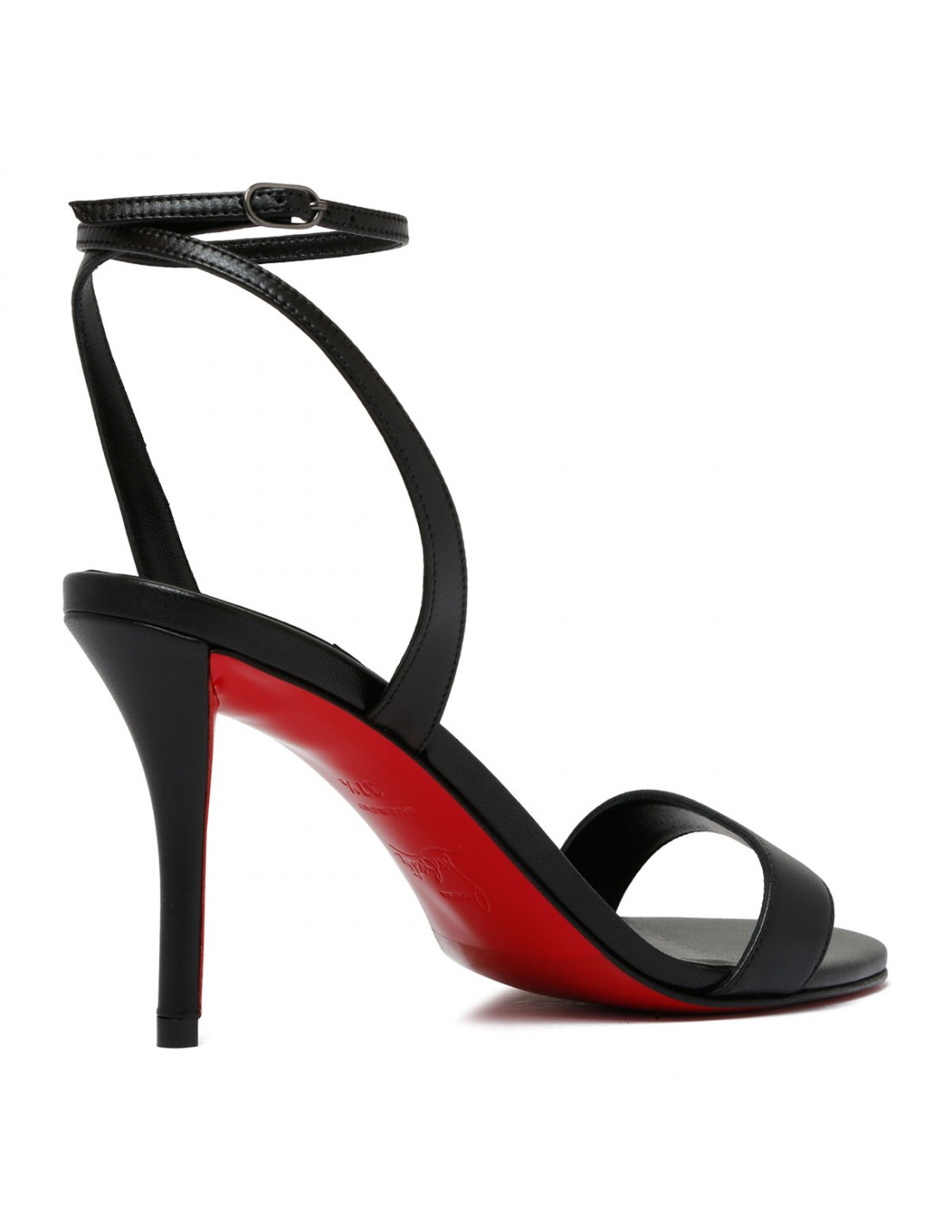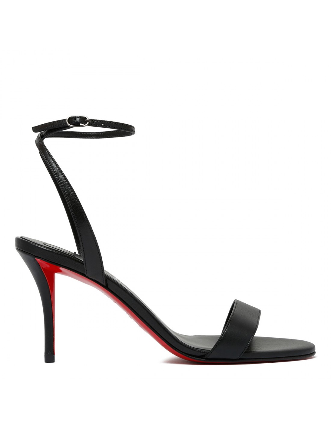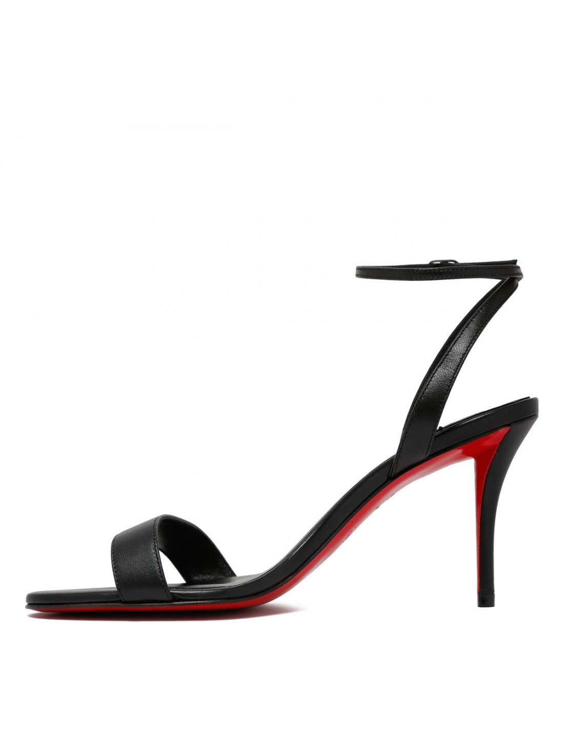 Black nappa Miss Z sandals from Christian Louboutin featuring slim heel strap with buckle closure, almond open toe, 80 stiletto heel, padded leather insole, iconic red leather outsole.