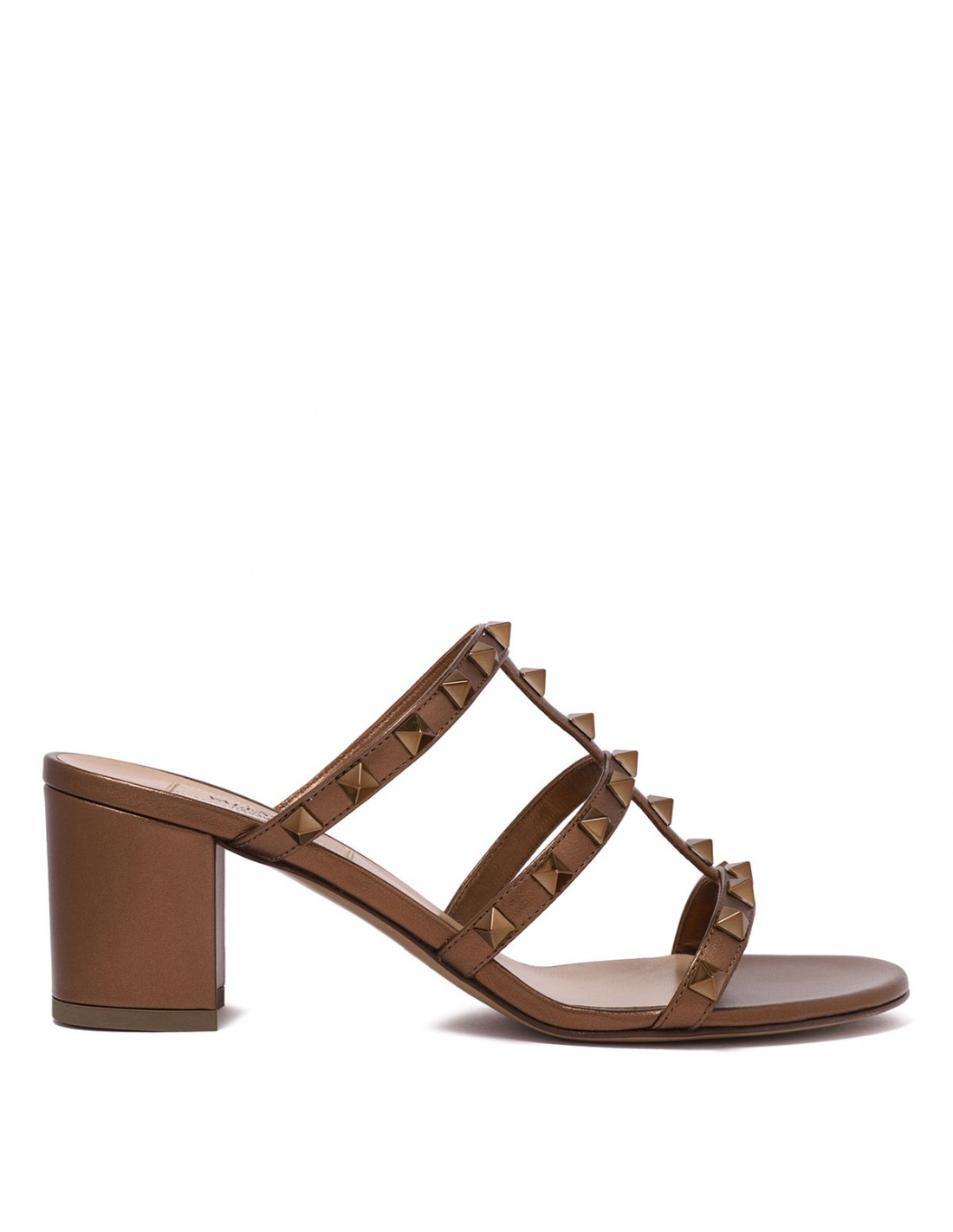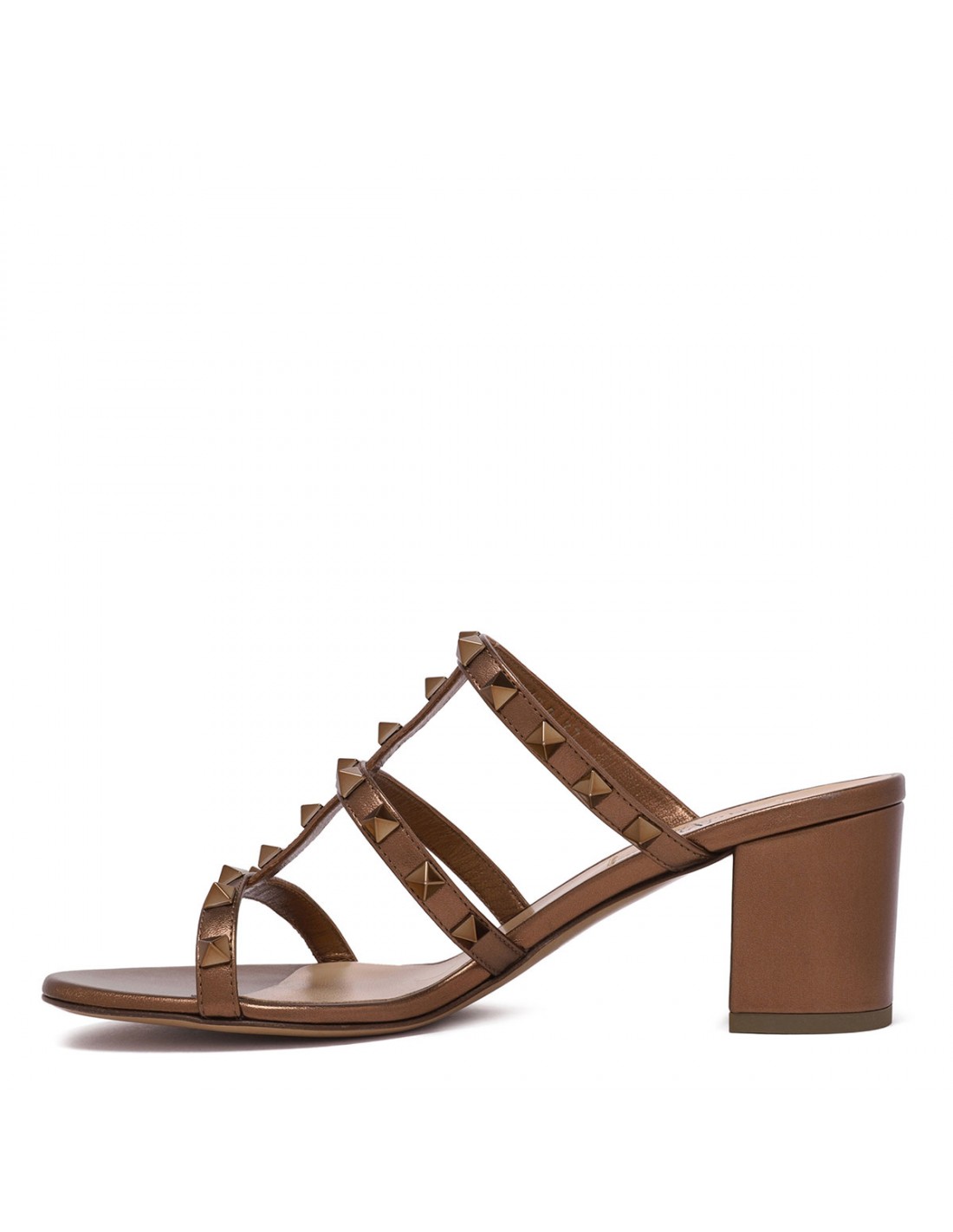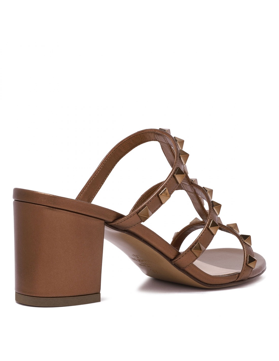 Dark bronze hue laminated nappa leather Rockstud slide sandals from Valentino Garavani featuring tonale studs, round open toe, slip on design, 60 block heel, leather insole and sole.
