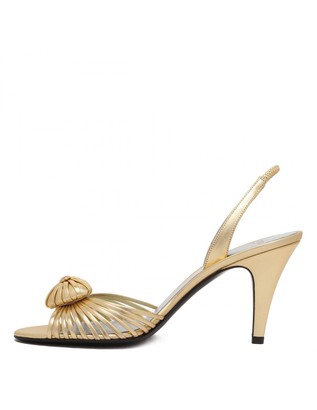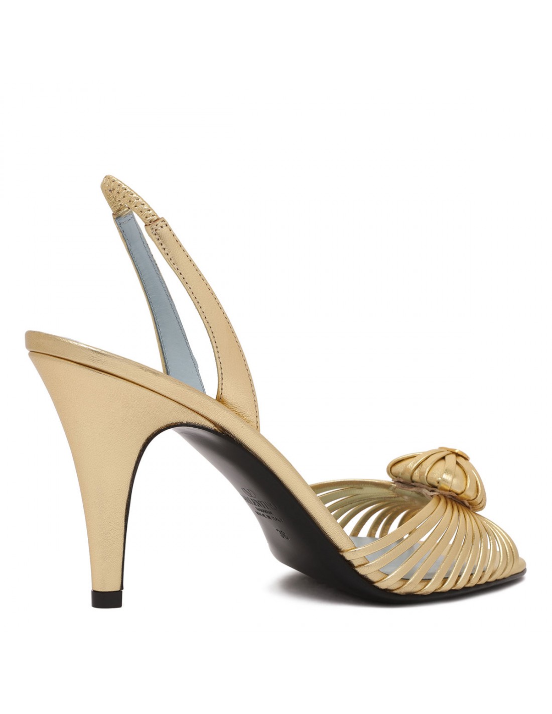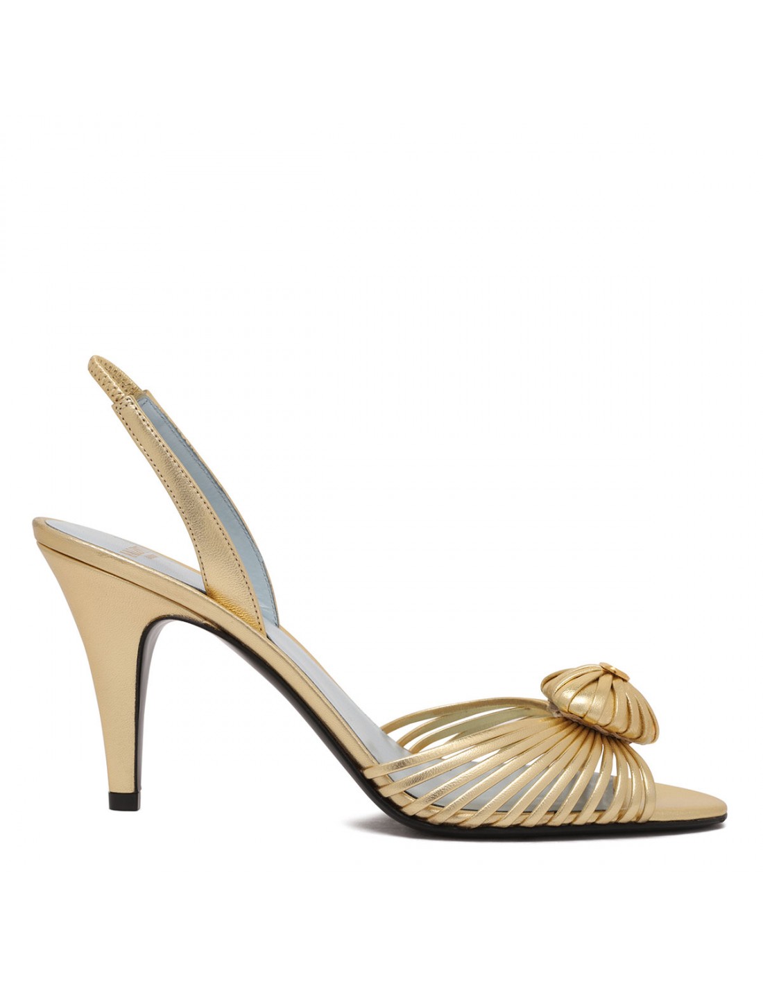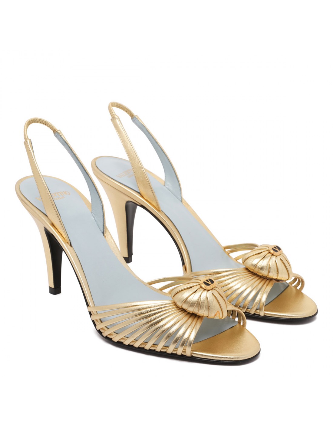 Laminated nappa leather Royal sandals from Valentino Garavani featuring heart detail wrapped with leather mignon and antique-effect brass finish VLogo signature, almond open toe, slingback strap with elastic insert, leather insole and sole.