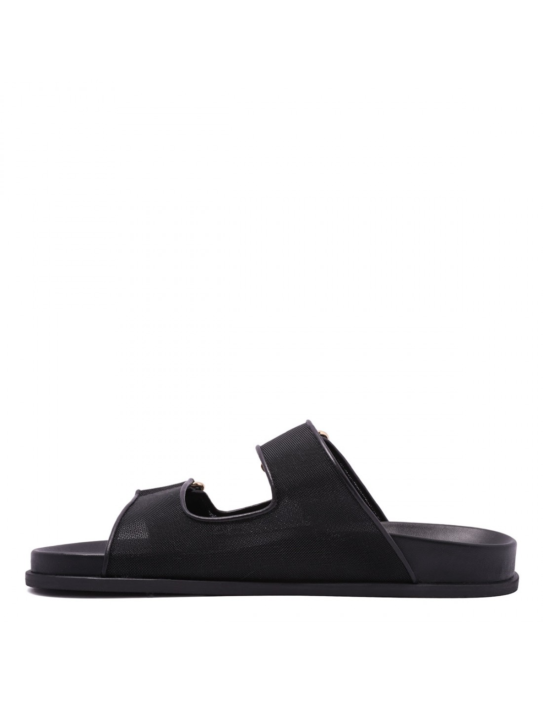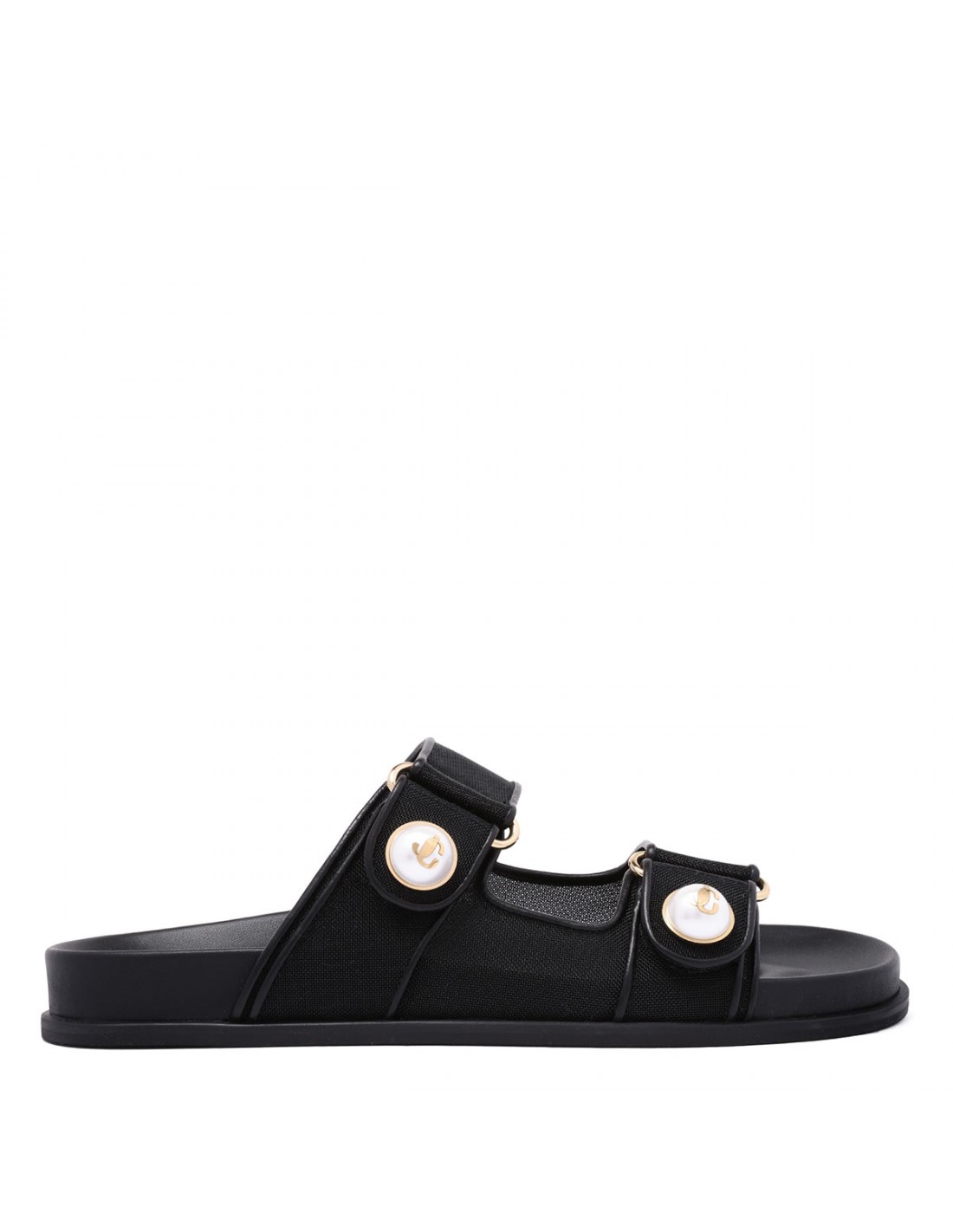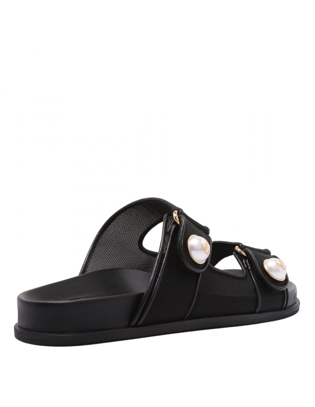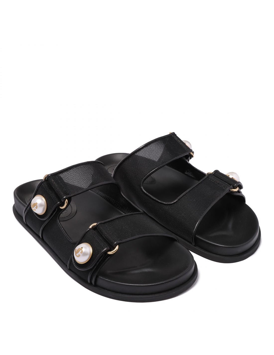 Black mesh and patent leather Fayence slide sandals from Jimmy Choo featuring JC pearl embellishment, double strap fastening, round open toe, moulded insole and rubber sole.