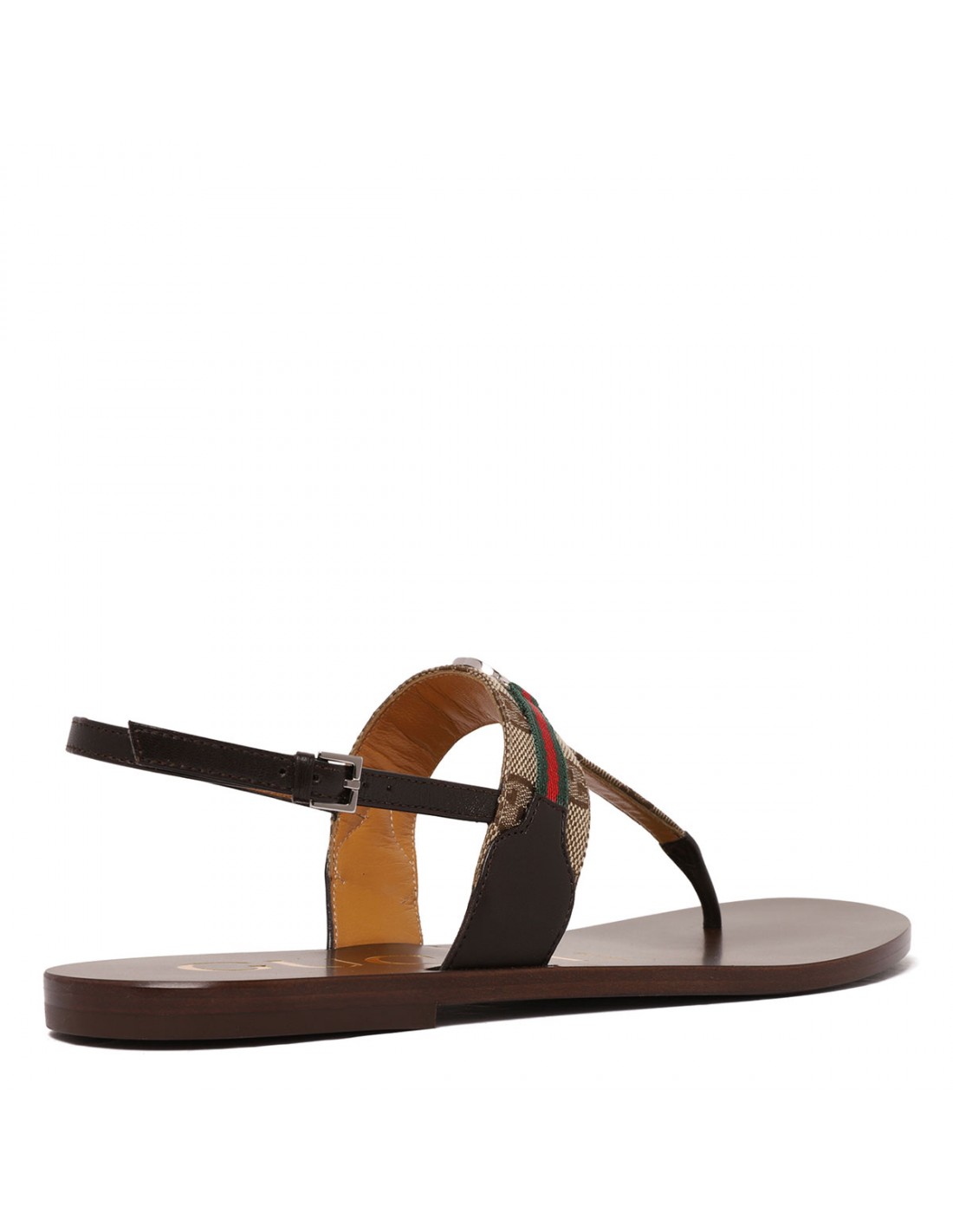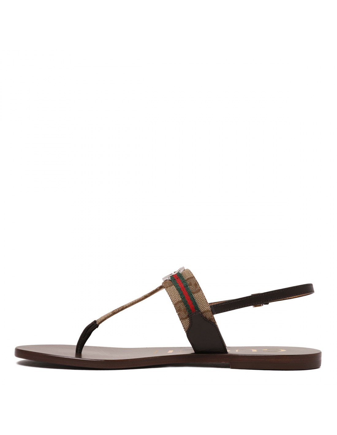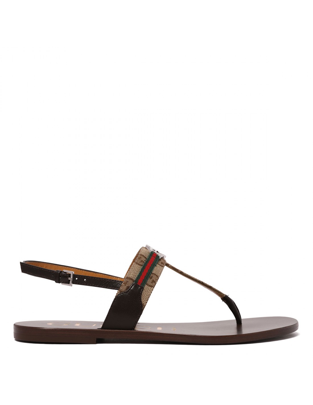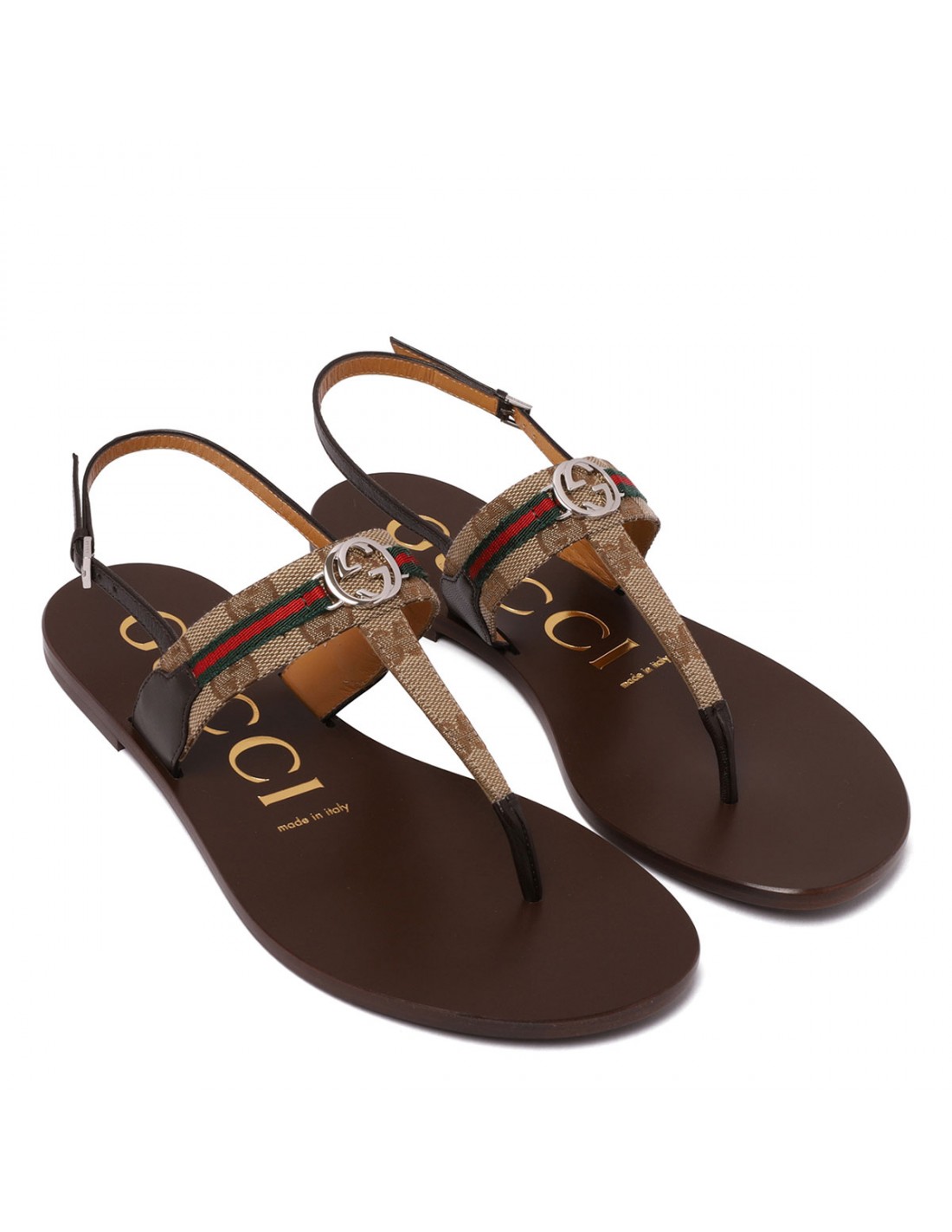 Beige and ebony Original GG canvas sandals from Gucci featuring green and red web, palladium-toned interlocking G and hardware, brown leather trim, adjustable buckle closure, leather lining, leather flat sole.
