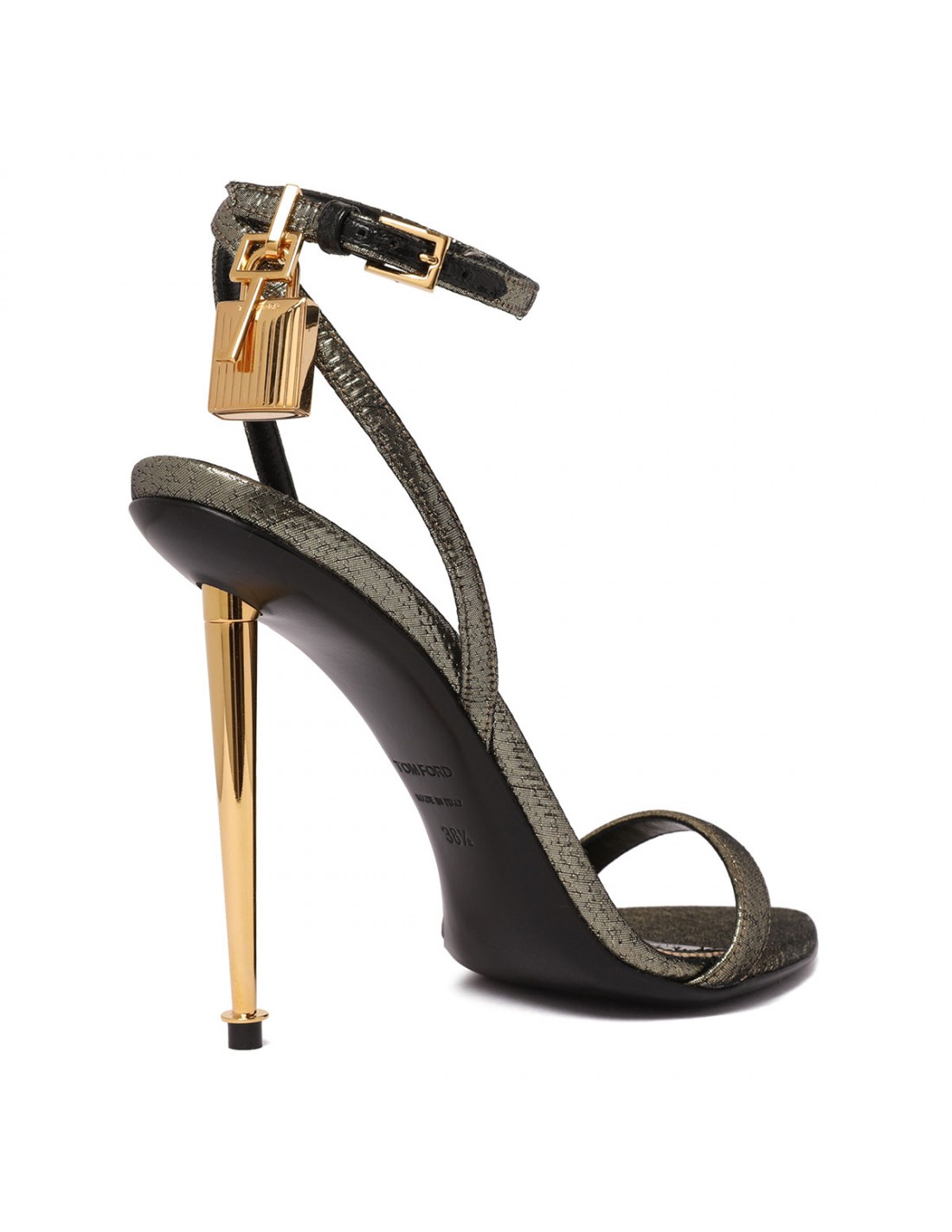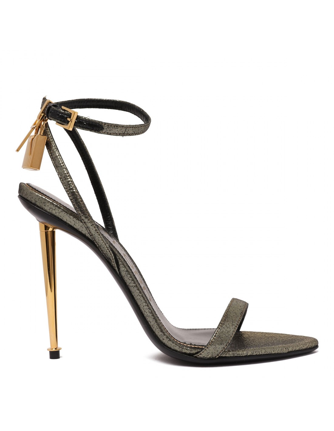 Dark gold leather Padlock sandals from Tom Ford featuring signature padlock metal hardware, iconic metal spike stiletto heel, pointed open toe, buckle fastening ankle strap, leather insole and sole.