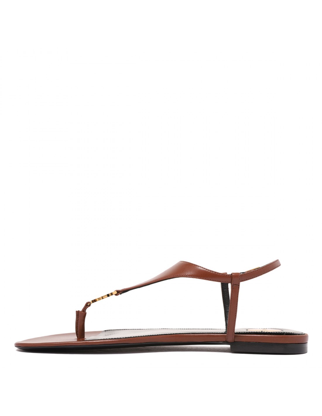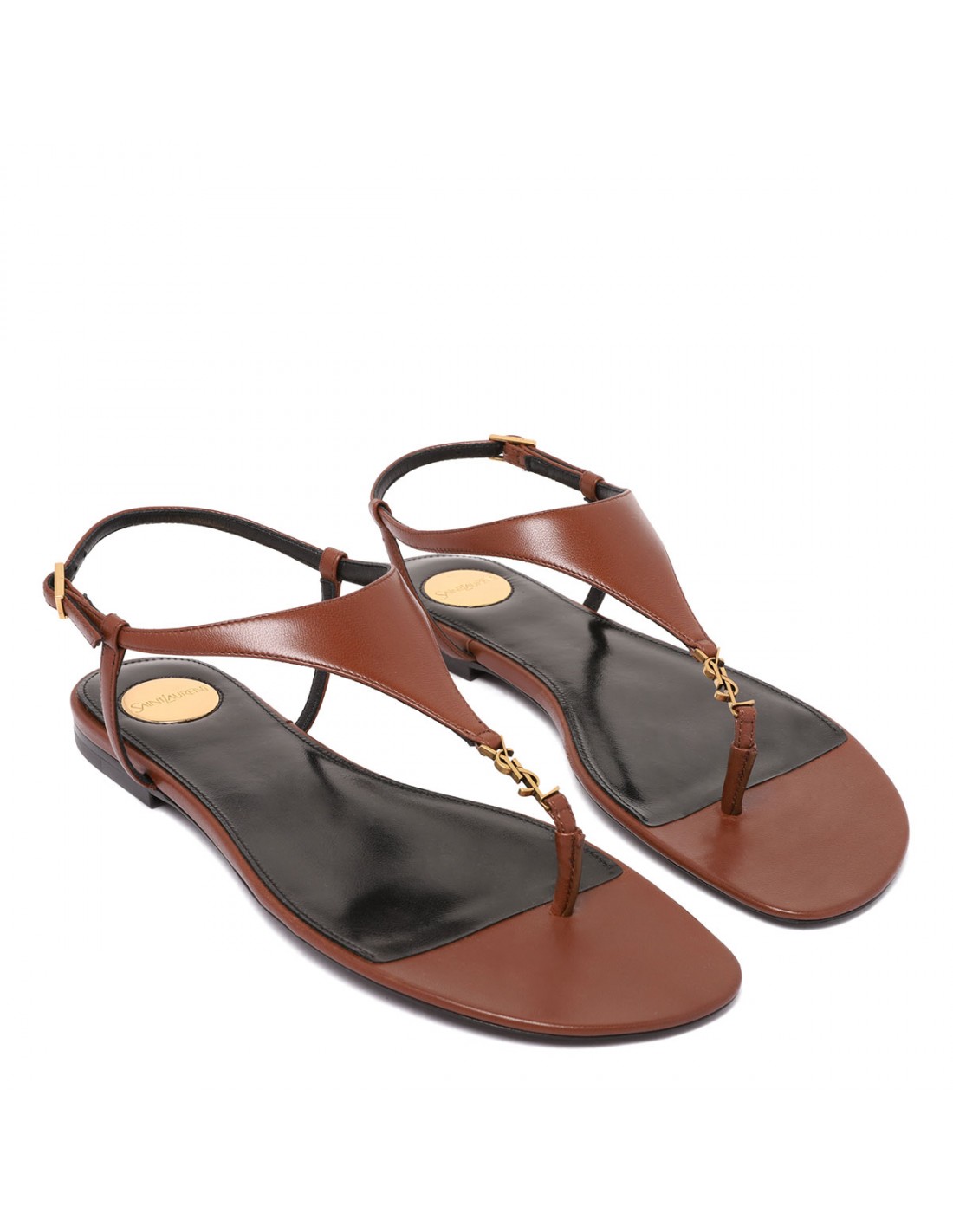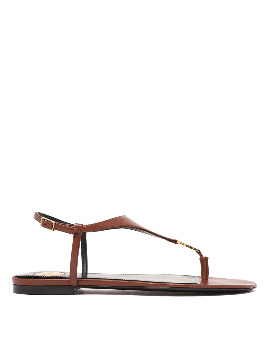 Brown leather Cassandra sandals from Saint Laurent featuring triangular upper decorated with Cassandre decoration, adjustable ankle strap with buckle closure, round Saint Laurent-engraved metal plaque on insole, leather sole.