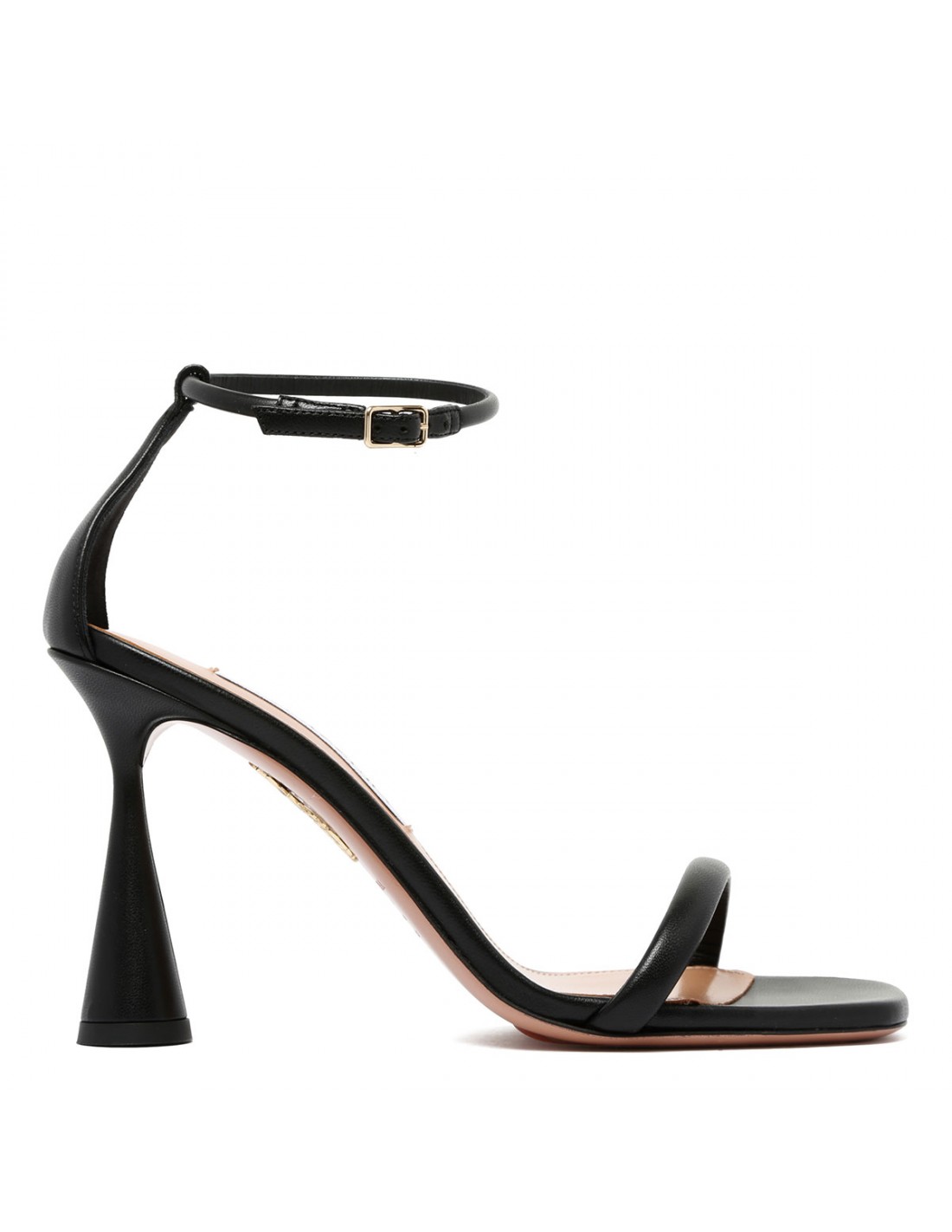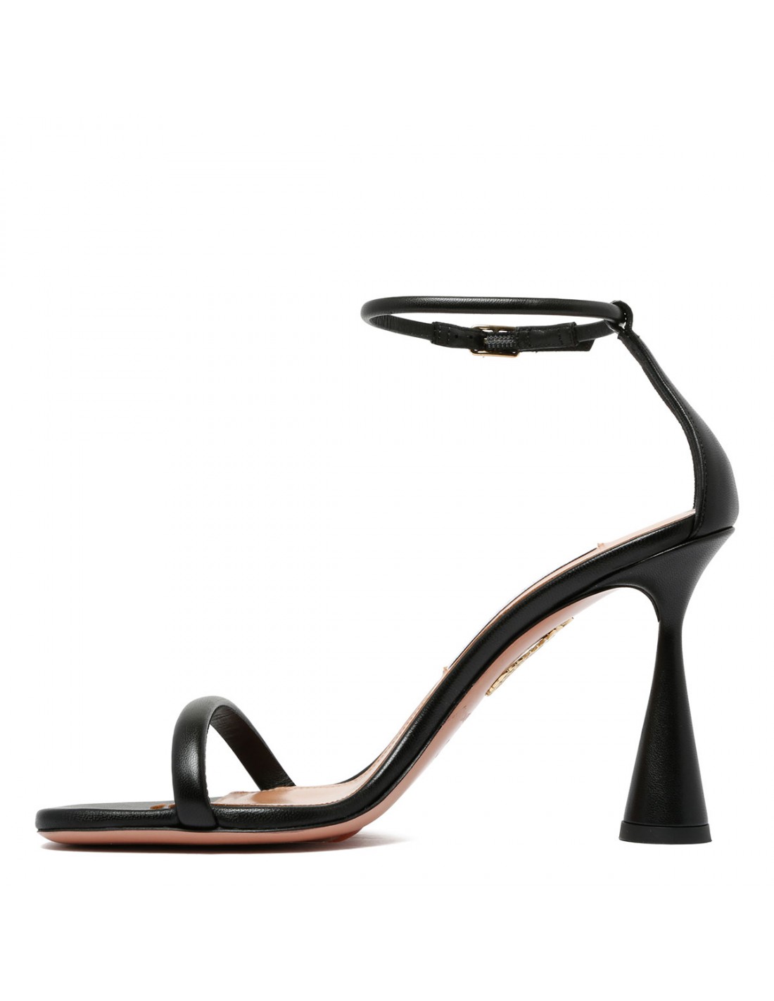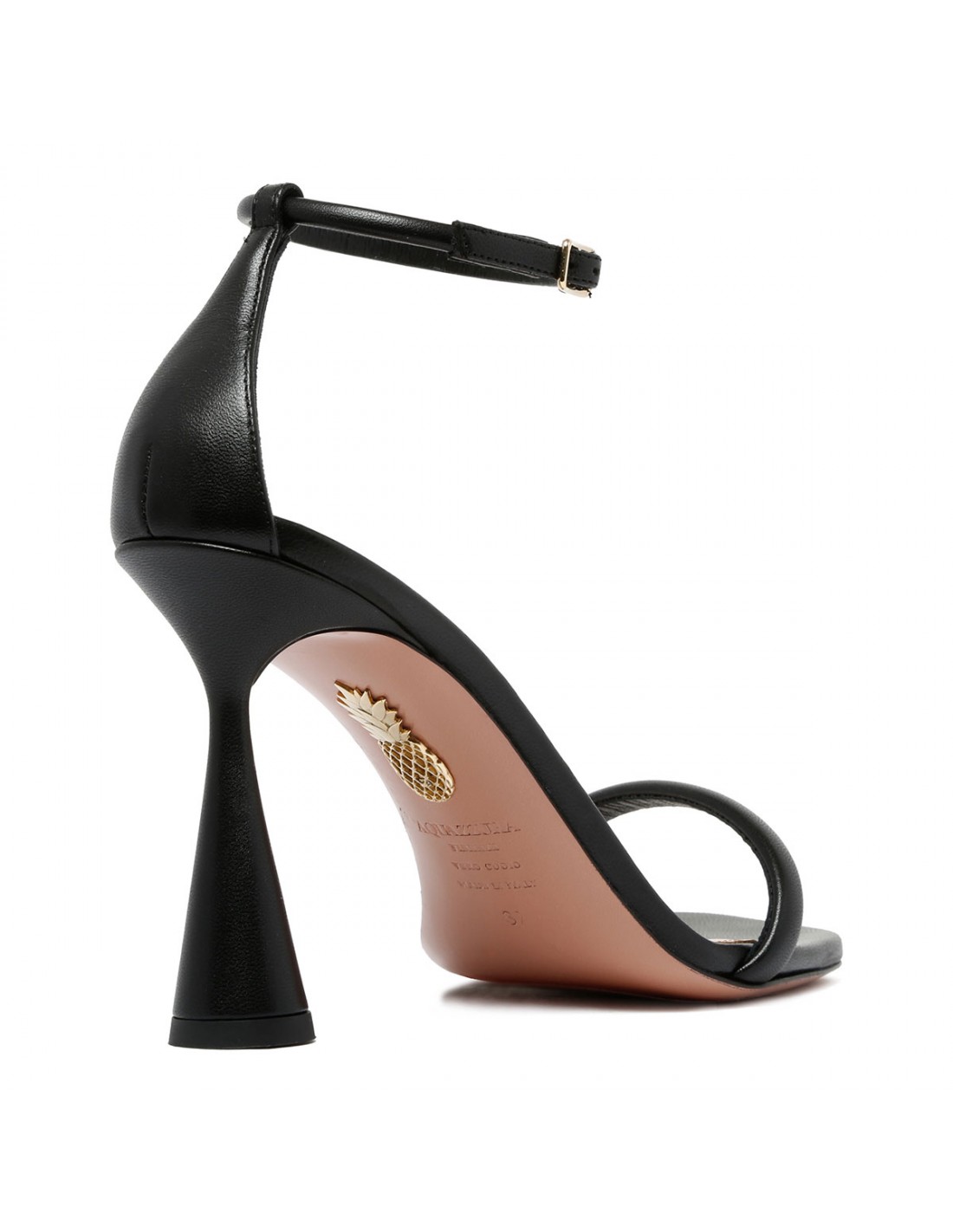 Black leather Hot sandals from Aquazzura featuring ultra-slim straps, buckle fastening ankle strap, squared open toe, sculptural 95 heel, padded leather insole, leather sole with pineapple logo appliqué.