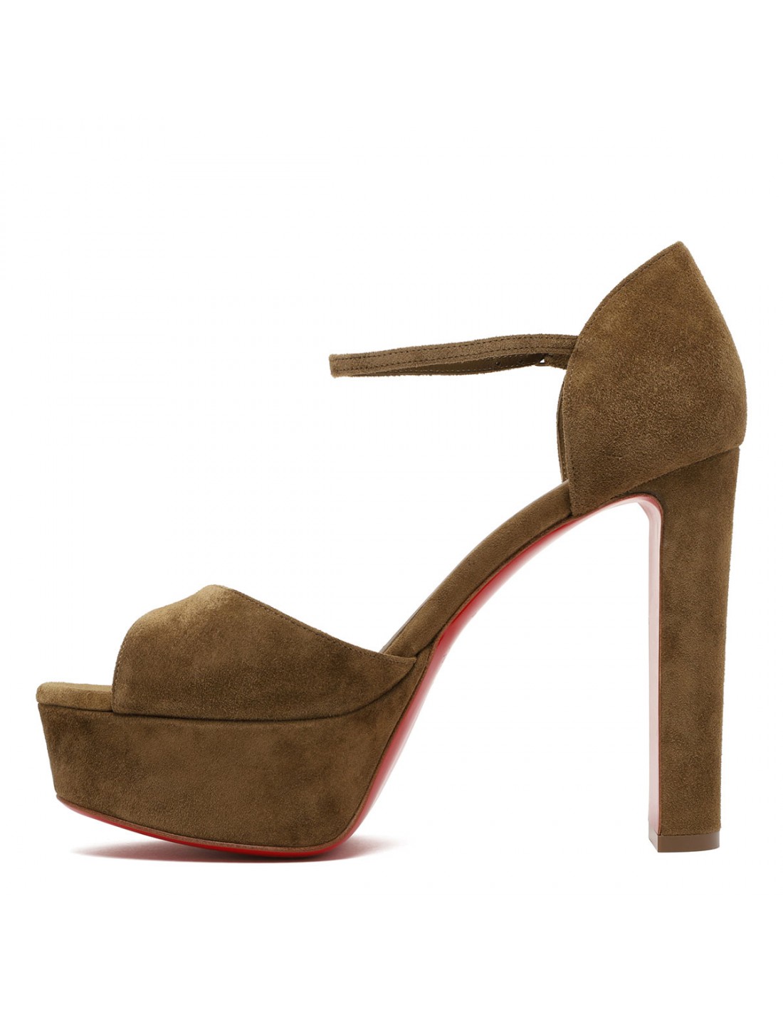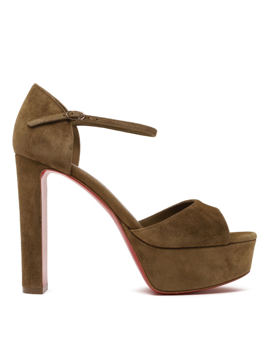 Bronzo brown hue suede Sandaloo sandals from Christian Louboutin featuring open toe, platform, slim ankle strap with buckle fastening, 130 square heel, platform, leather insole and signature red leather outsole.