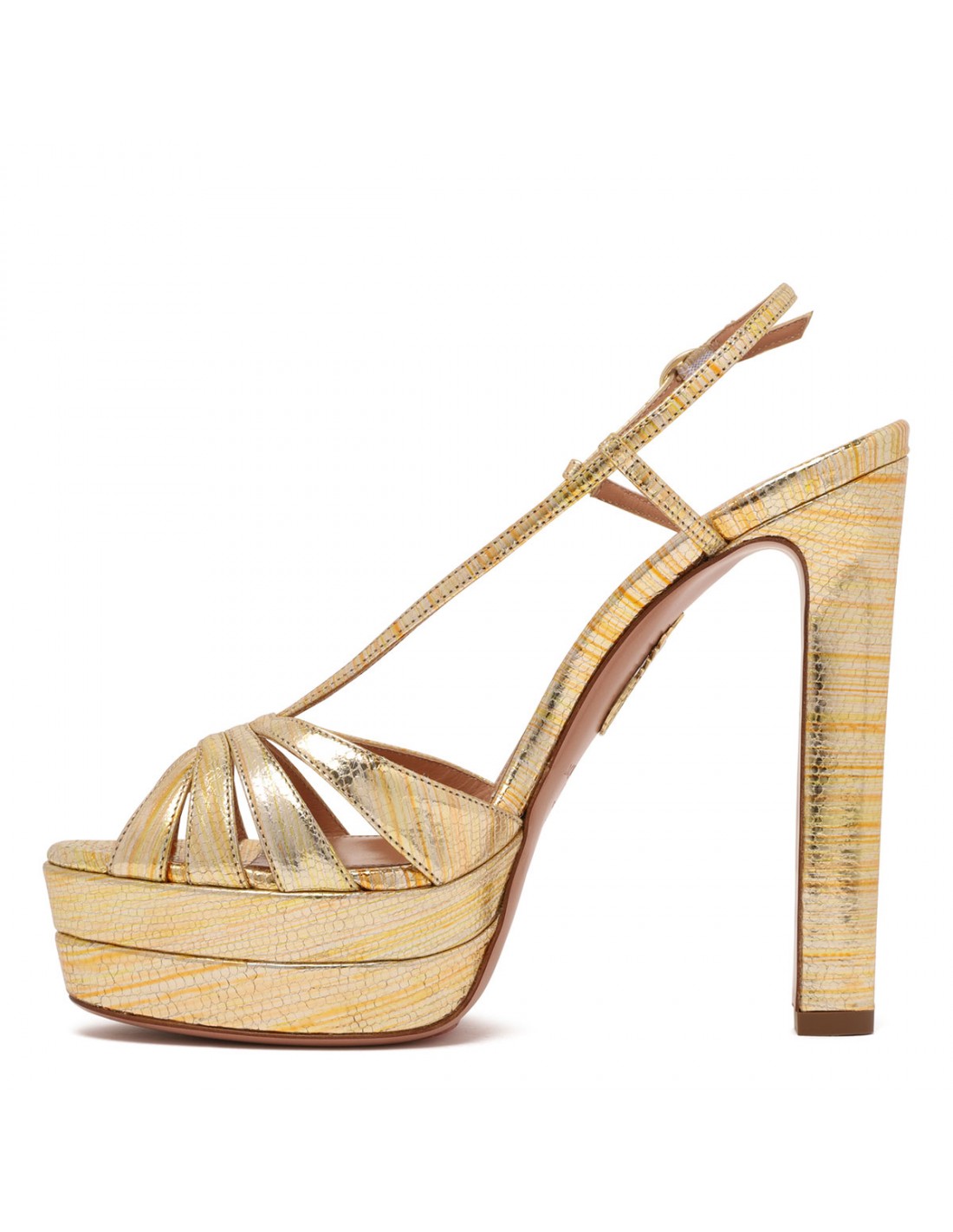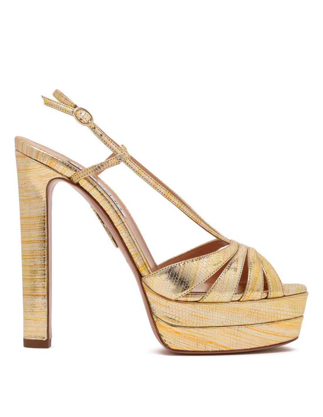 Gold-tone metal leather Aimée sandals from Aquazzura featuring snake effect, platform, open toe, cage-like straps, buckle fastening, 130 block heel, padded insole and leather sole.