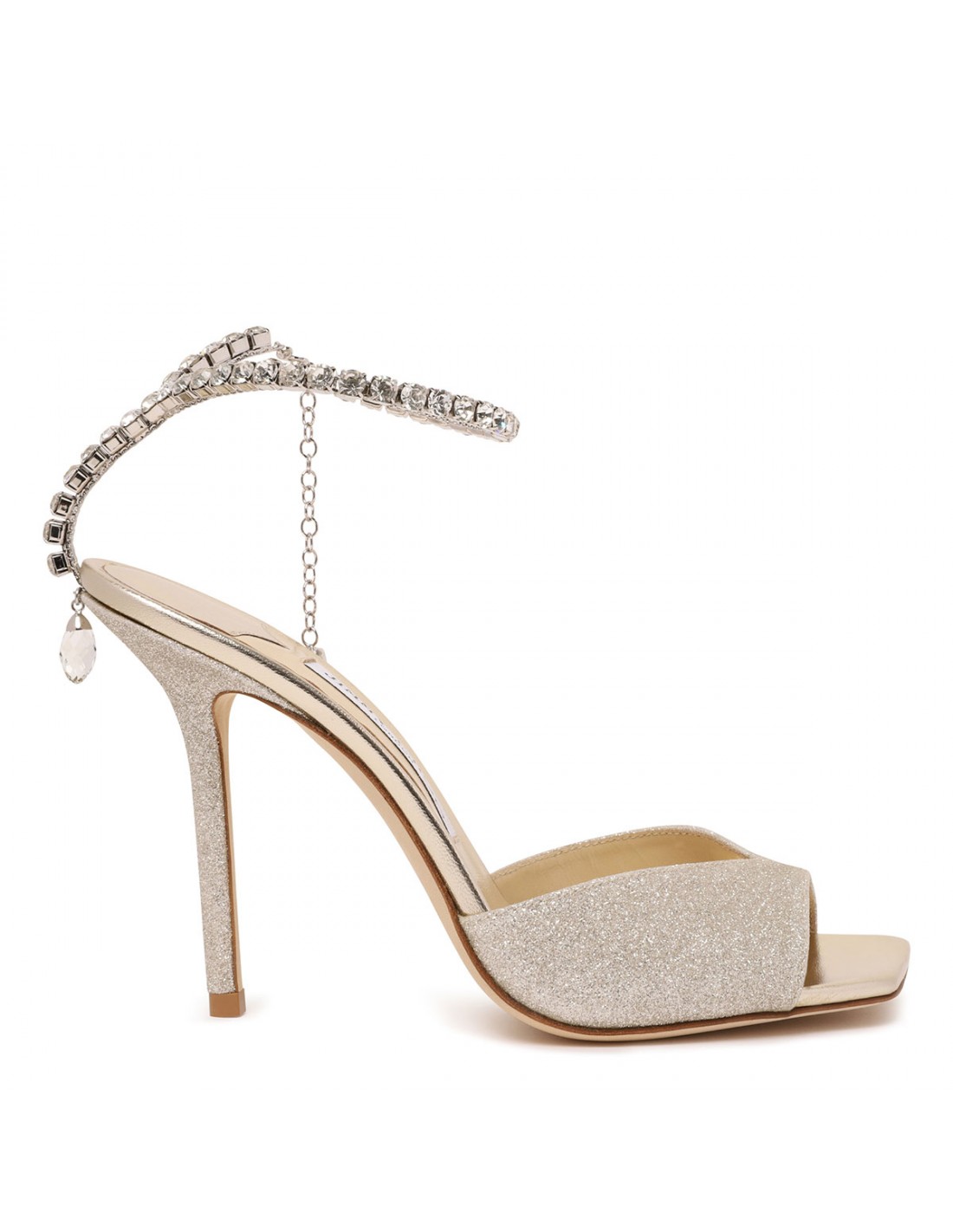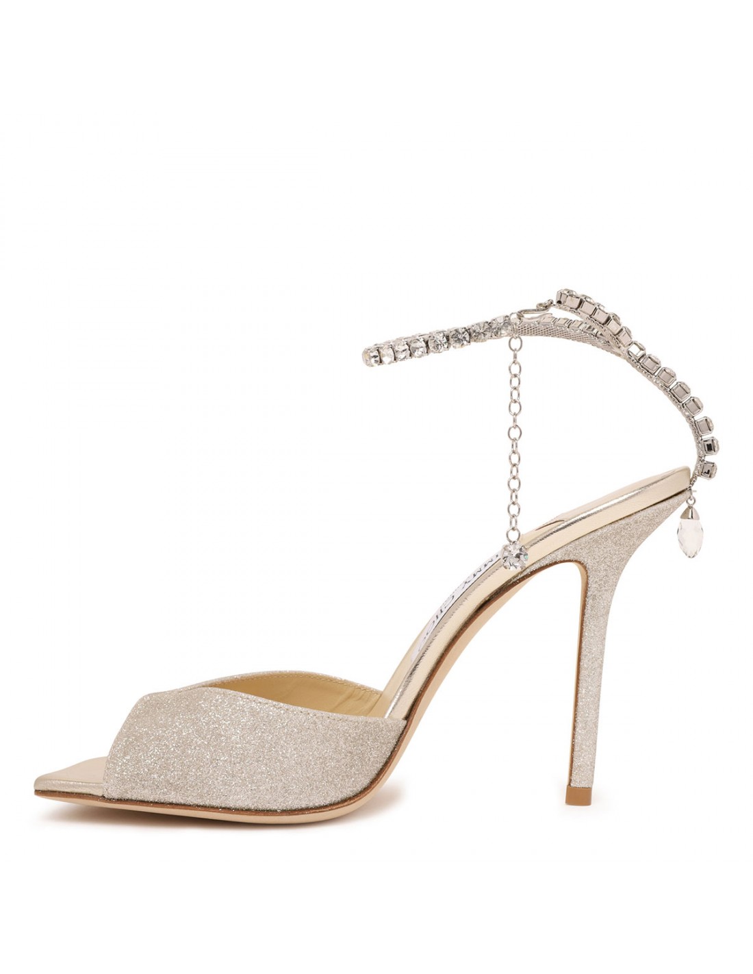 Platinum ice glittery fabric Saeda sandals from Jimmy Choo featuring crystal chain with crystal pendent, squared open toe, 100 stiletto heel, leather insole and sole.