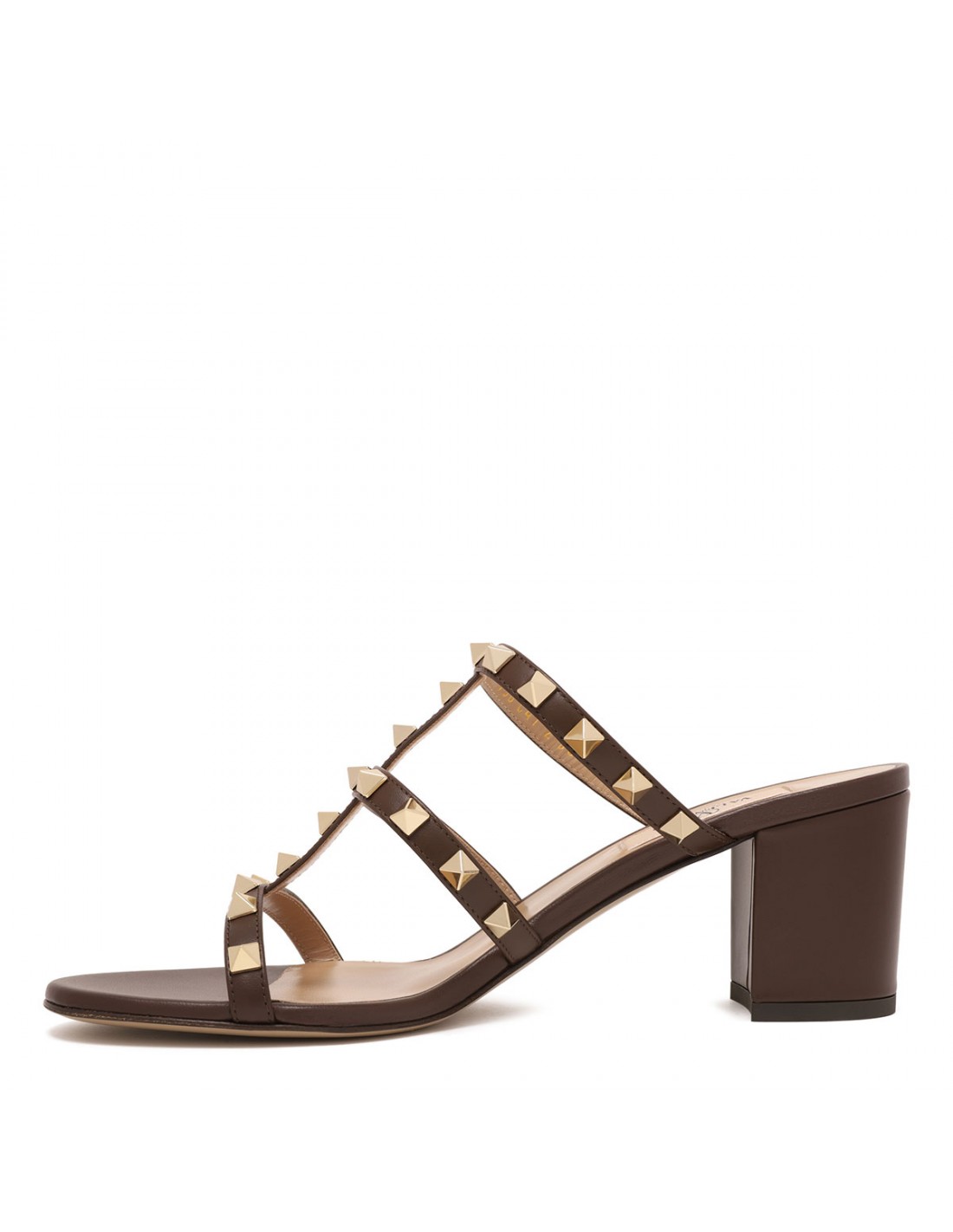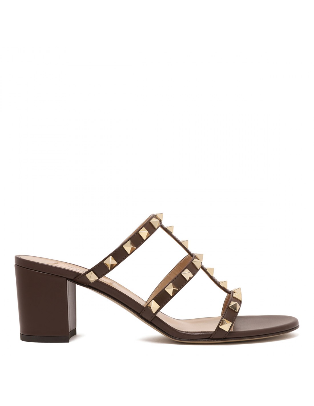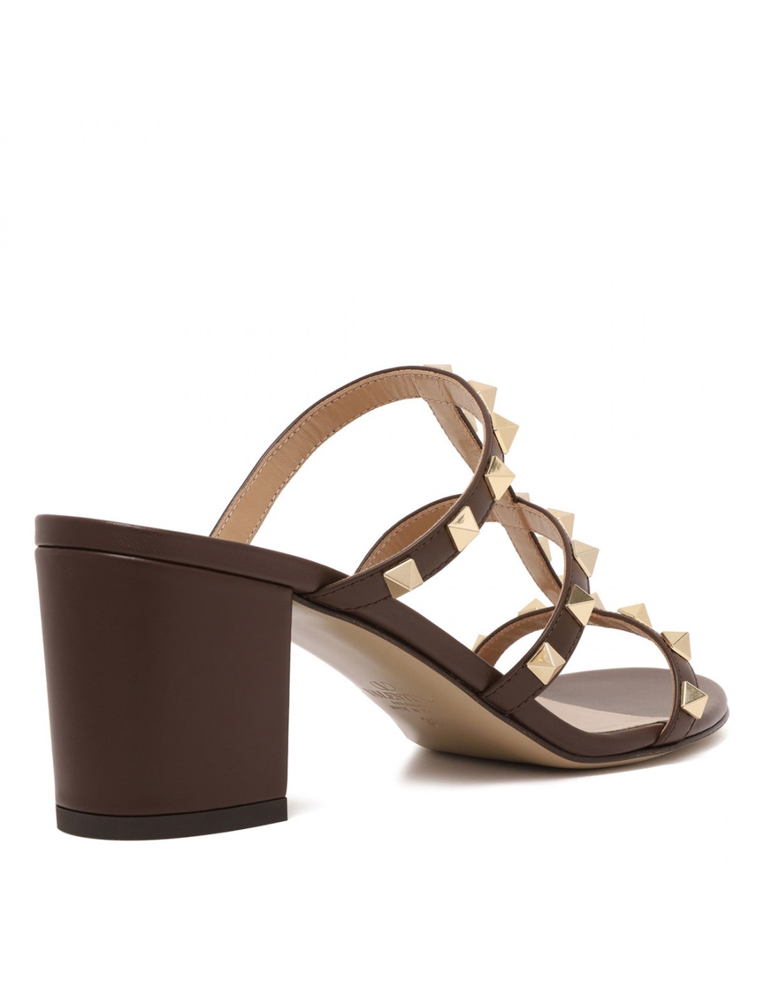 Bark brown nappa leather Rockstud slide sandals from Valentino Garavani featuring platinum finish studs, round open toe, slip on design, 60 block heel, leather insole and sole.