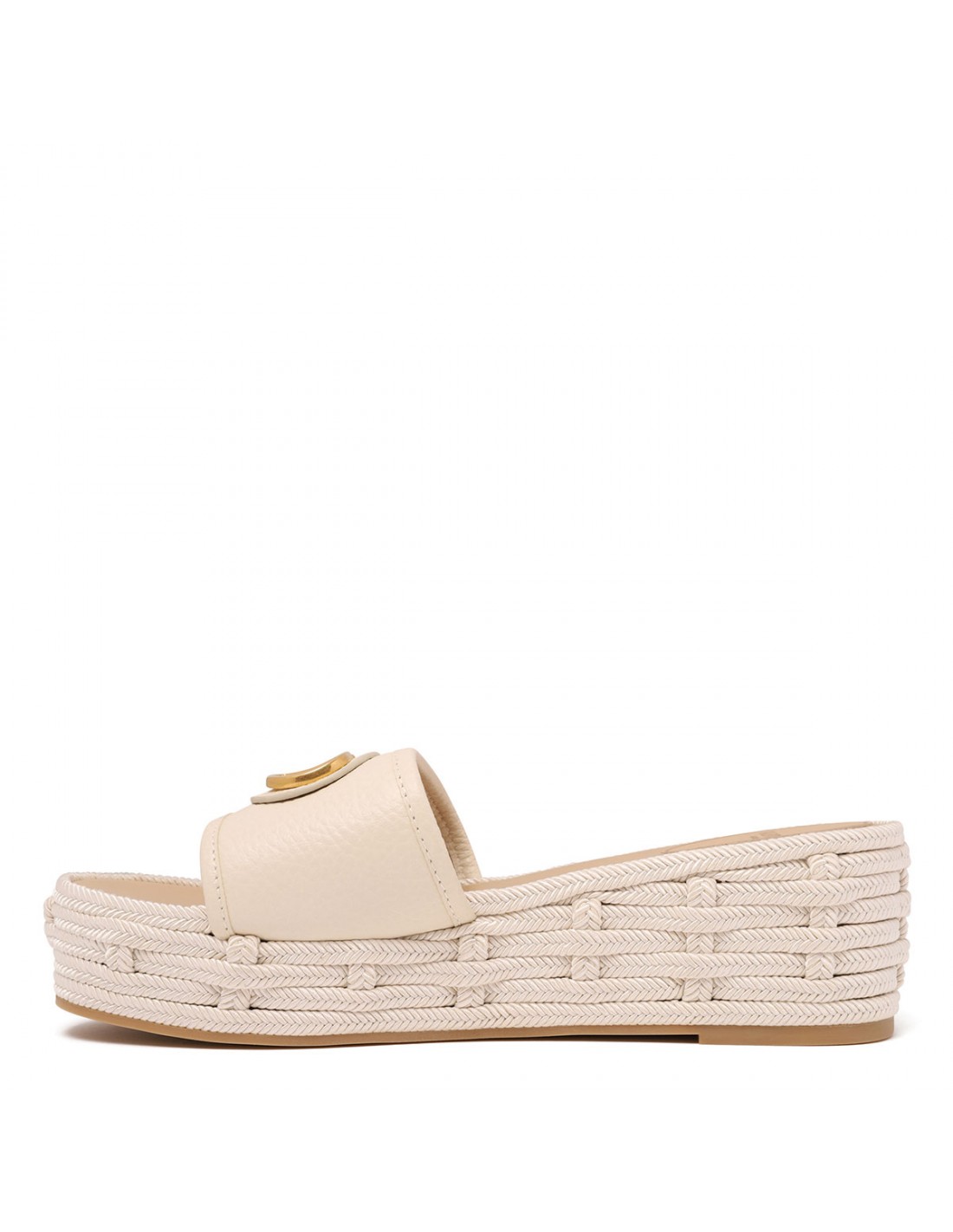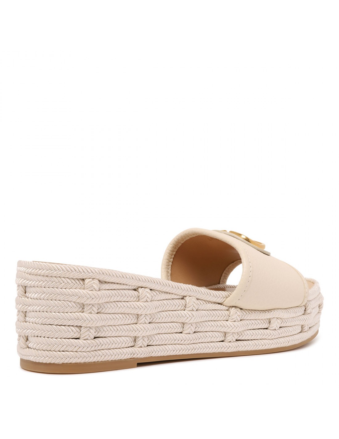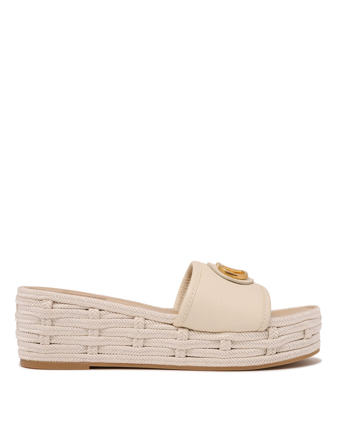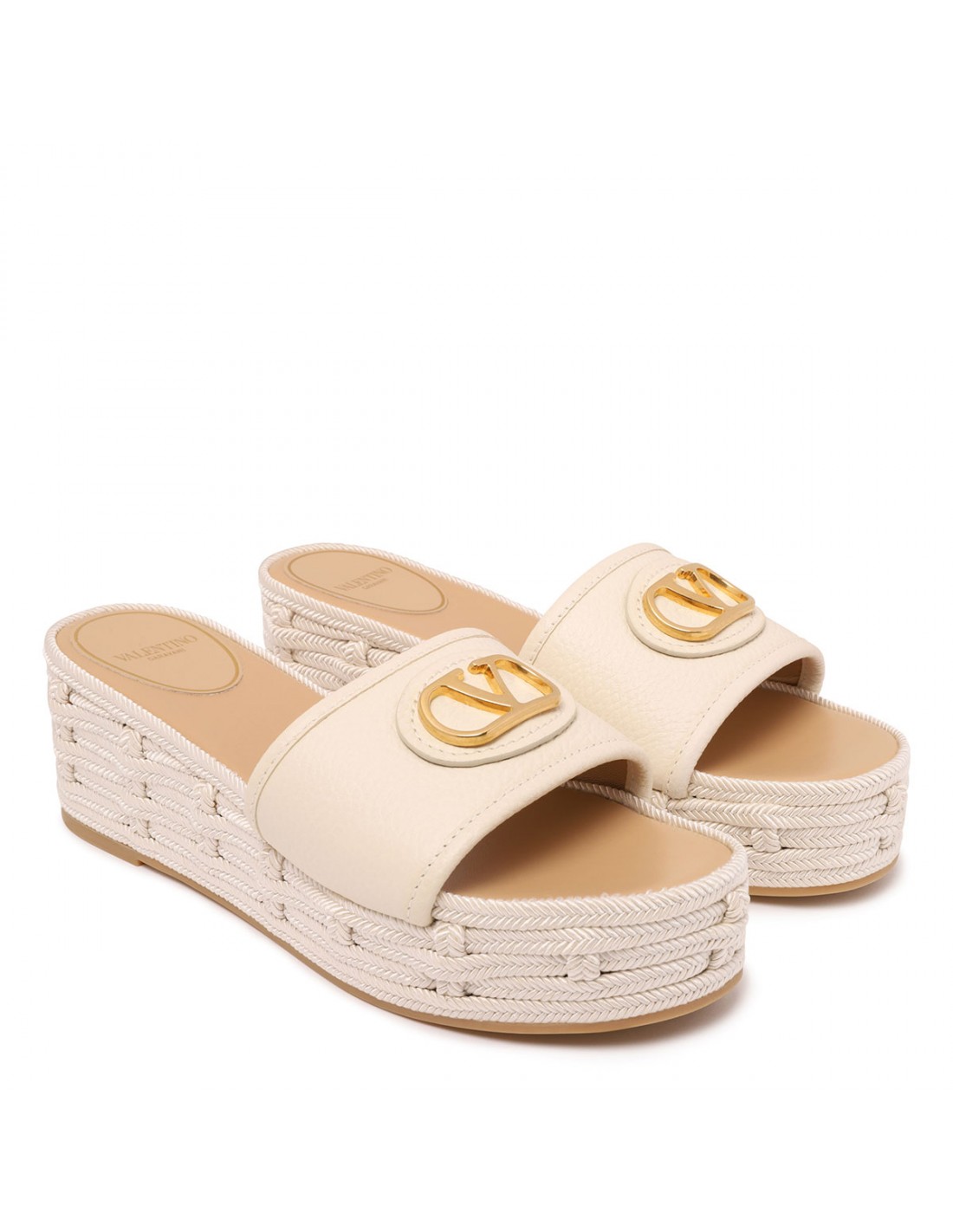 Light ivory leather slide espadrillas from Valentino Garavani featuring VLogo signature detail, open almond toe, woven rope platform, leather insole and rubber outsole.