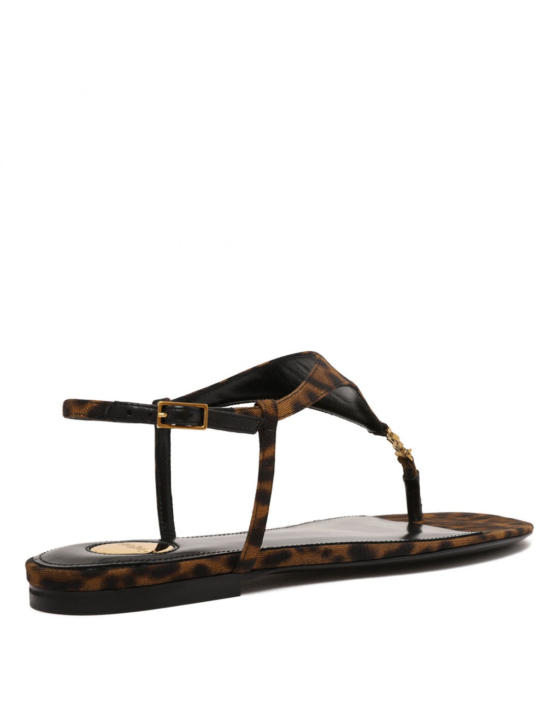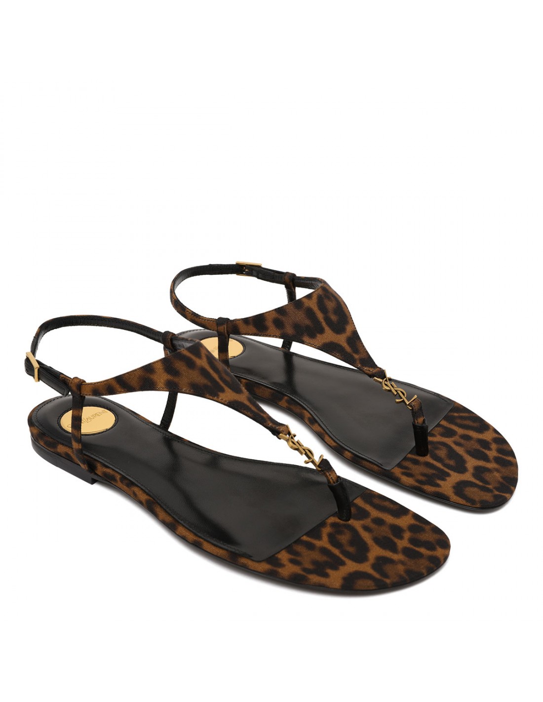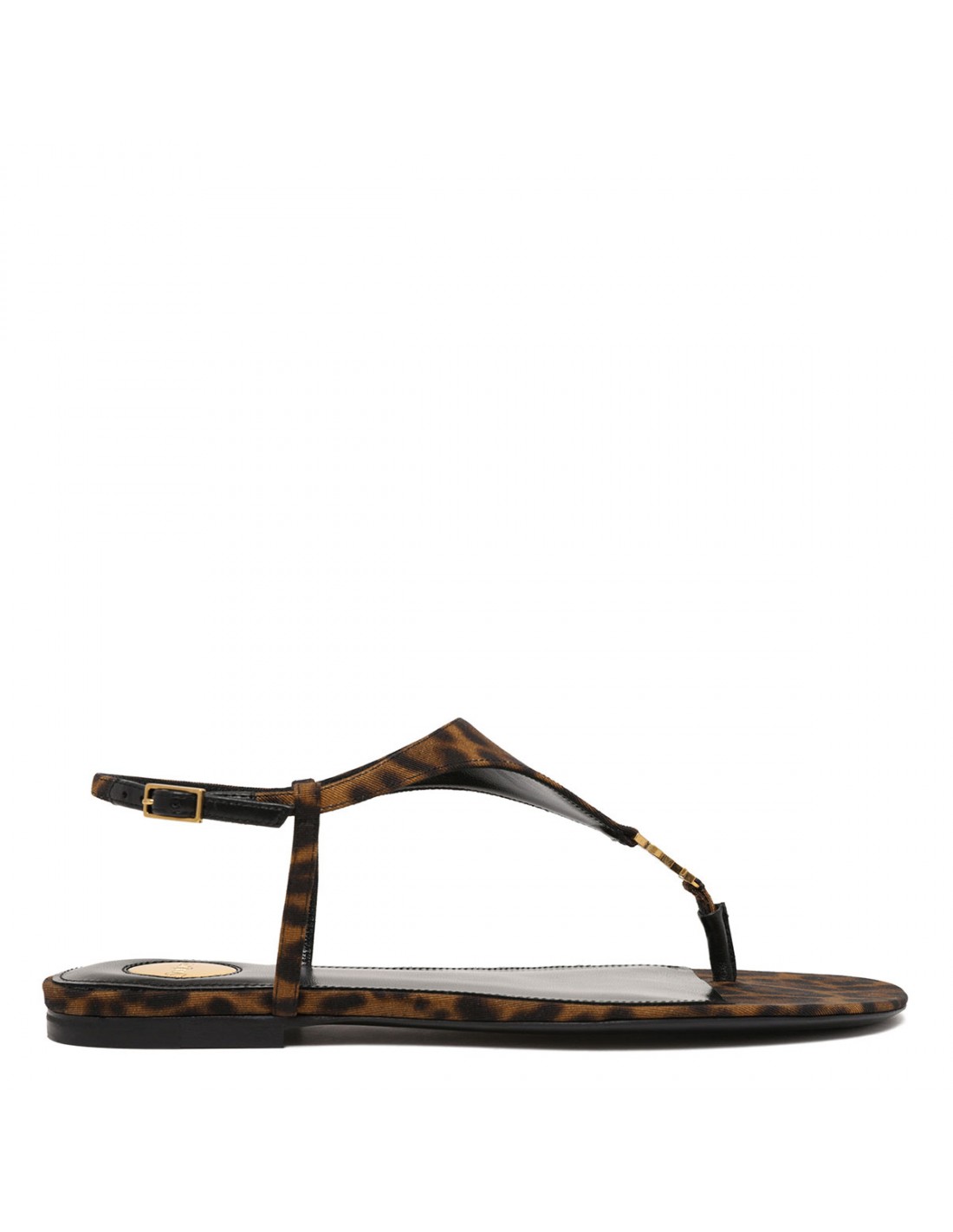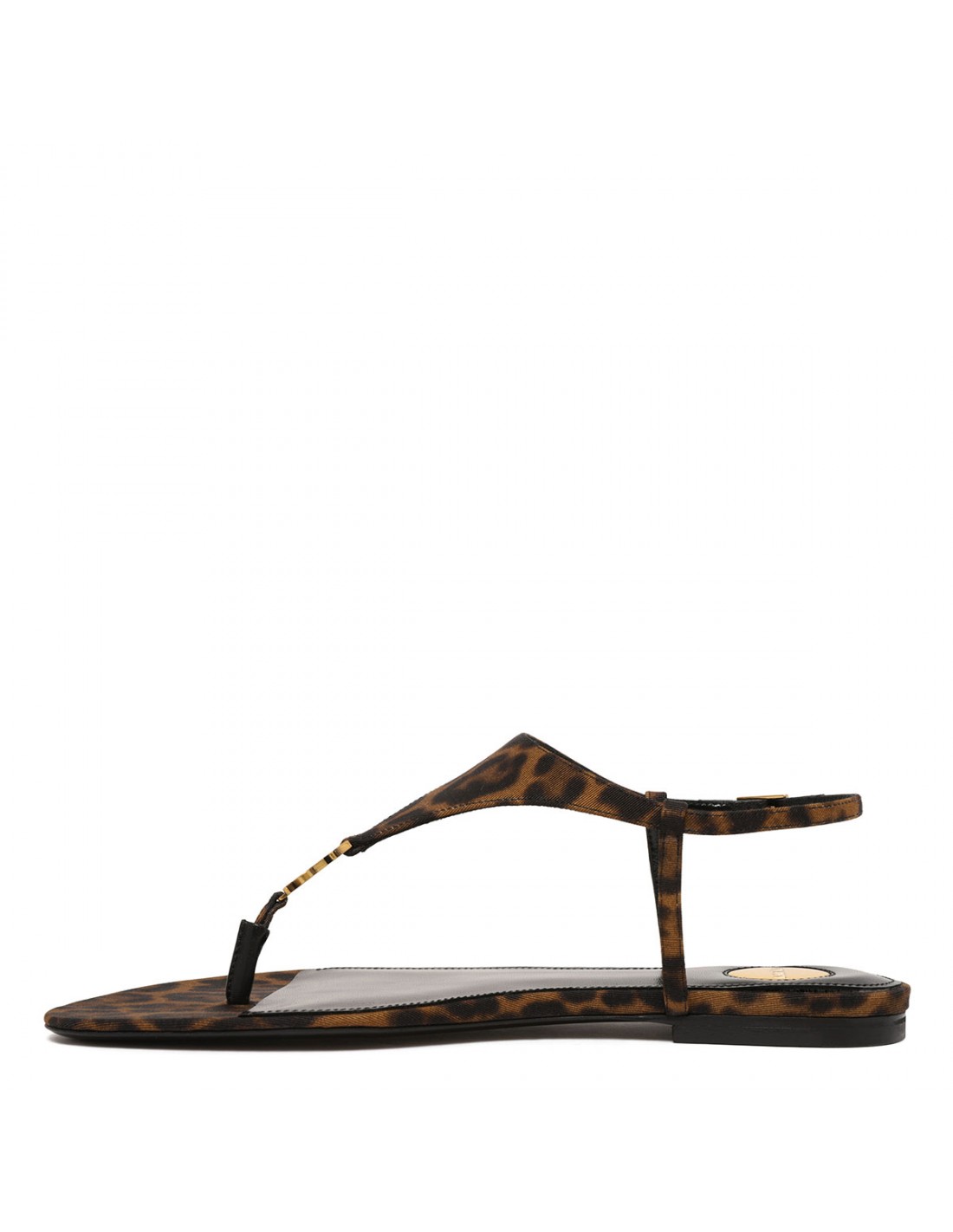 Leopard-print viscose thong sandals from Saint Laurent featuring triangular upper decorated with metal Cassandre, adjustable ankle strap with buckle fastening, logo engraved metal plaque on insole, leather sole.