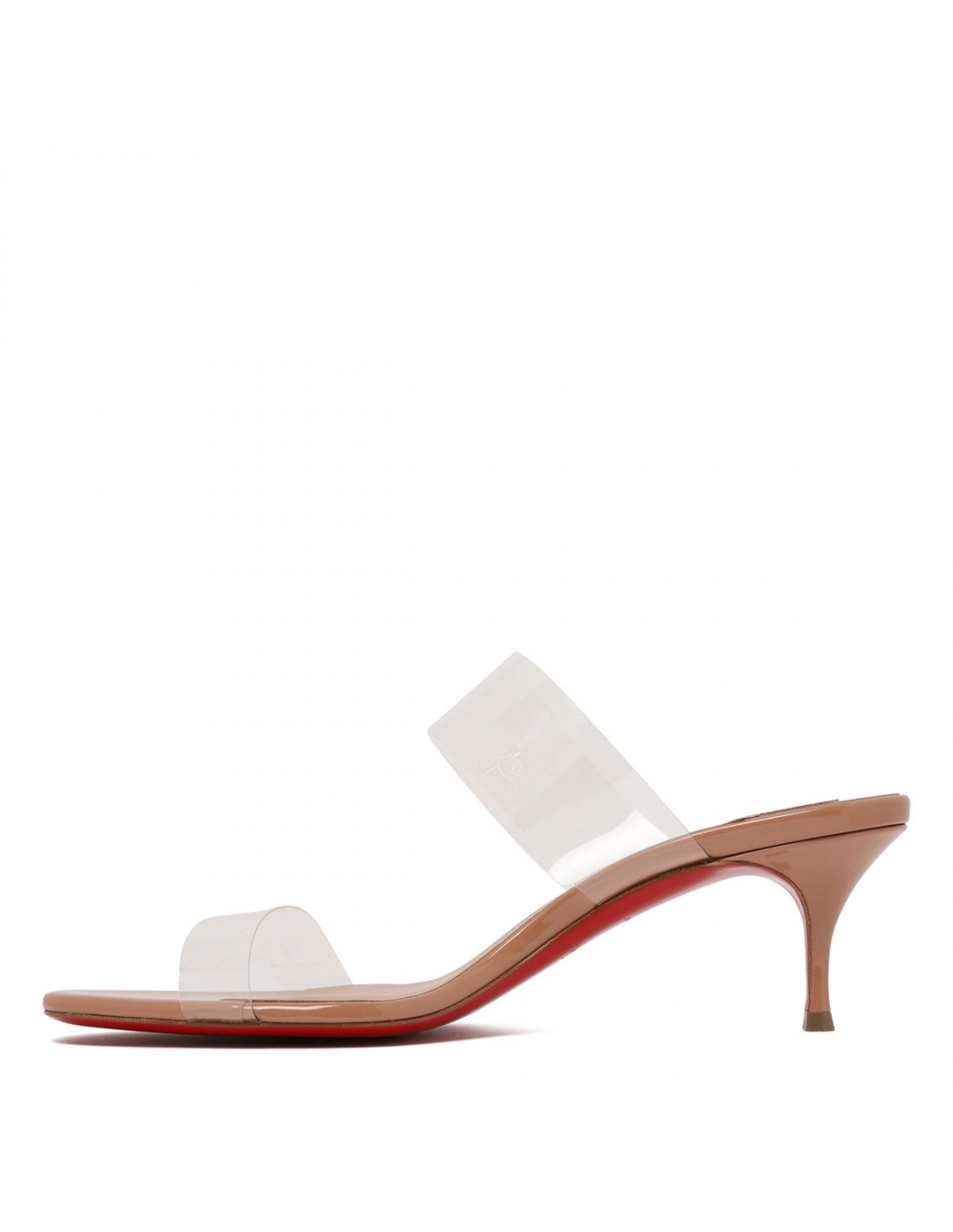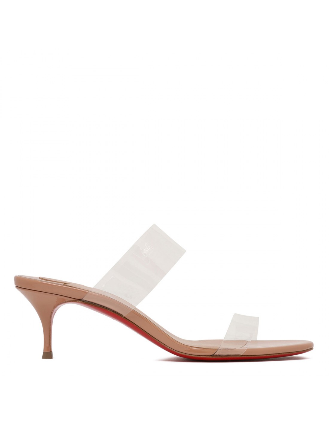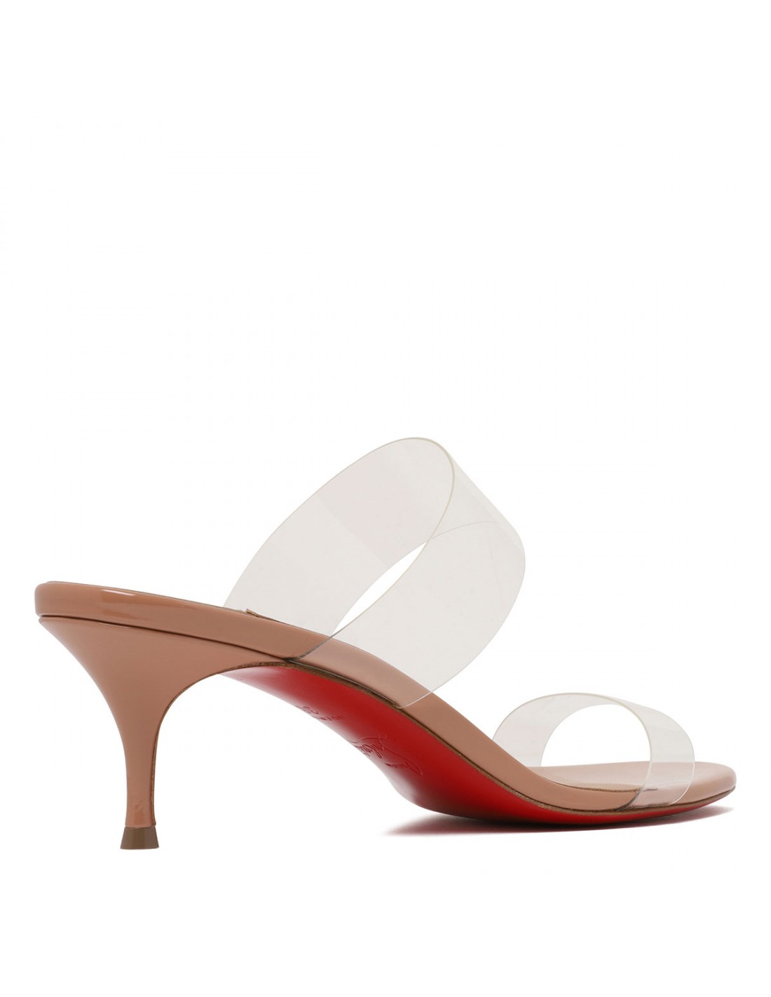 Blush beige patent leather Just Nothing mule sandals from Christian Louboutin featuring barely-there upper, two see-through soft TPU straps, almond open toe, slim 55 heel, leather insole, signature red leather outsole.