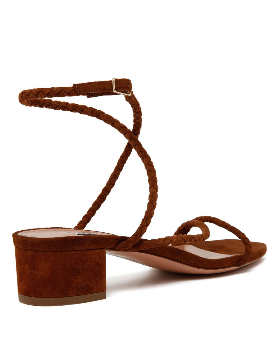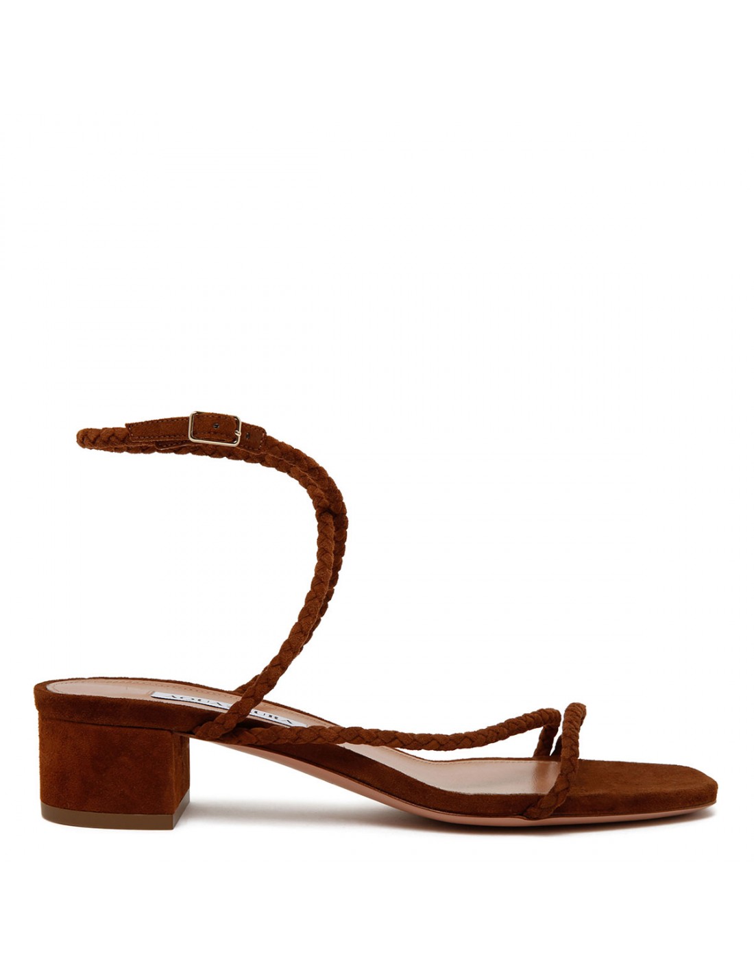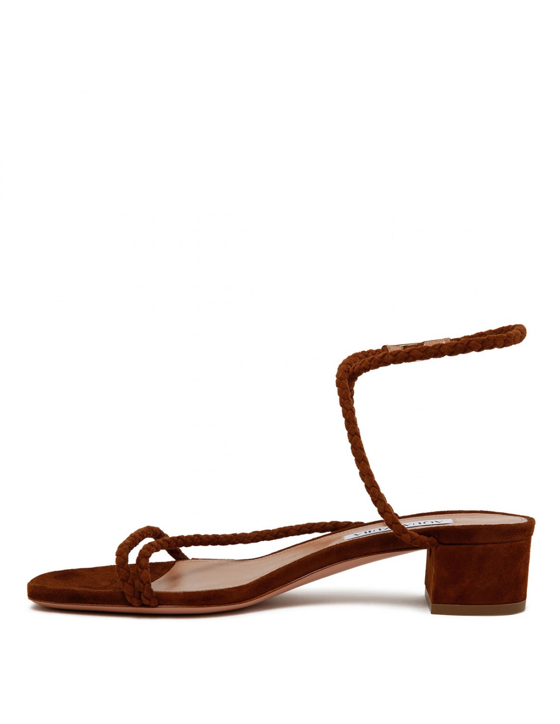 Brown suede leather Luca sandals from Aquazzura featuring braided straps wrap around the foot, barely-there silhouette, squared open toe, 35 block heel, cushioned leather insole, leather sole with logo.