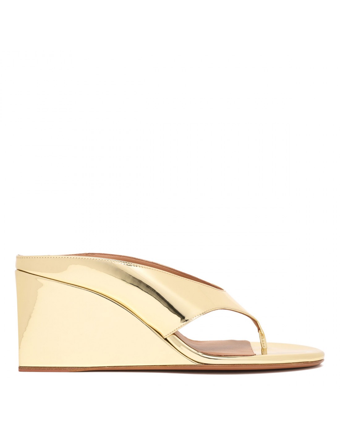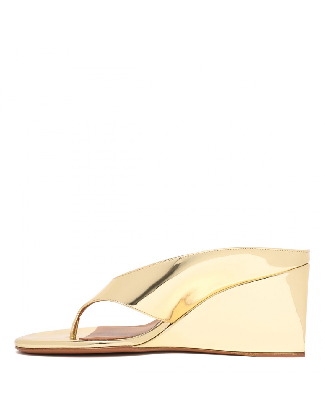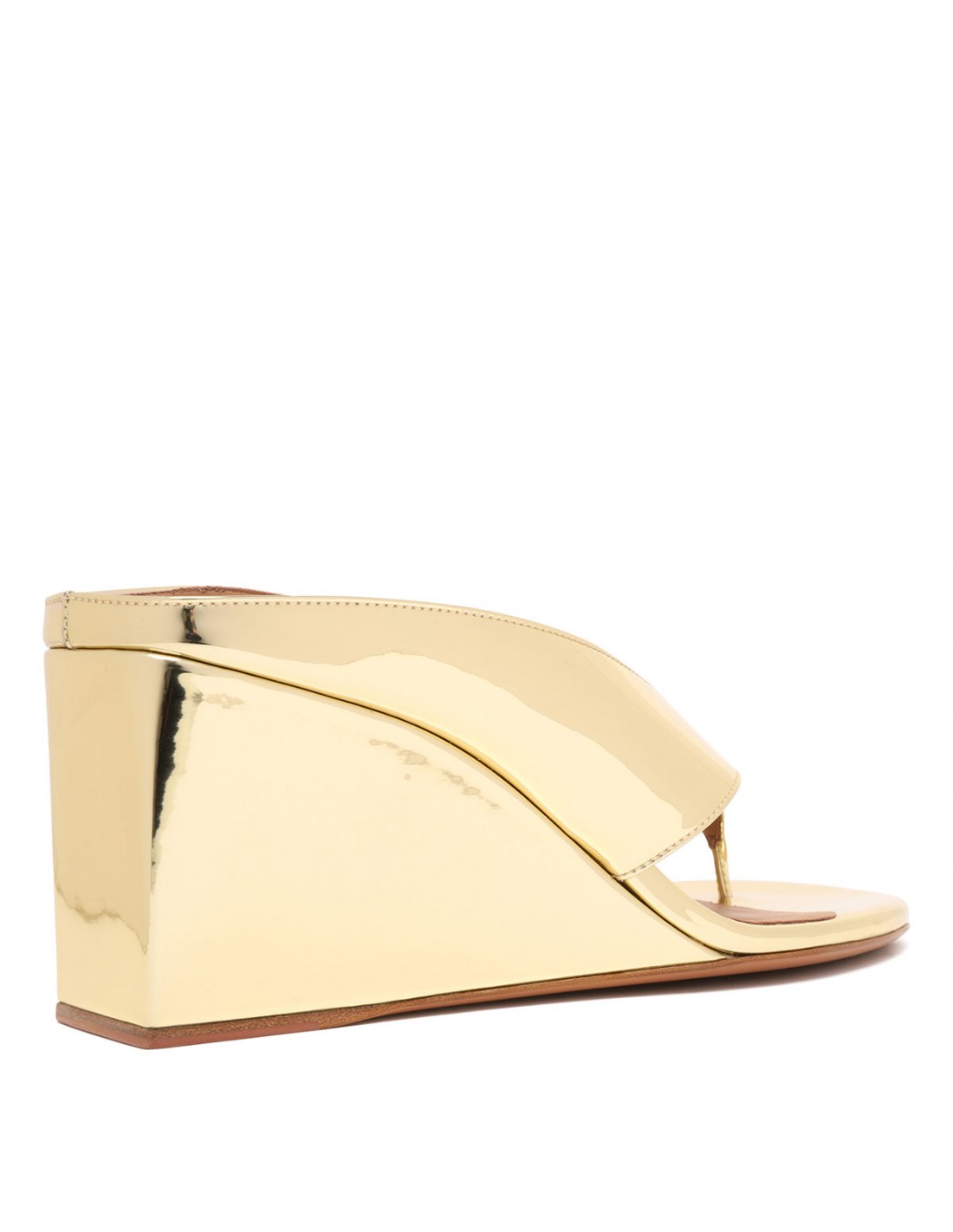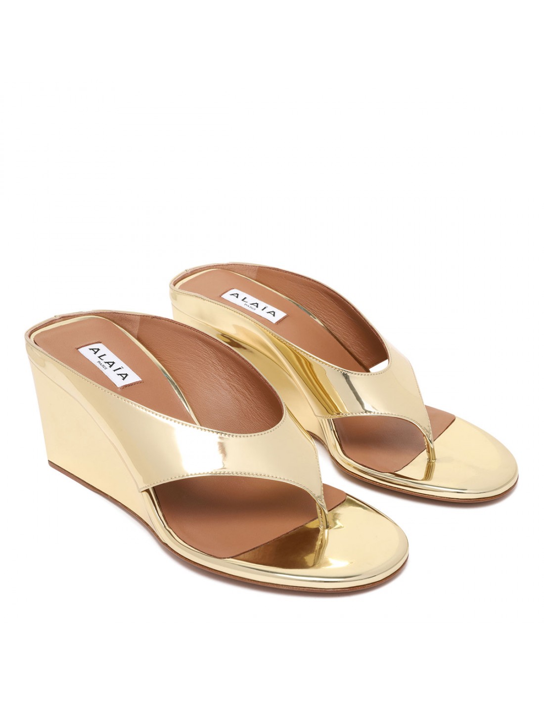Metallic gold leather Cube thong mules from Alaia featuring distinctive cubic wedge, round open toe, leather insole and sole.