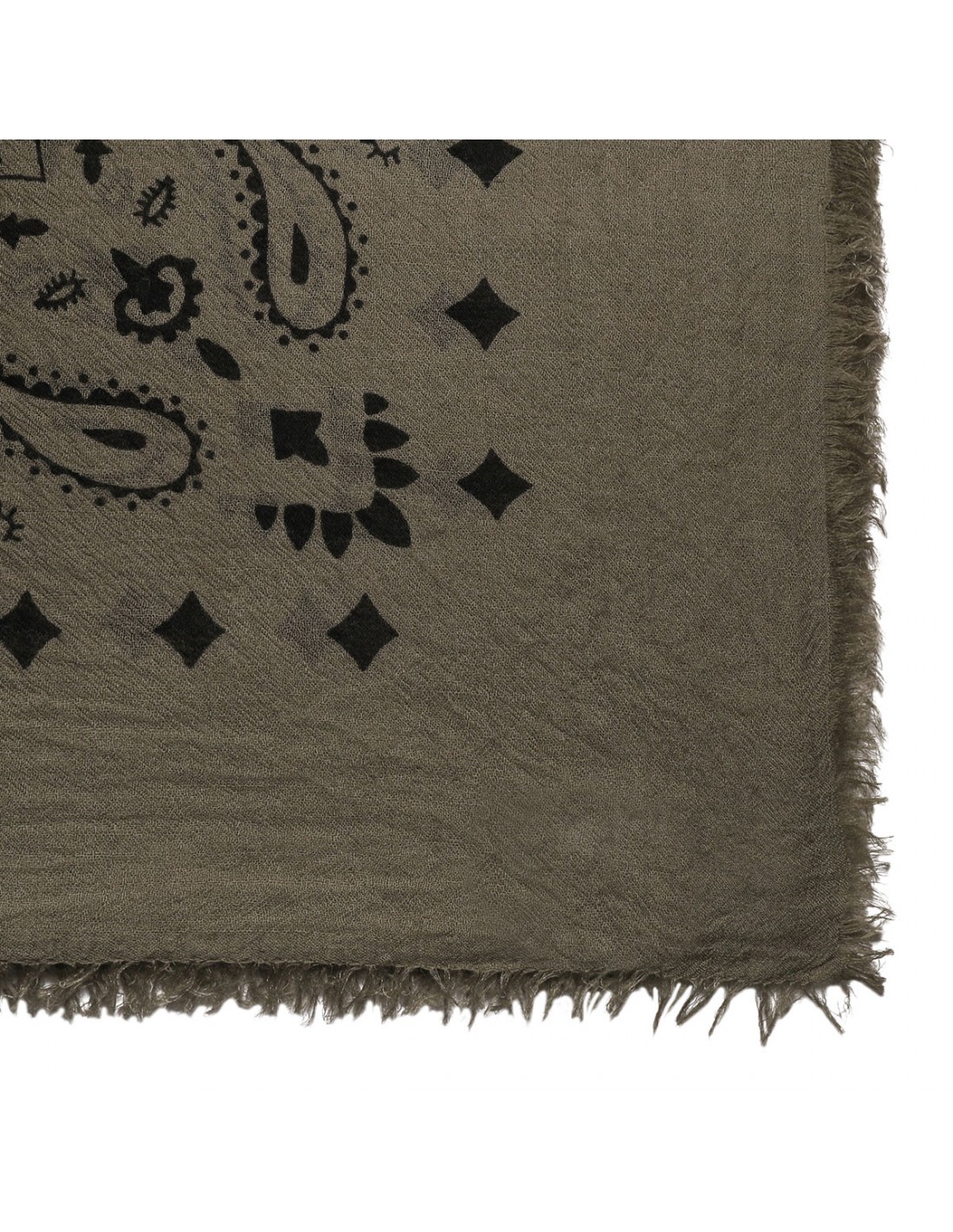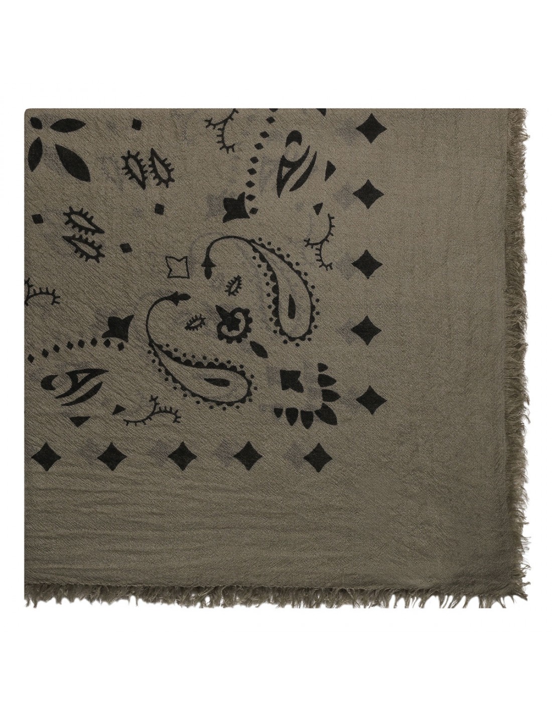 Khaki cashmere Effy large scarf from Kujten featuring bandana motif and fringed edges.