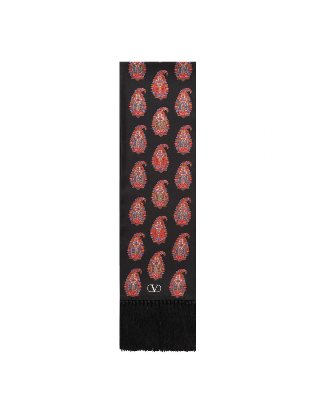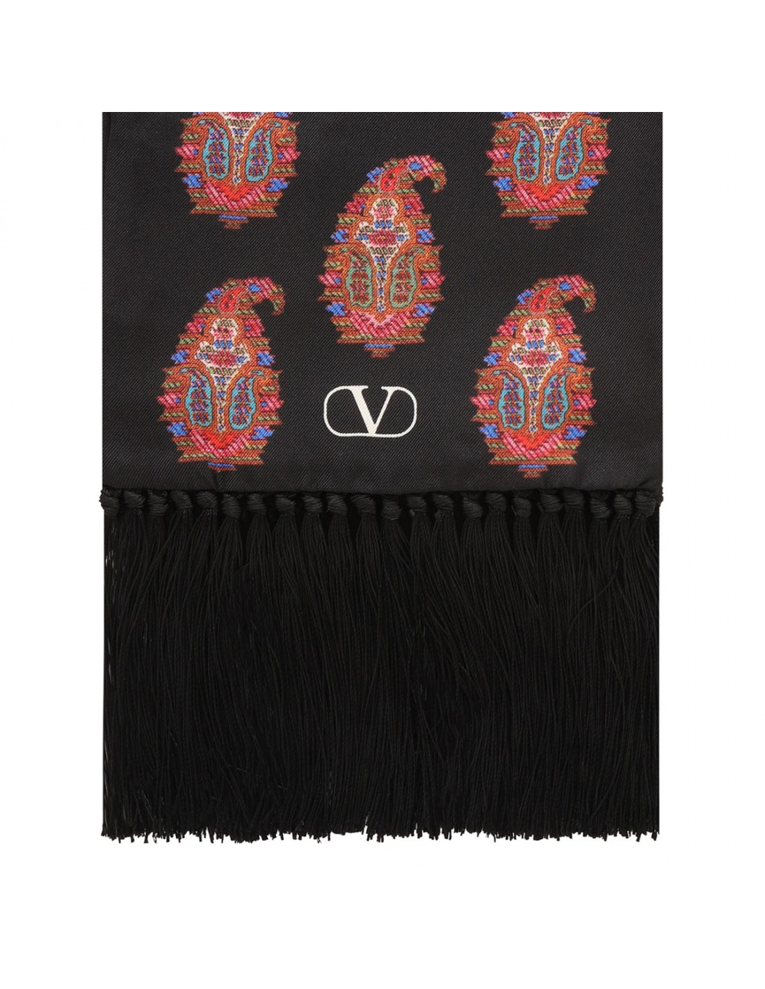 Black silk scarf from Valentino Garavani featuring paisley jacquard motif, Vlogo signature, fringed trims.