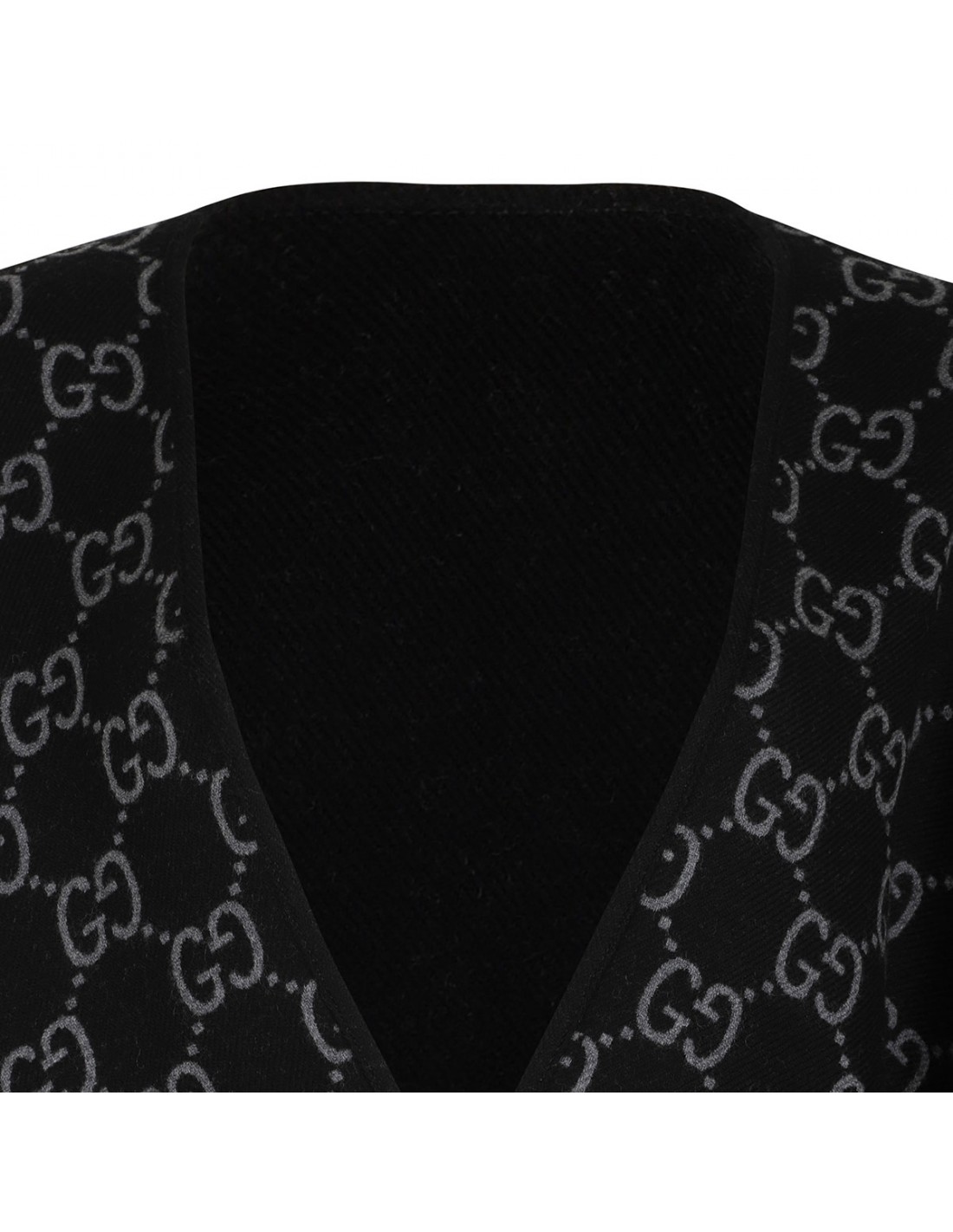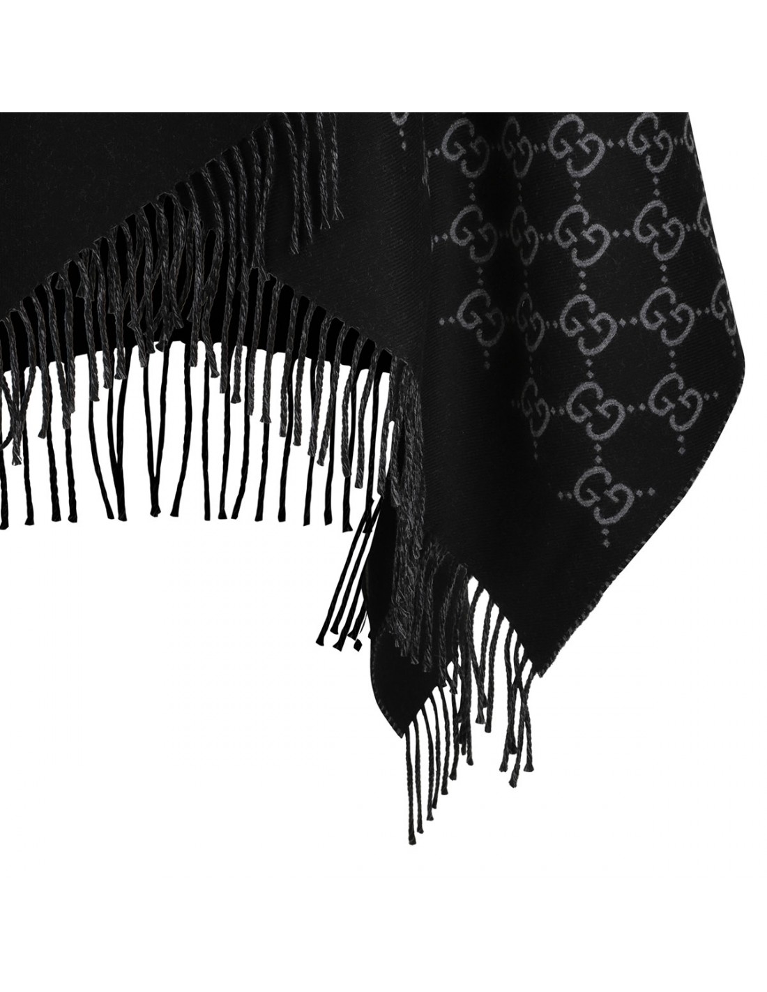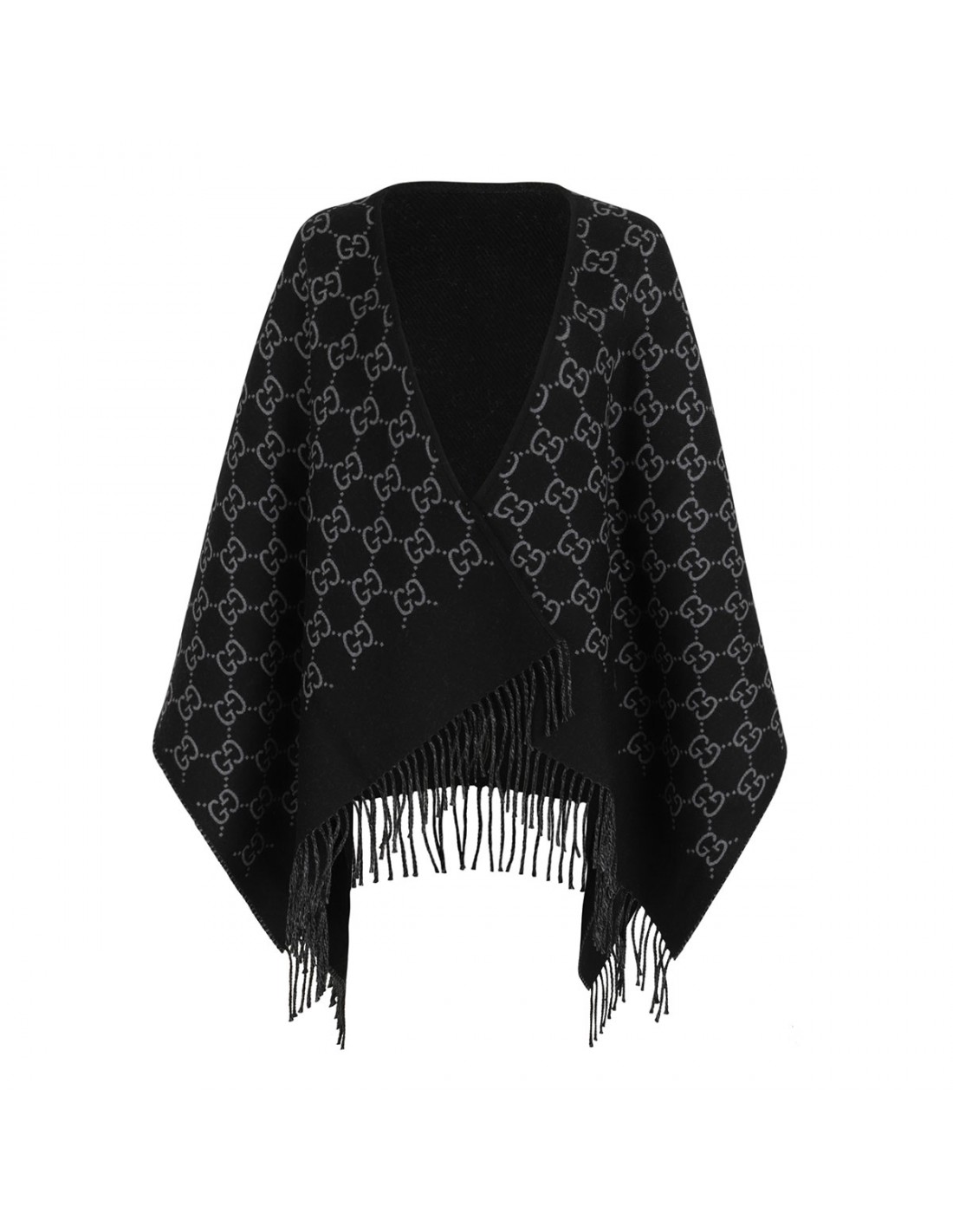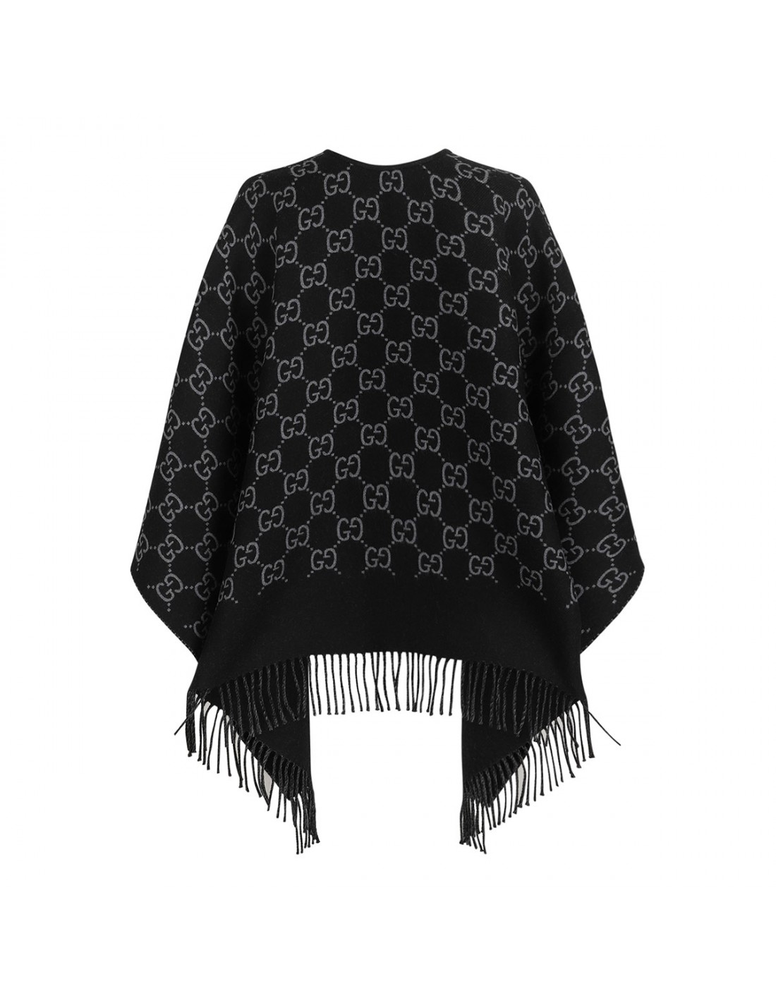 Black and light gray wool cape from Gucci featuring GG jacquard motif and fringed trim.