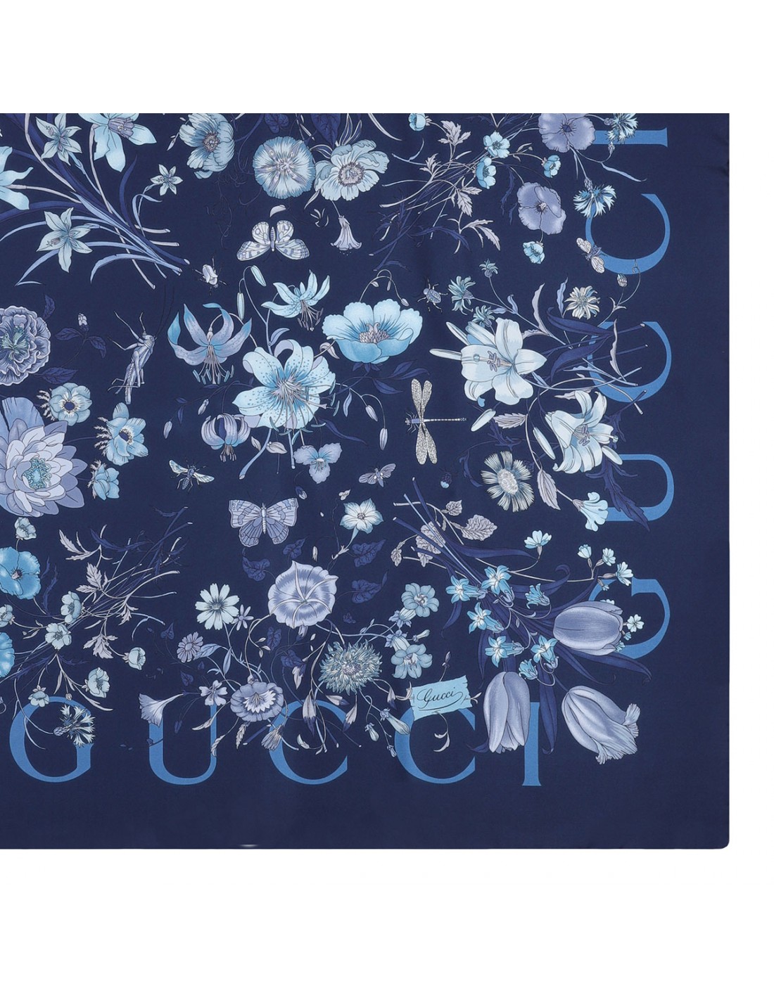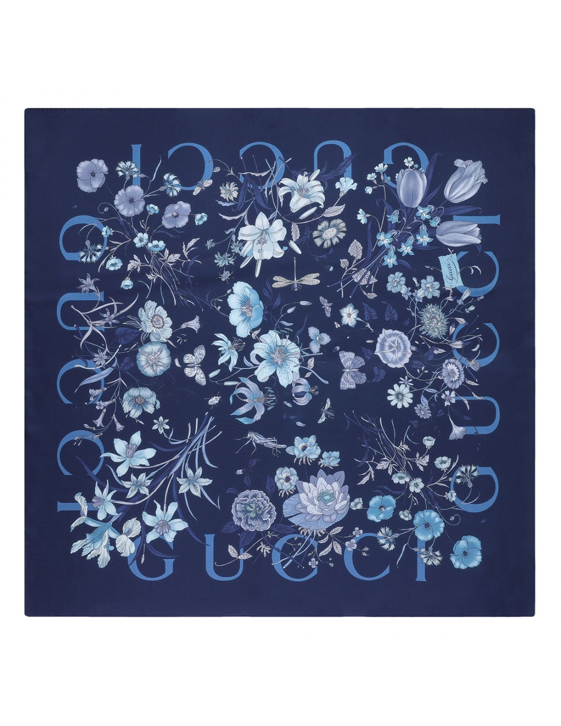 Blue silk twill carré from Gucci featuring allover archival Flora motif, logo print.