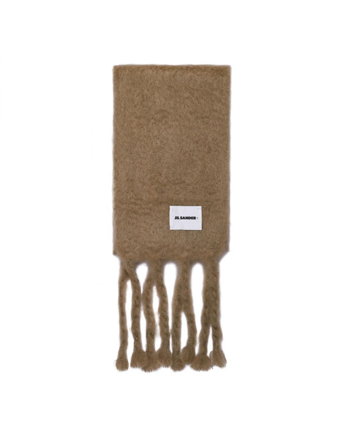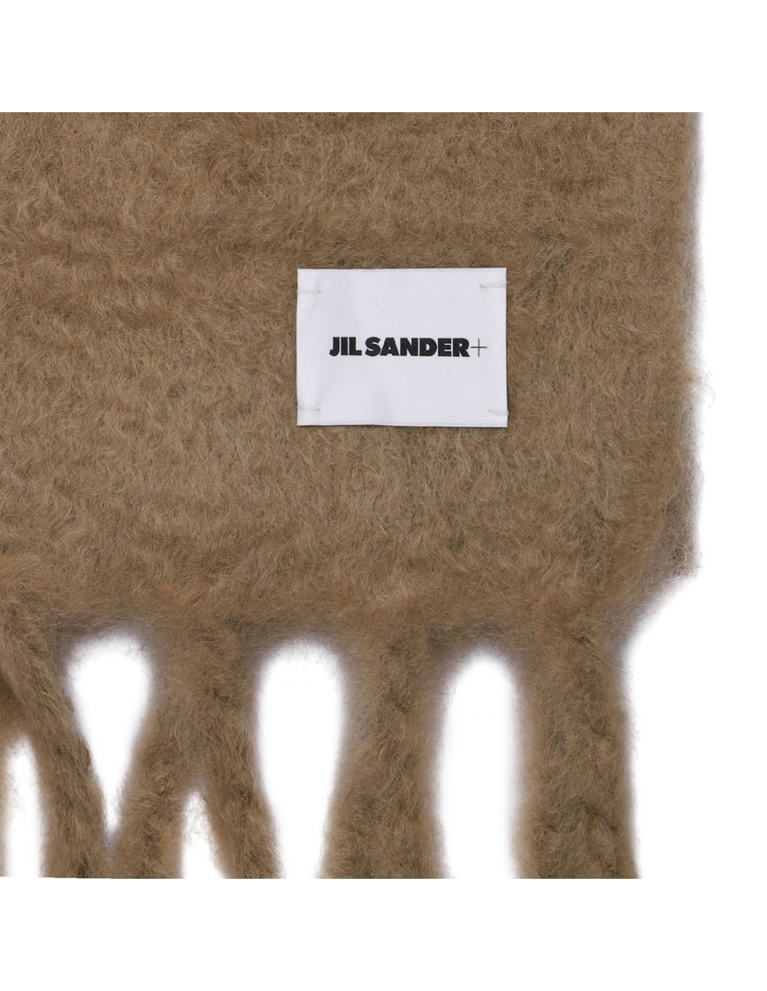Beige handknit wool and mohair blend long scarf from Jil Sander featuring fringed hem and logo label stitched at bottom.