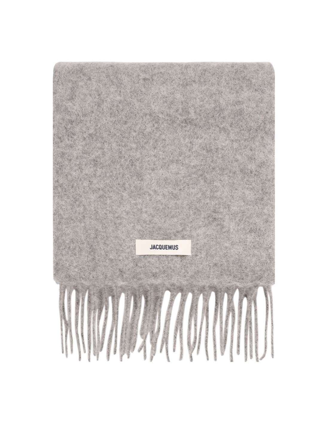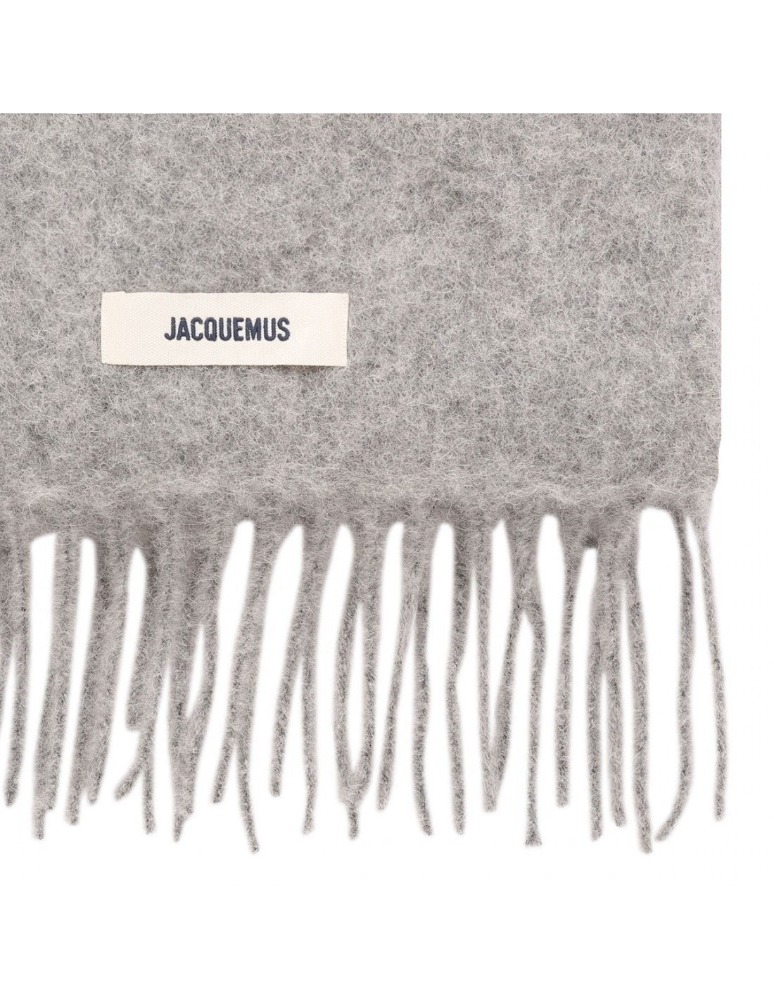 Gray alpaca, mohair and virgin wool blend The Carro long scarf from Jacquemus featuring fringed edge, embroidered grosgrain logo.