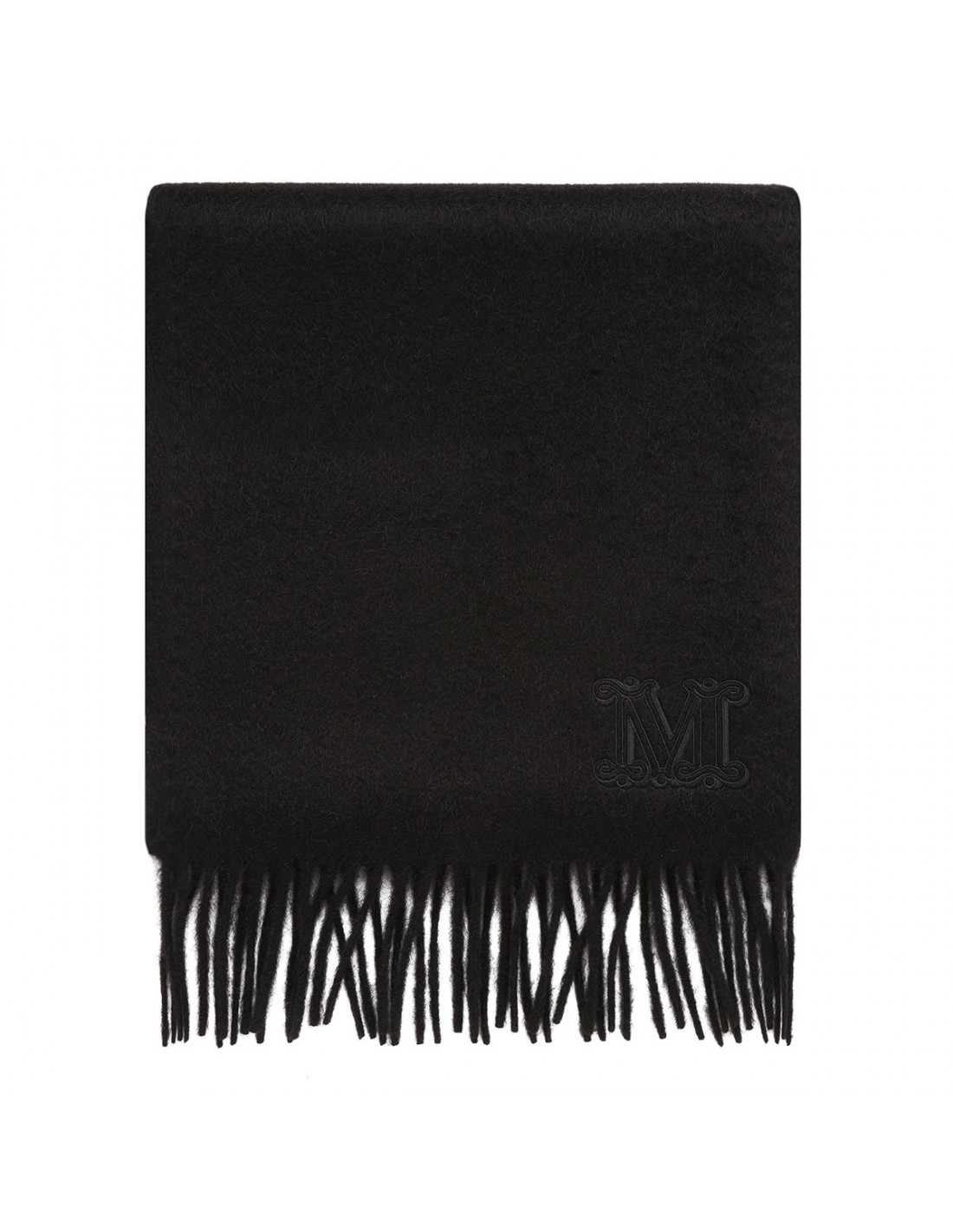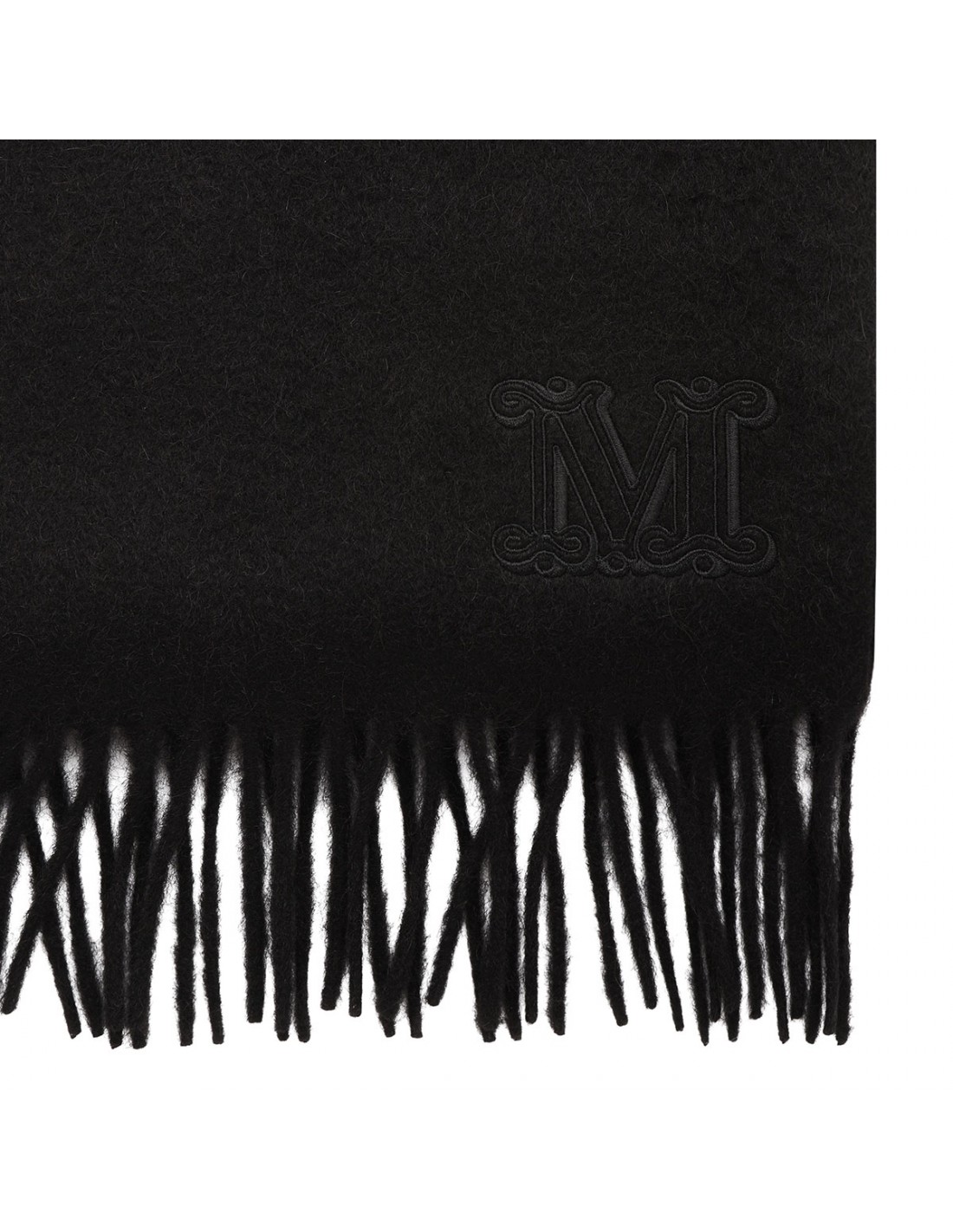 Black camel-wool stole from Max Mara featuring sable-look, M monogram embroidery, hand-stitched detail on the trims, fringed edges.